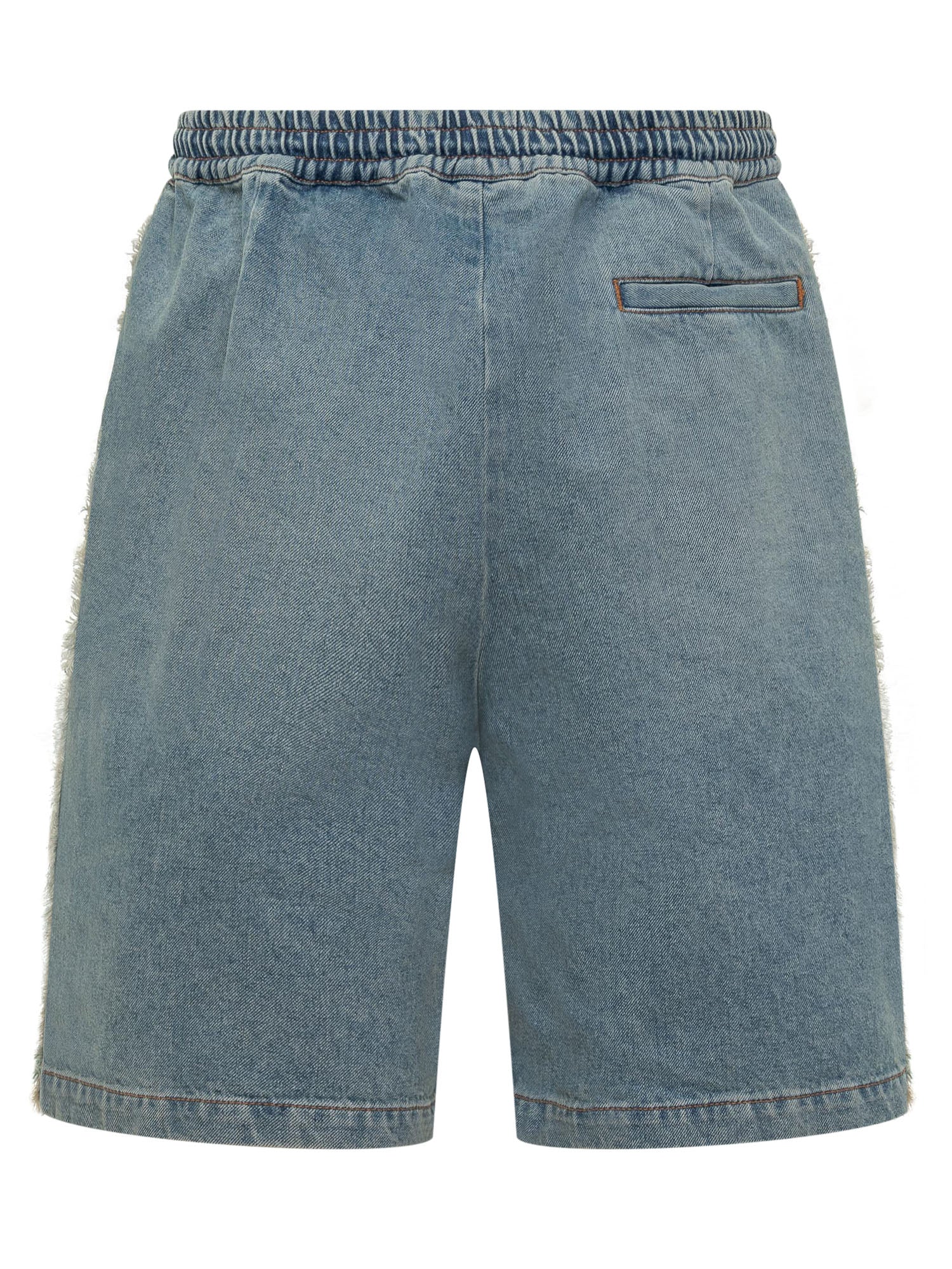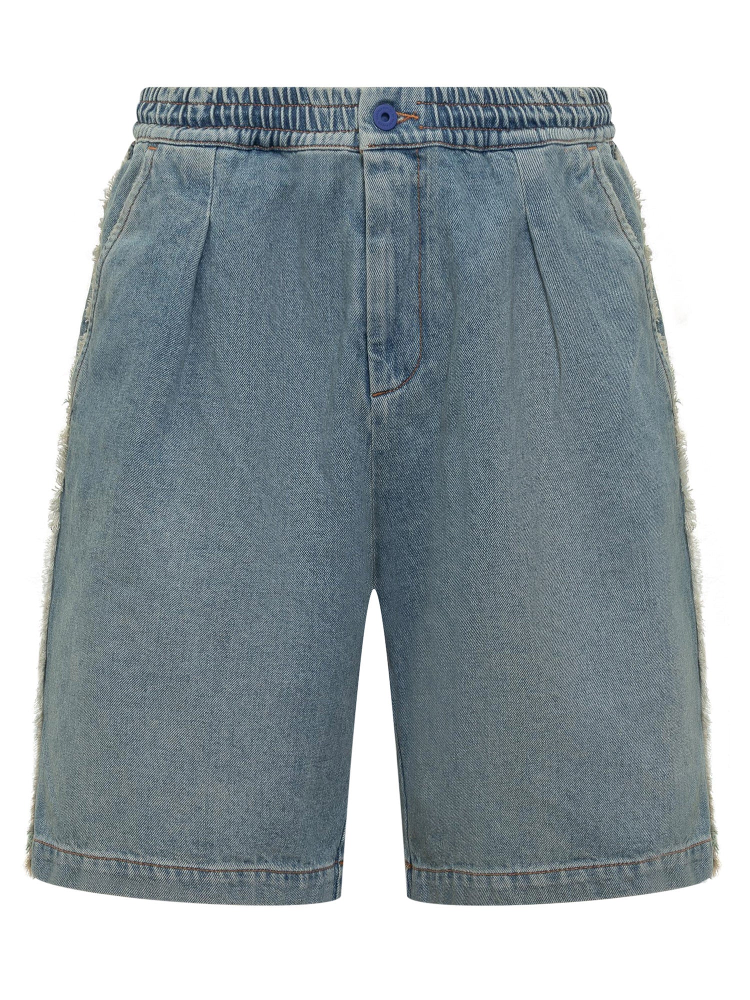 Shorts in denim. Chiusura con bottone e zip. Elastico in vita. tre tasche. Effetto sfrangiato sui lati con logo.