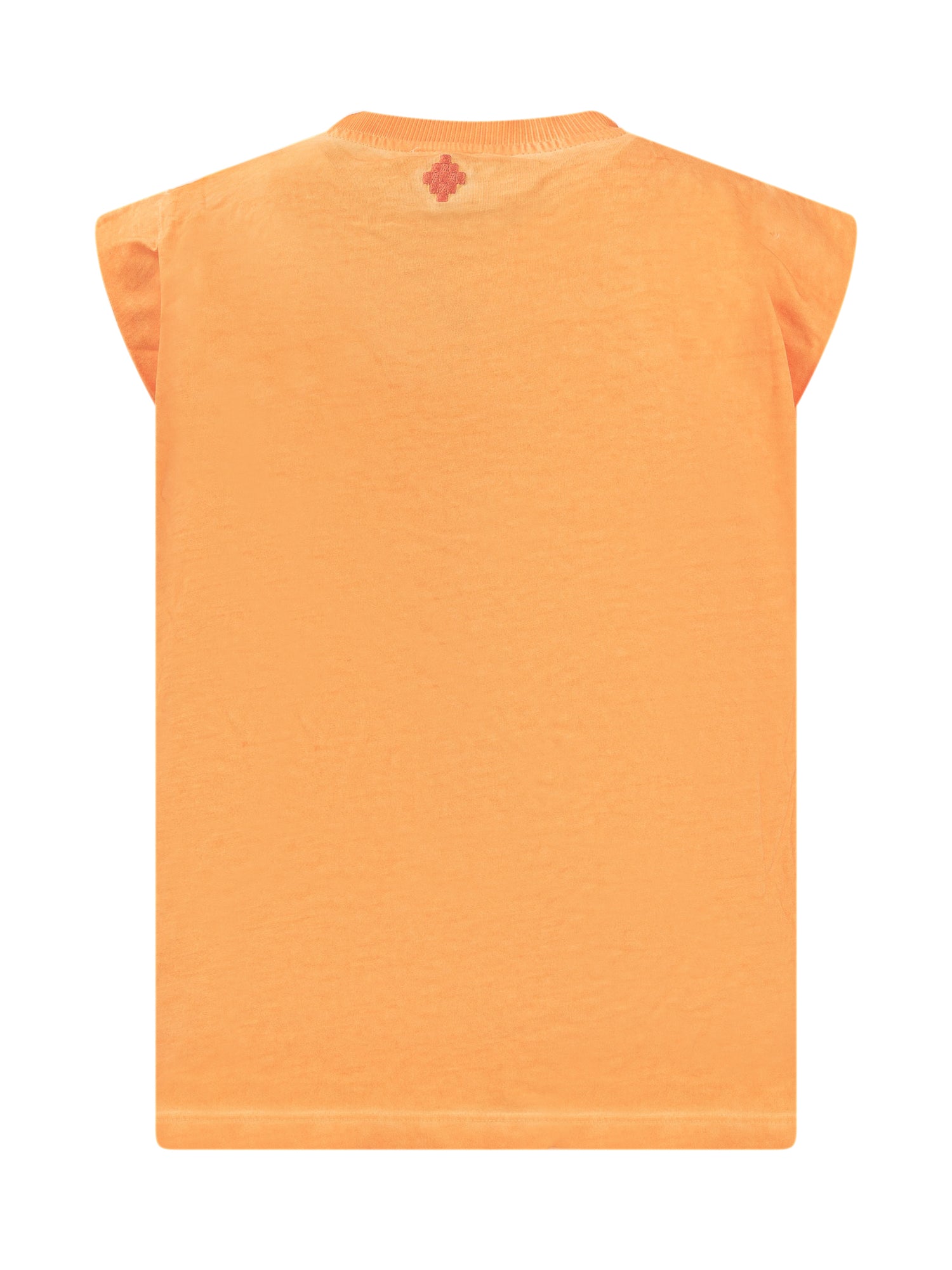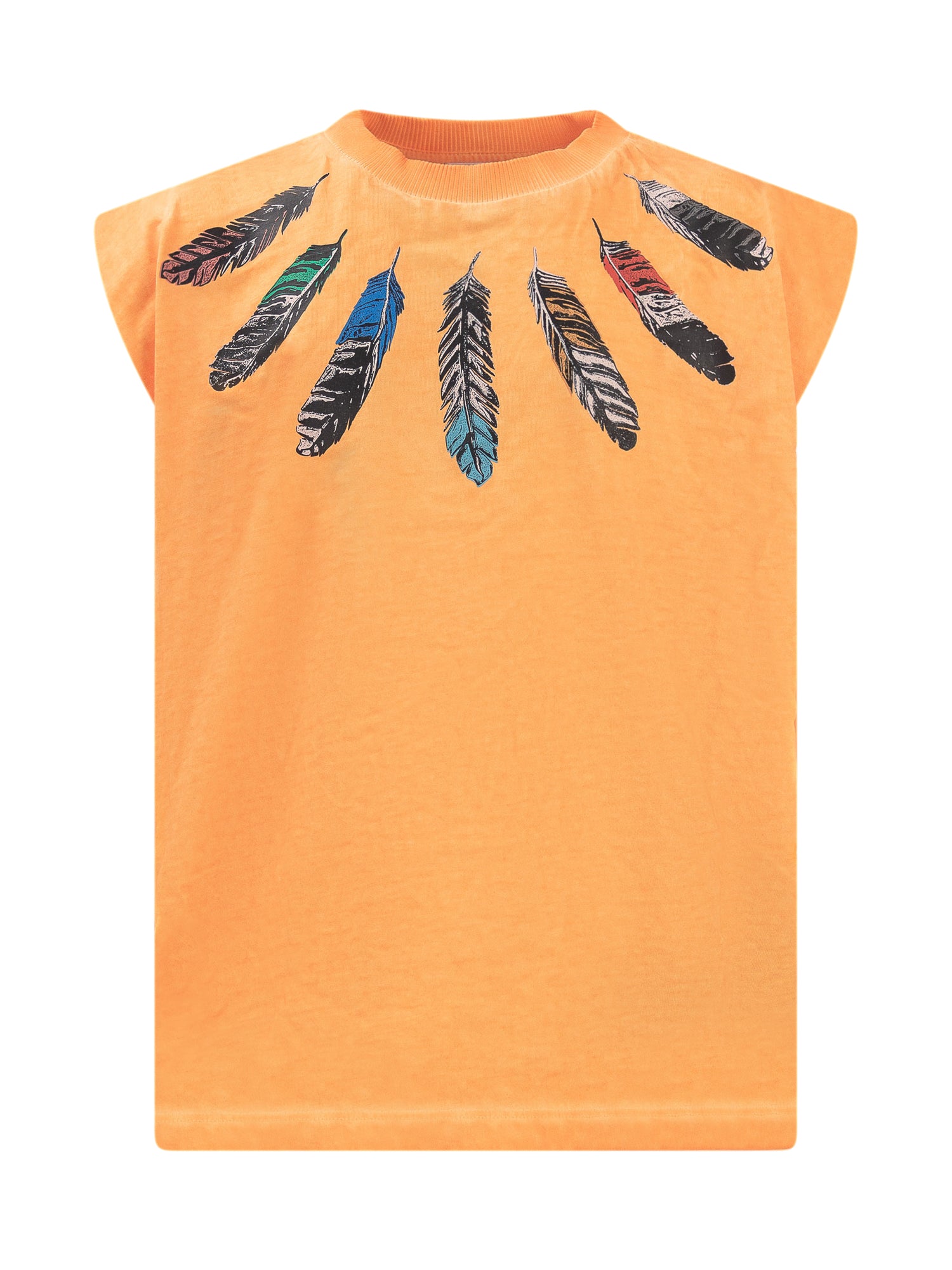 Canotta senza maniche. Girocollo a costine. Stampa piume sul collo. Logo ricamato sul retro.