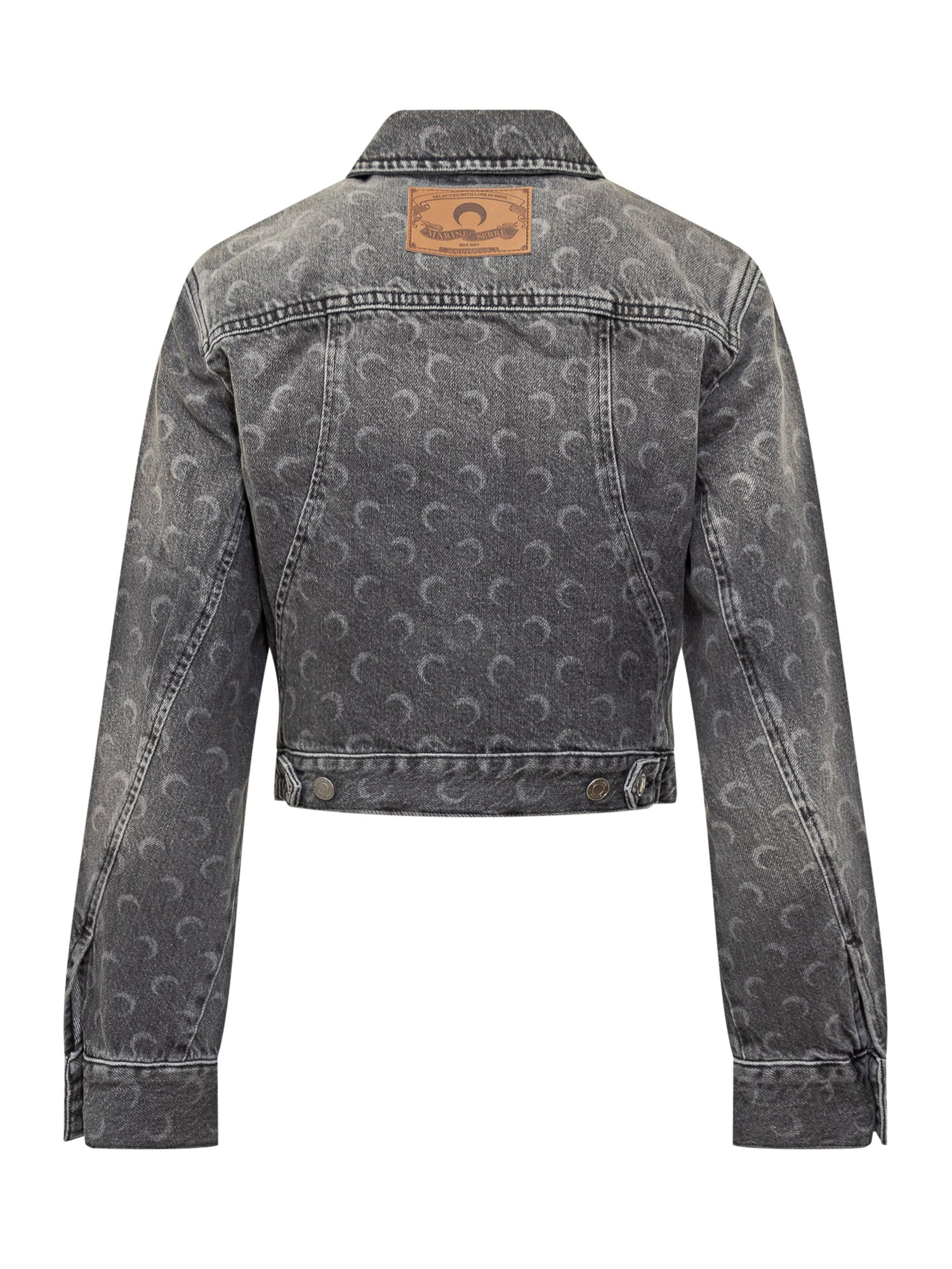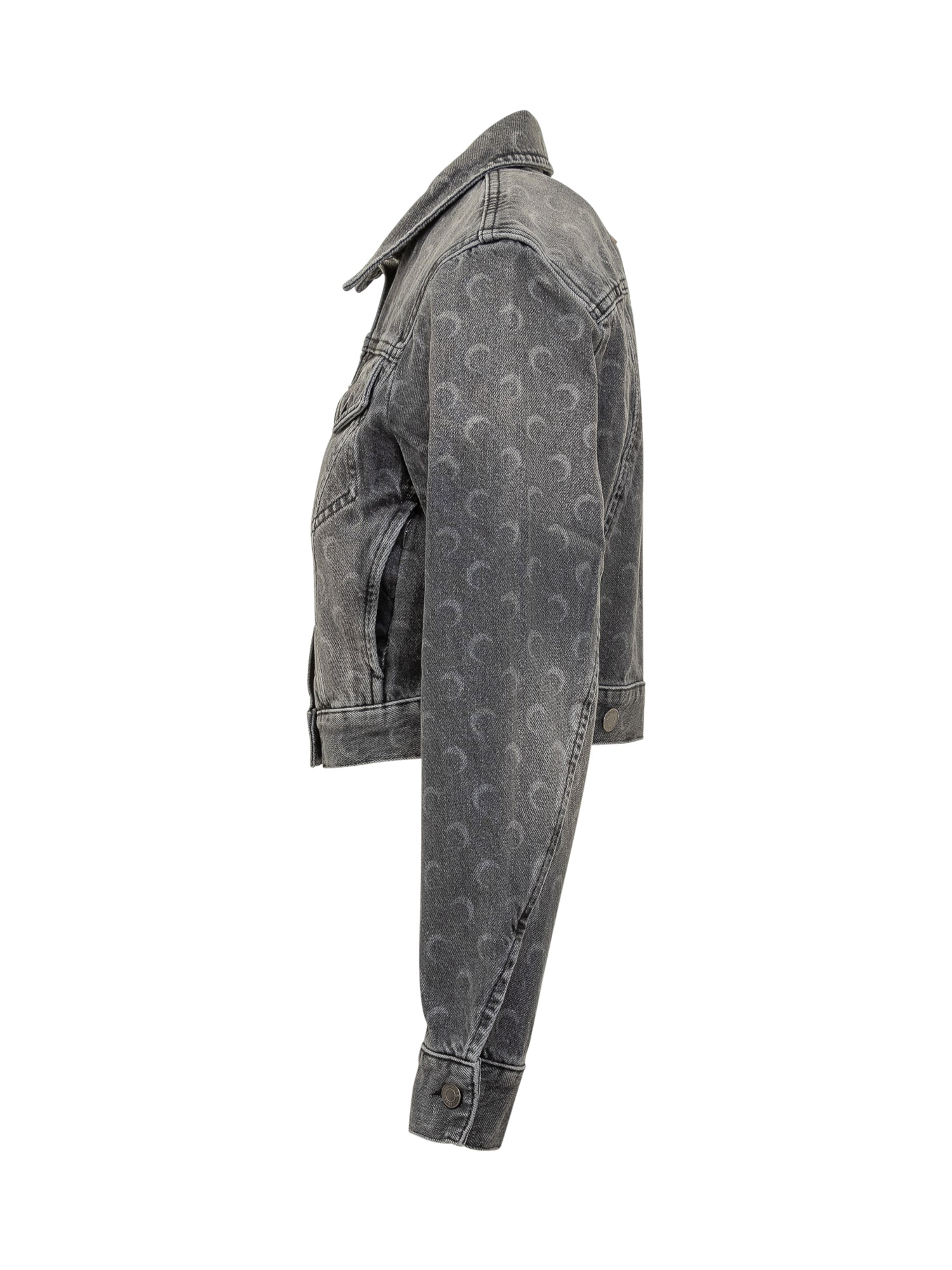 Giacca Marine Serre in denim grigio con stampa all-over a mezzalune. Modello corto con tasche sul petto e chiusura con bottoni metallici.