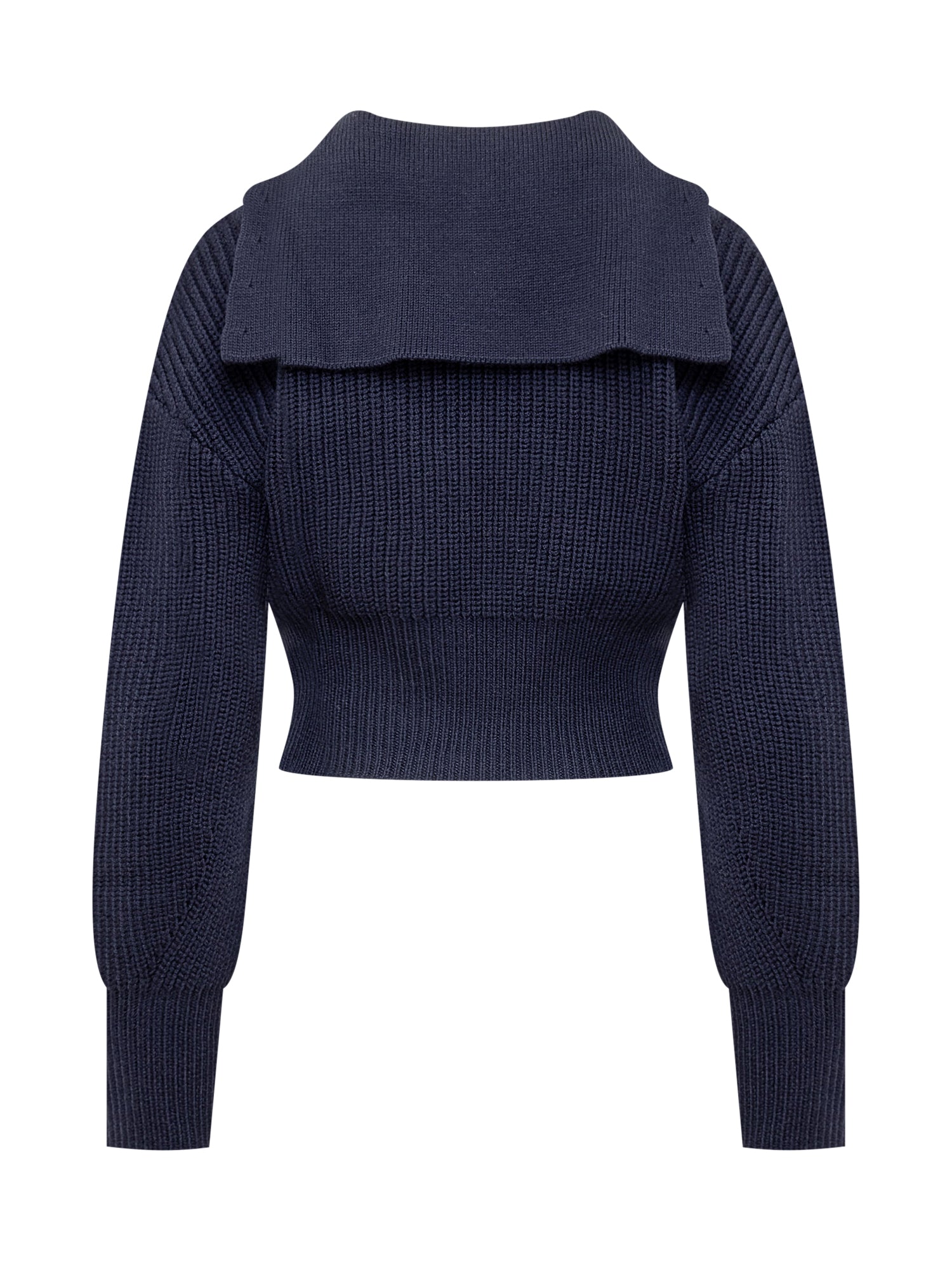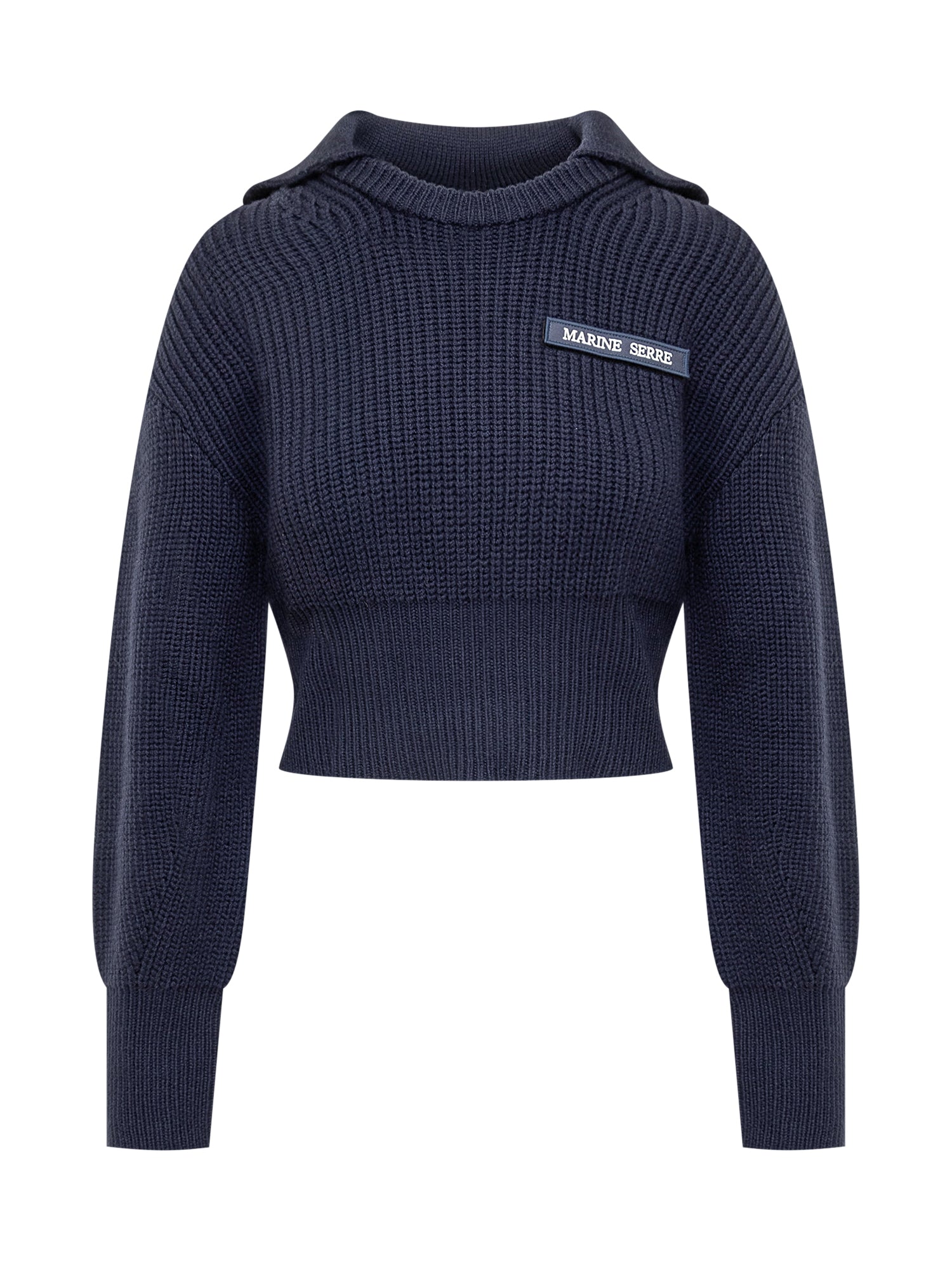 Maglia cropped a maniche lunghe in lana merino. Spalle scollate con maniche oversize. Girocollo con inserto sul retro. Orli a coste. Logo in velcro sul petto.