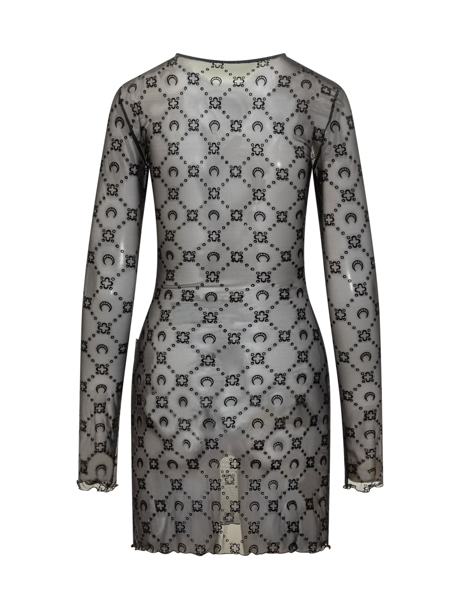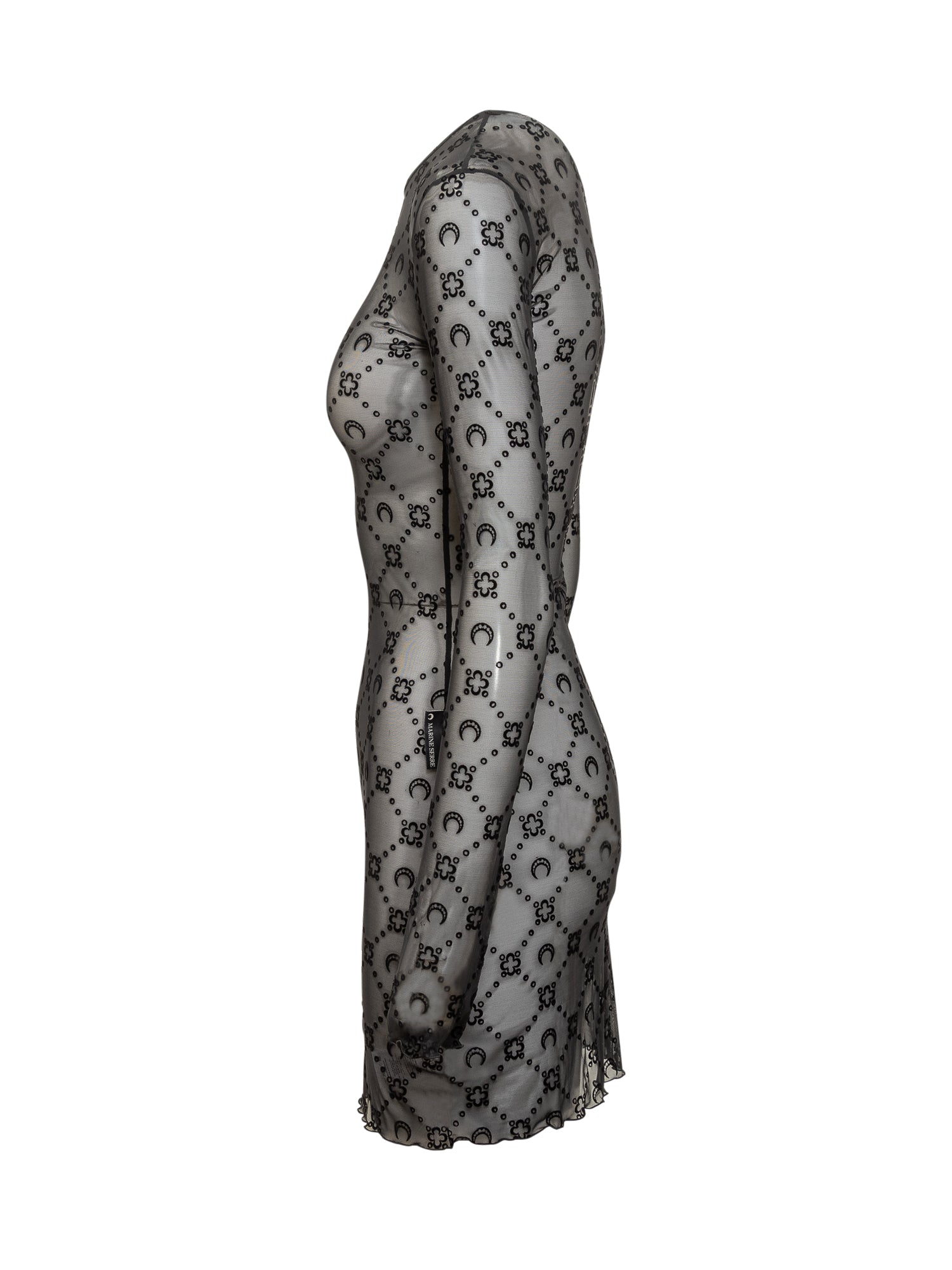 Abito corto Marine Serre in tulle nero semitrasparente con motivo logo all over. Maniche lunghe e linea aderente per un look audace e contemporaneo.