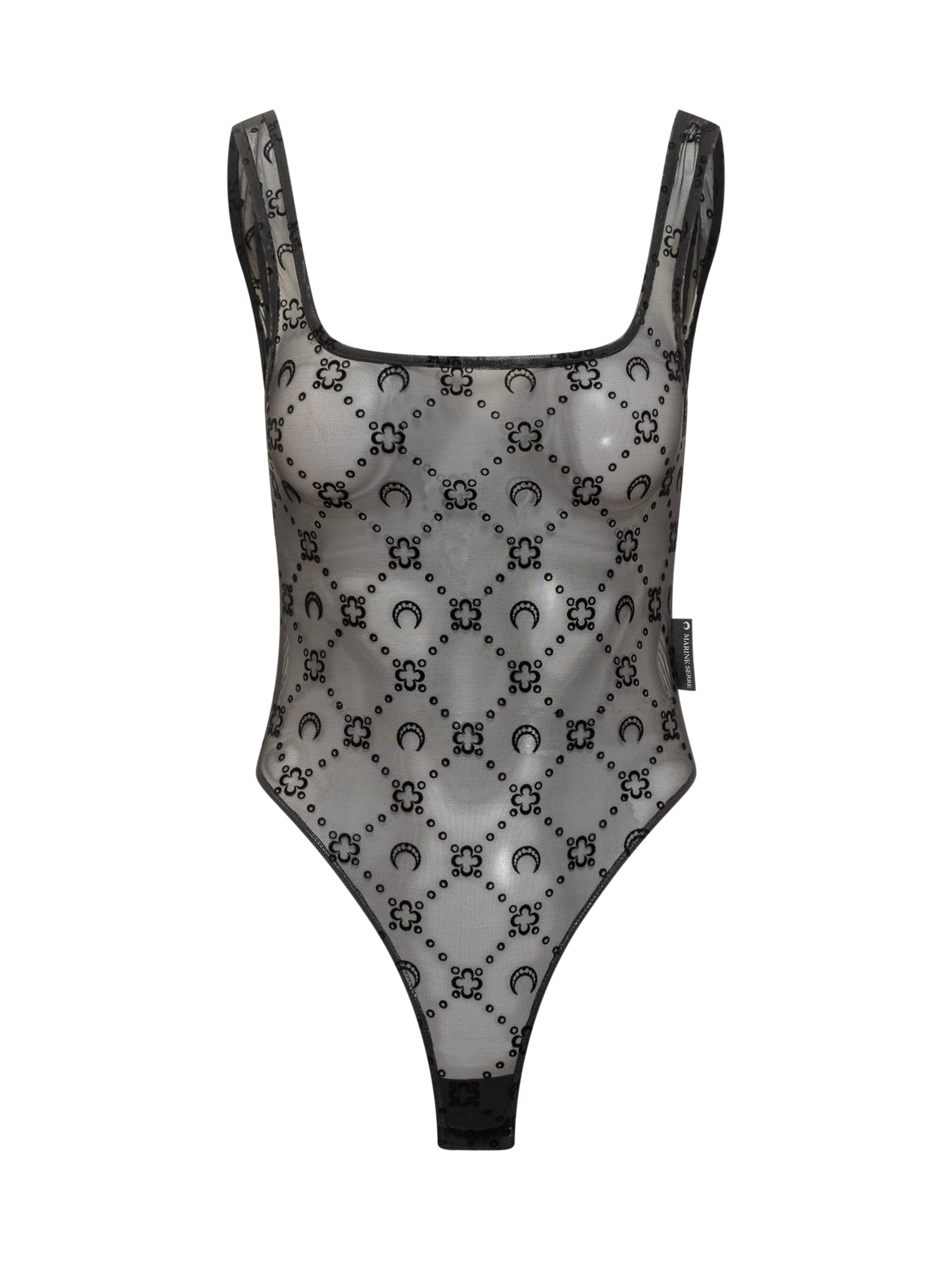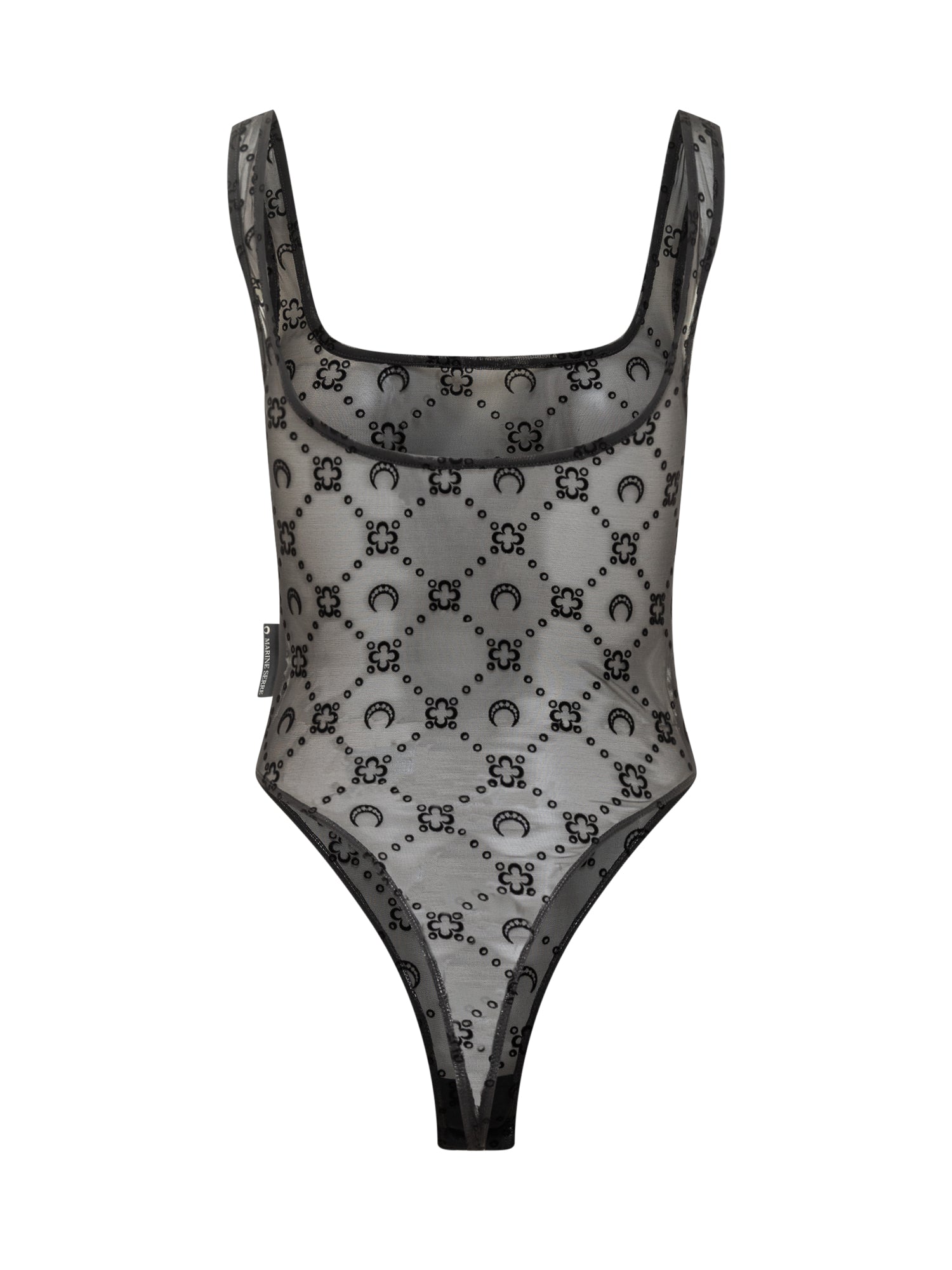 Body Marine Serre in tulle nero trasparente, decorato con ricami floreali e loghi a mezzaluna.