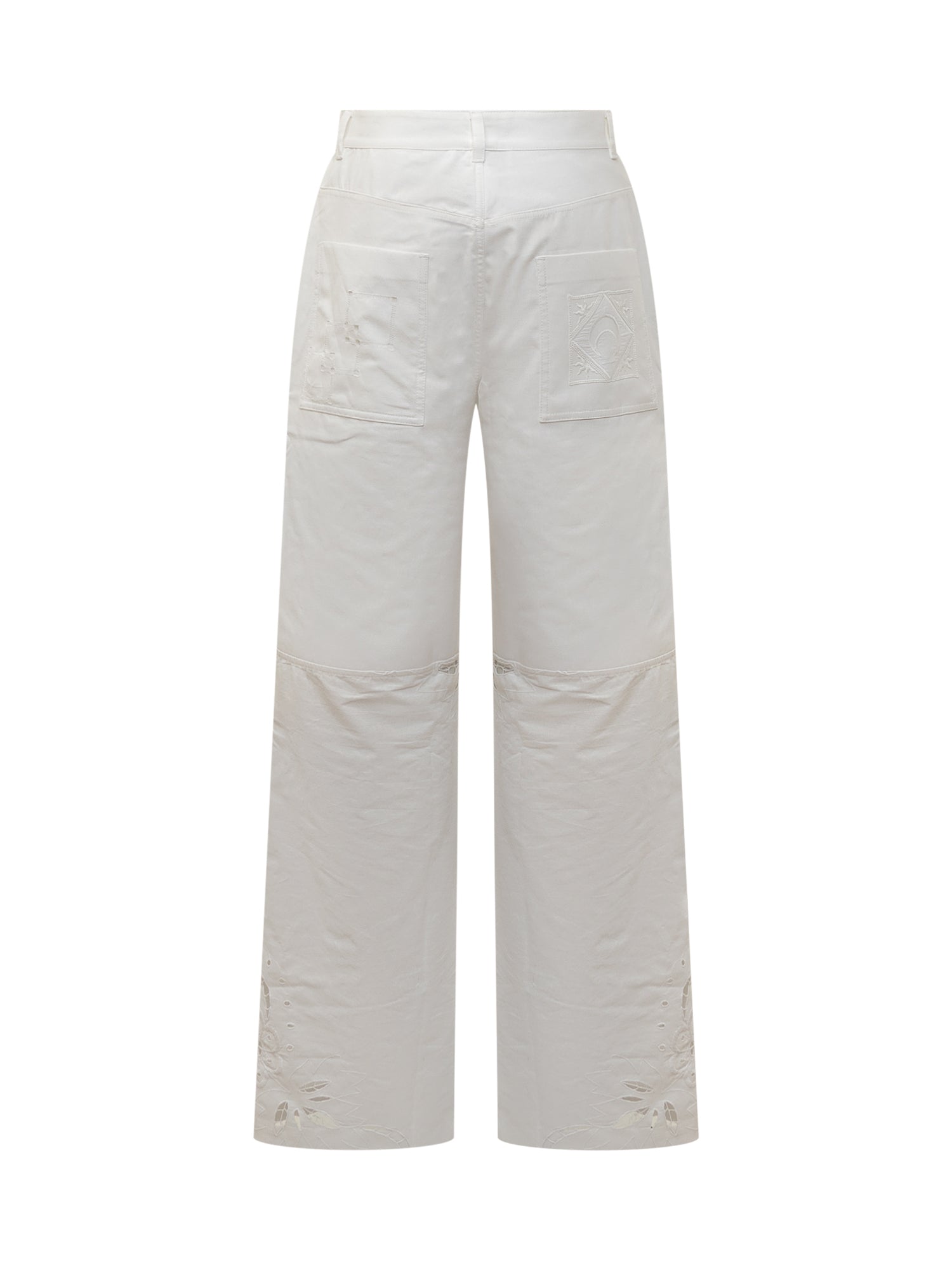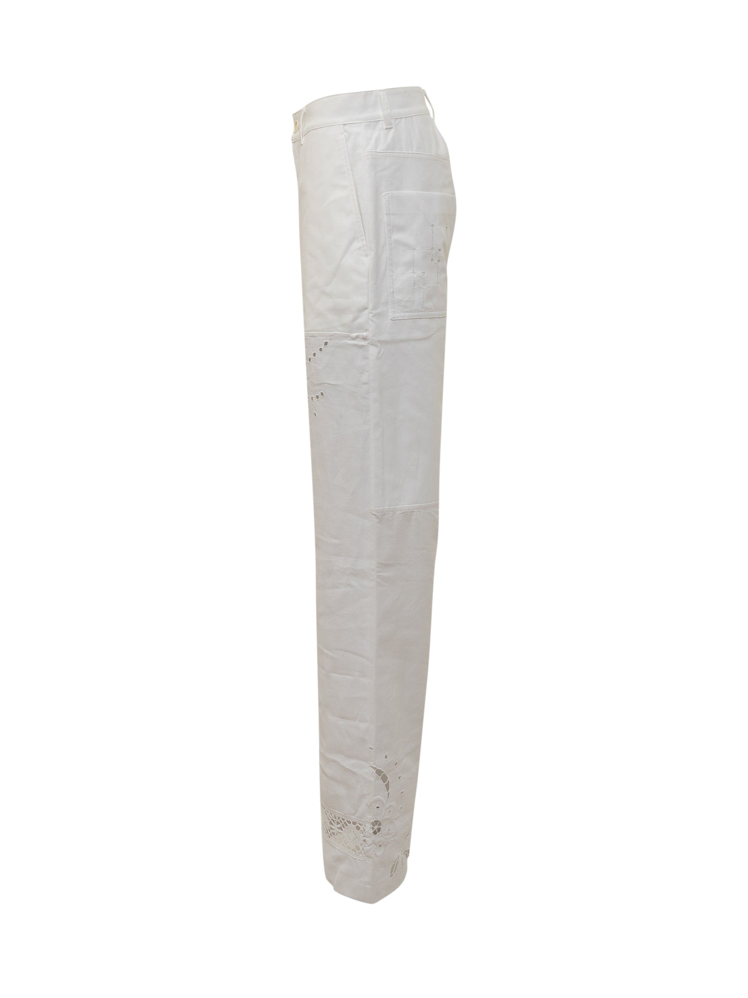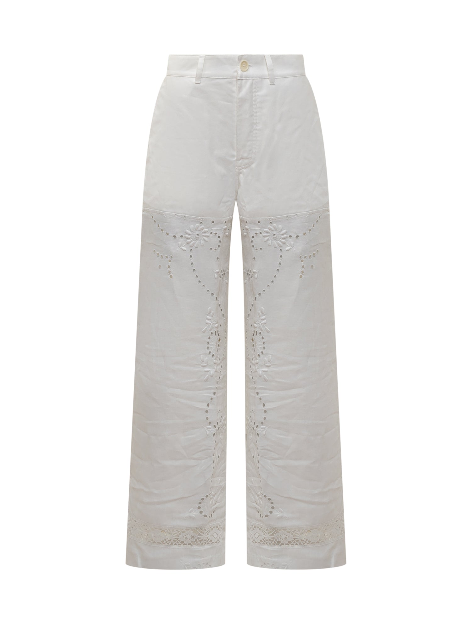 Pantaloni lunghi. Gamba ampia. Dettagli con ricami. Chiusura con bottoni.