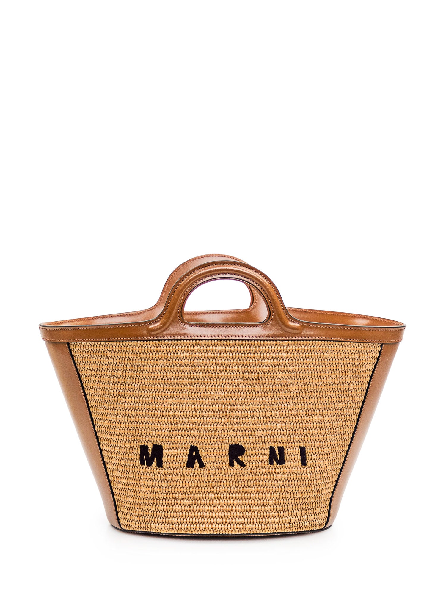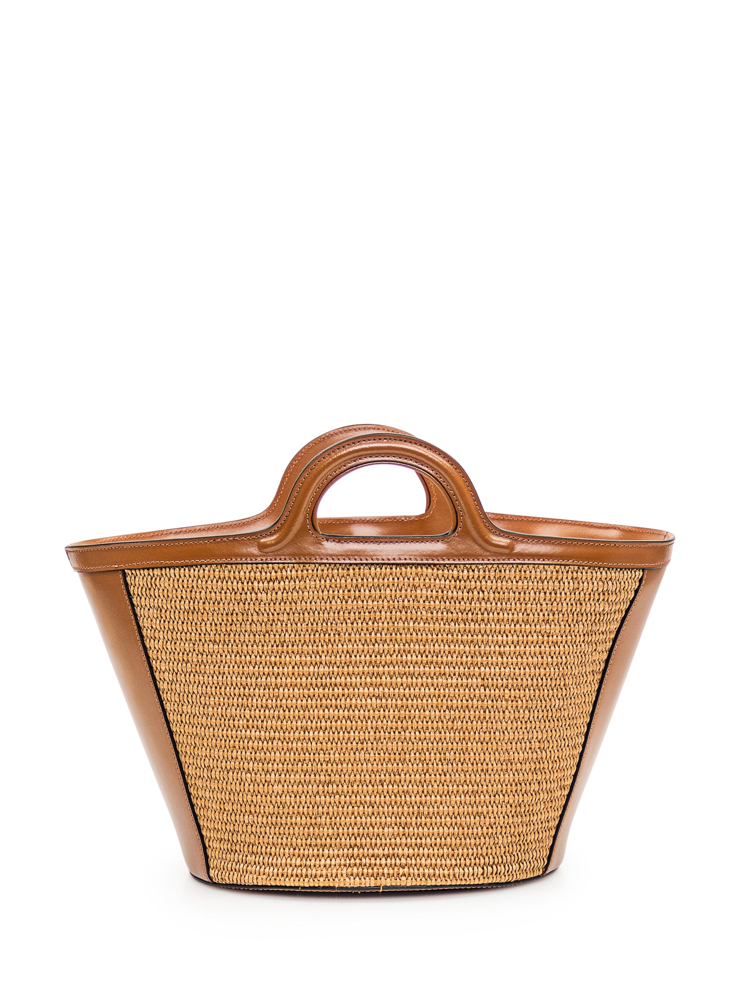 Borsa marrone in rafia. Due manici. Tracolla rimovibile e regolabile. Tasca interna con zip. Logo ricamato sul davanti.