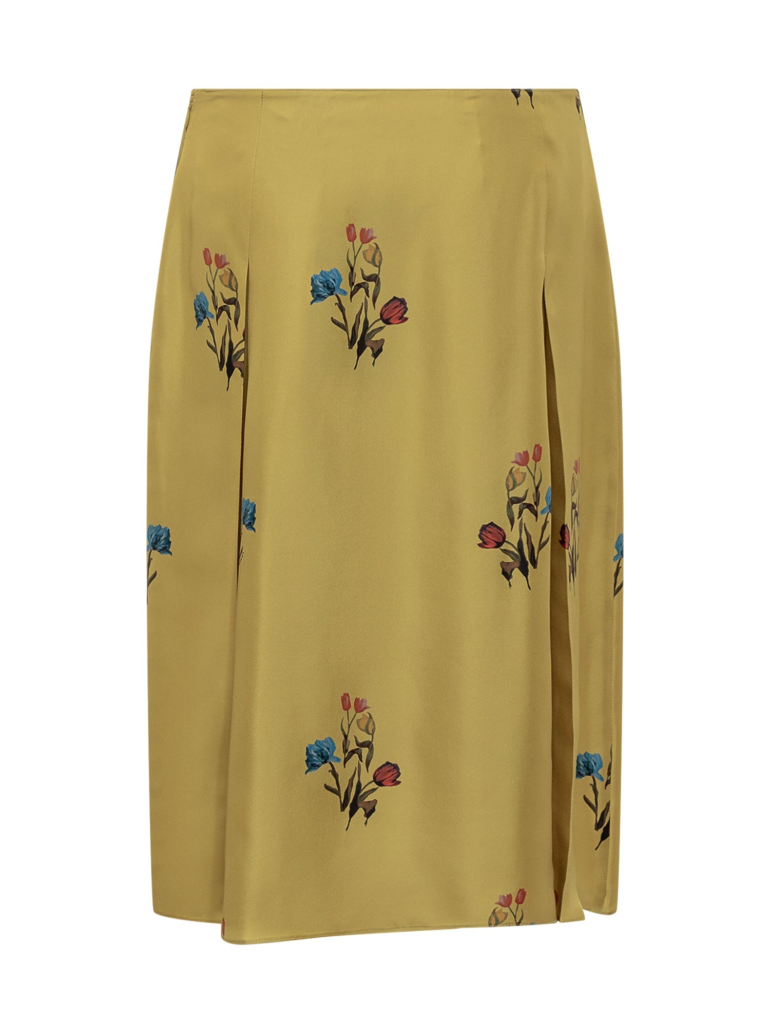 Gonna Marni in tessuto satinato giallo con delicata stampa floreale multicolore. Linea dritta e taglio corto.