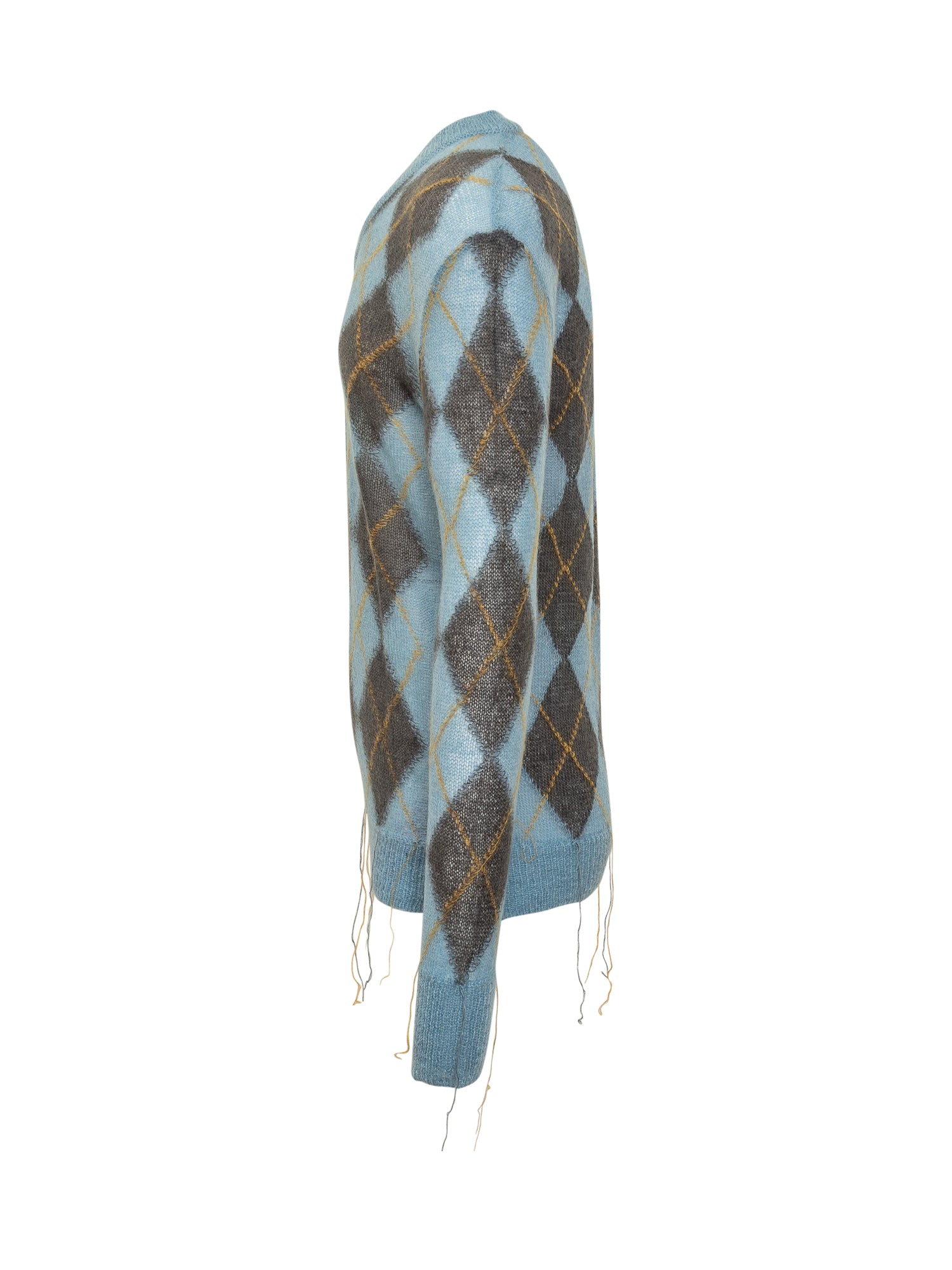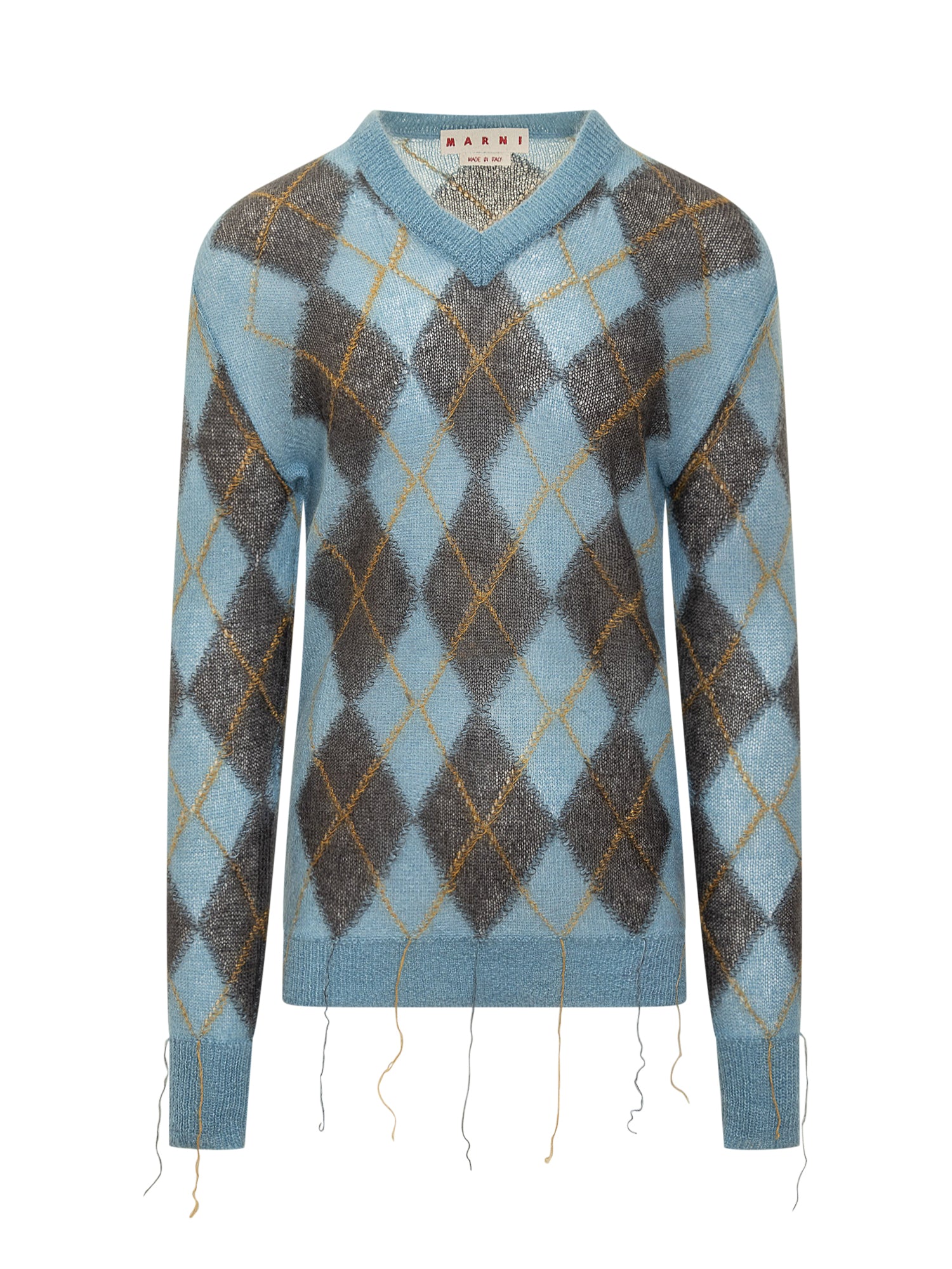 Maglia a maniche lunghe in misto mohair. Scollo a V. Orli a coste. Motivo a rombo bicolore all over. Semitrasparenza.