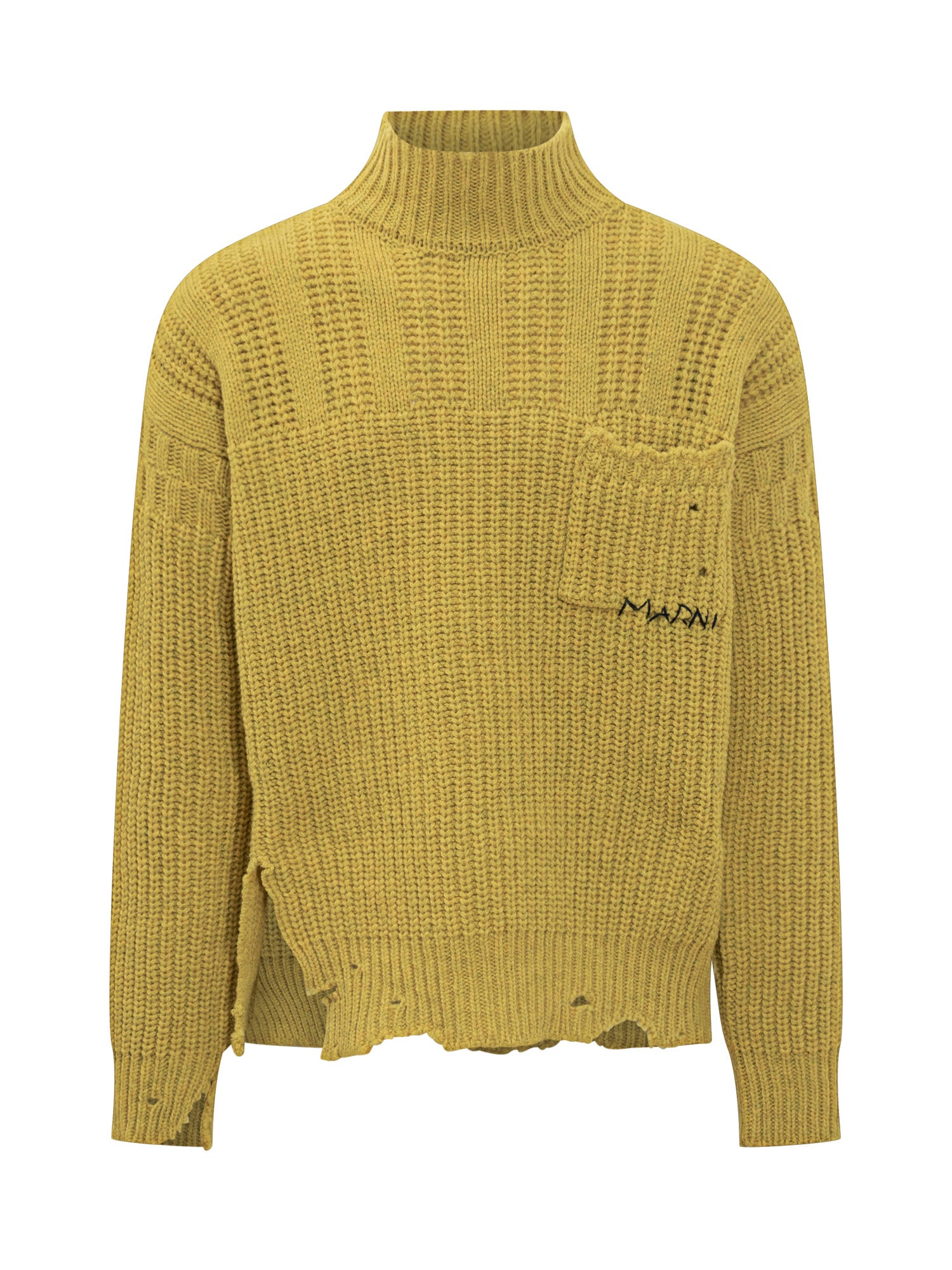 Collo alto. Lavorazione a maglia. Orlo con rotture. Taschino sul petto con logo ricamato.