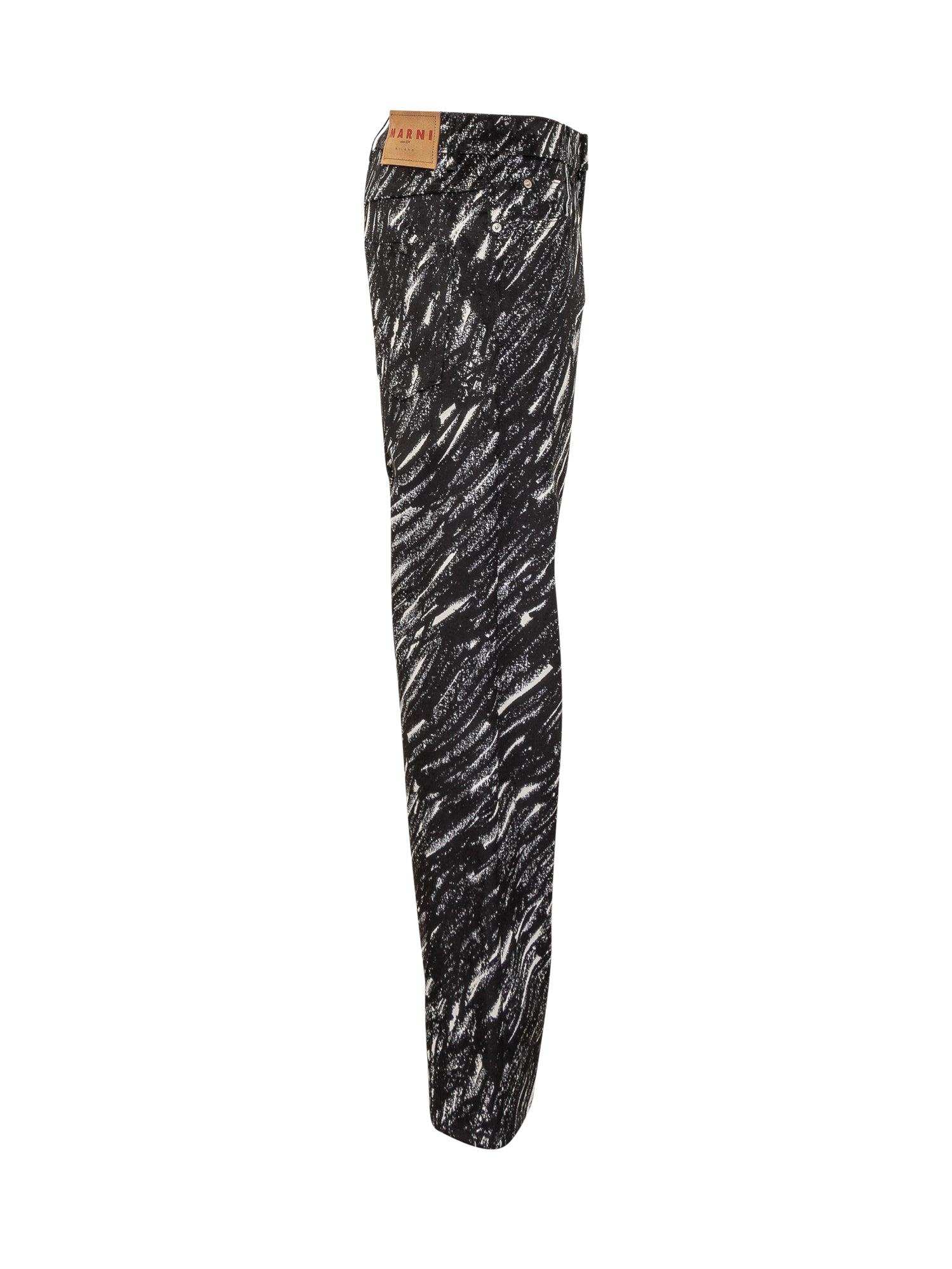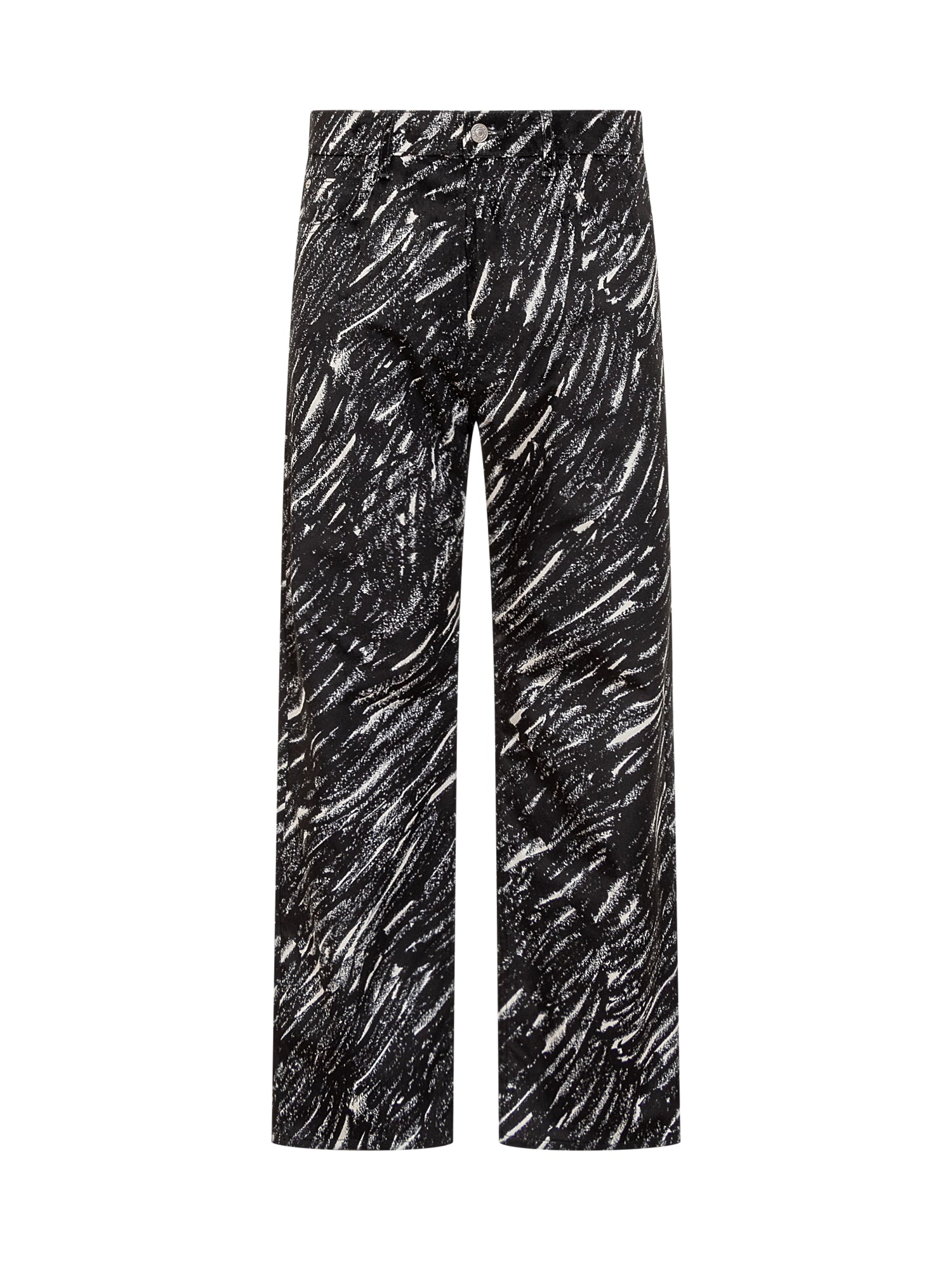 Pantalone wide leg. Chiusura con bottone e zip. Passante per cintura. Cinque tasche. Motivo Fantasia all-over.