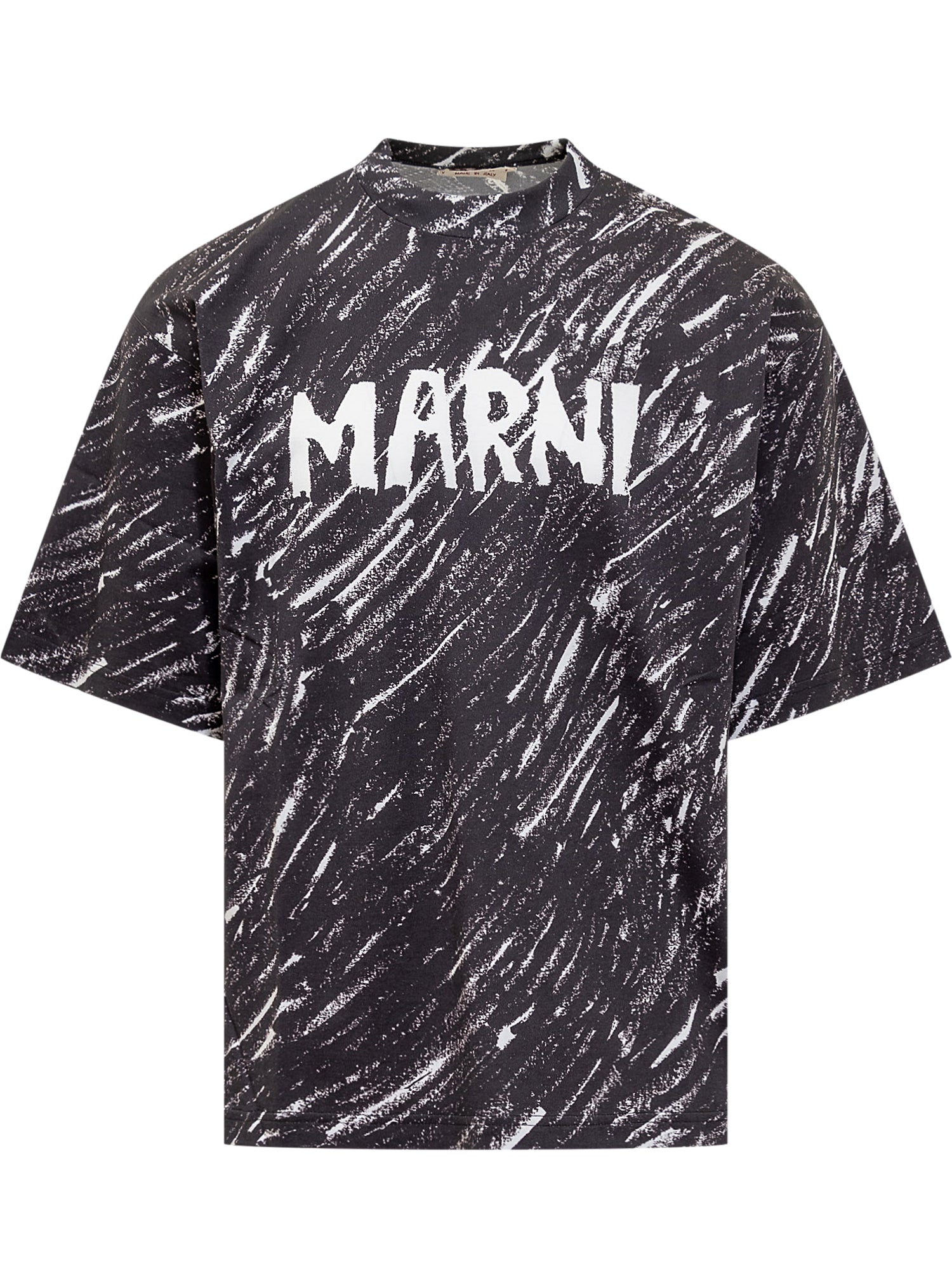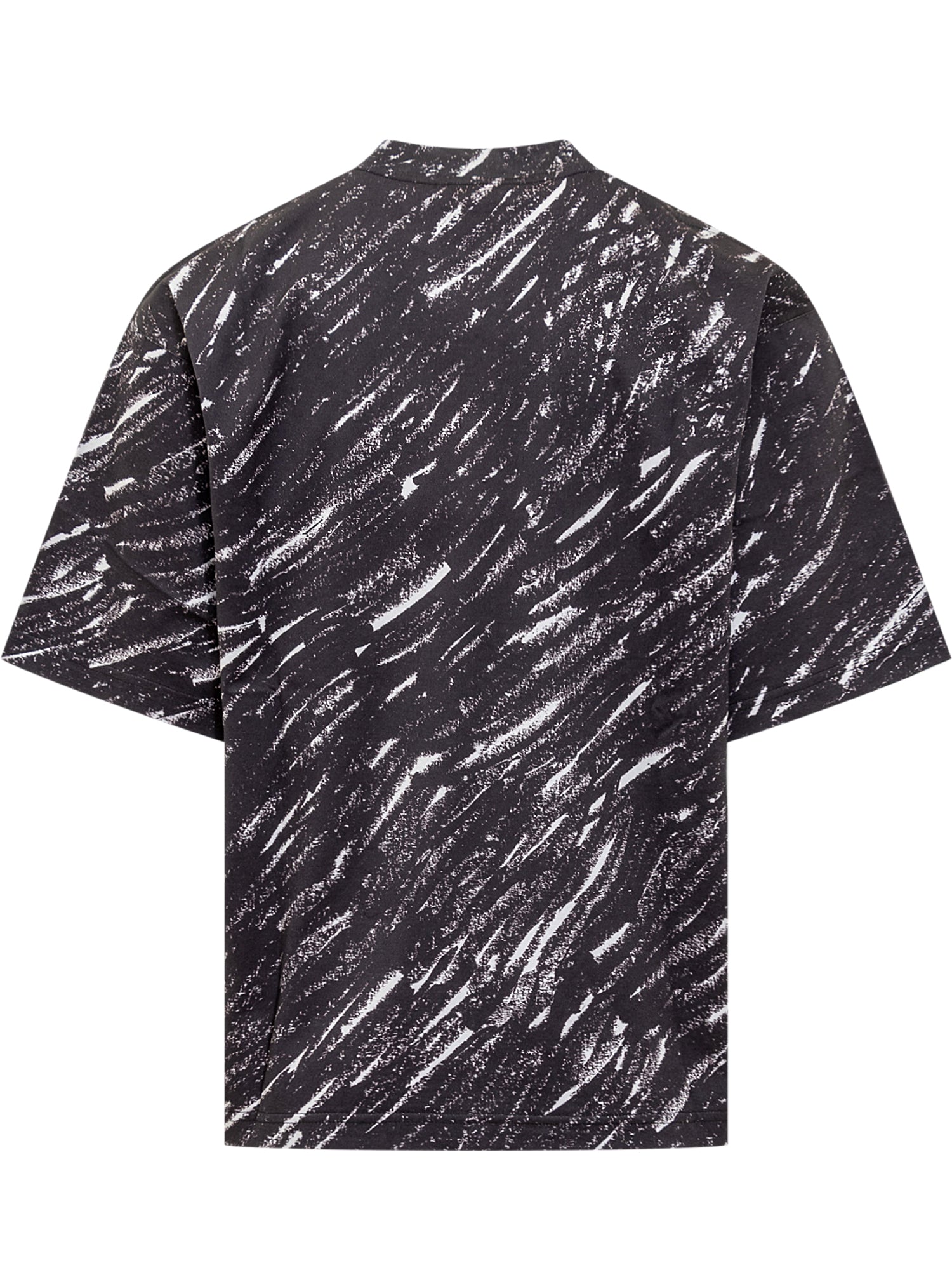 T-shirt nera in cotone. Girocollo. Fantasia a contrasto con logo.