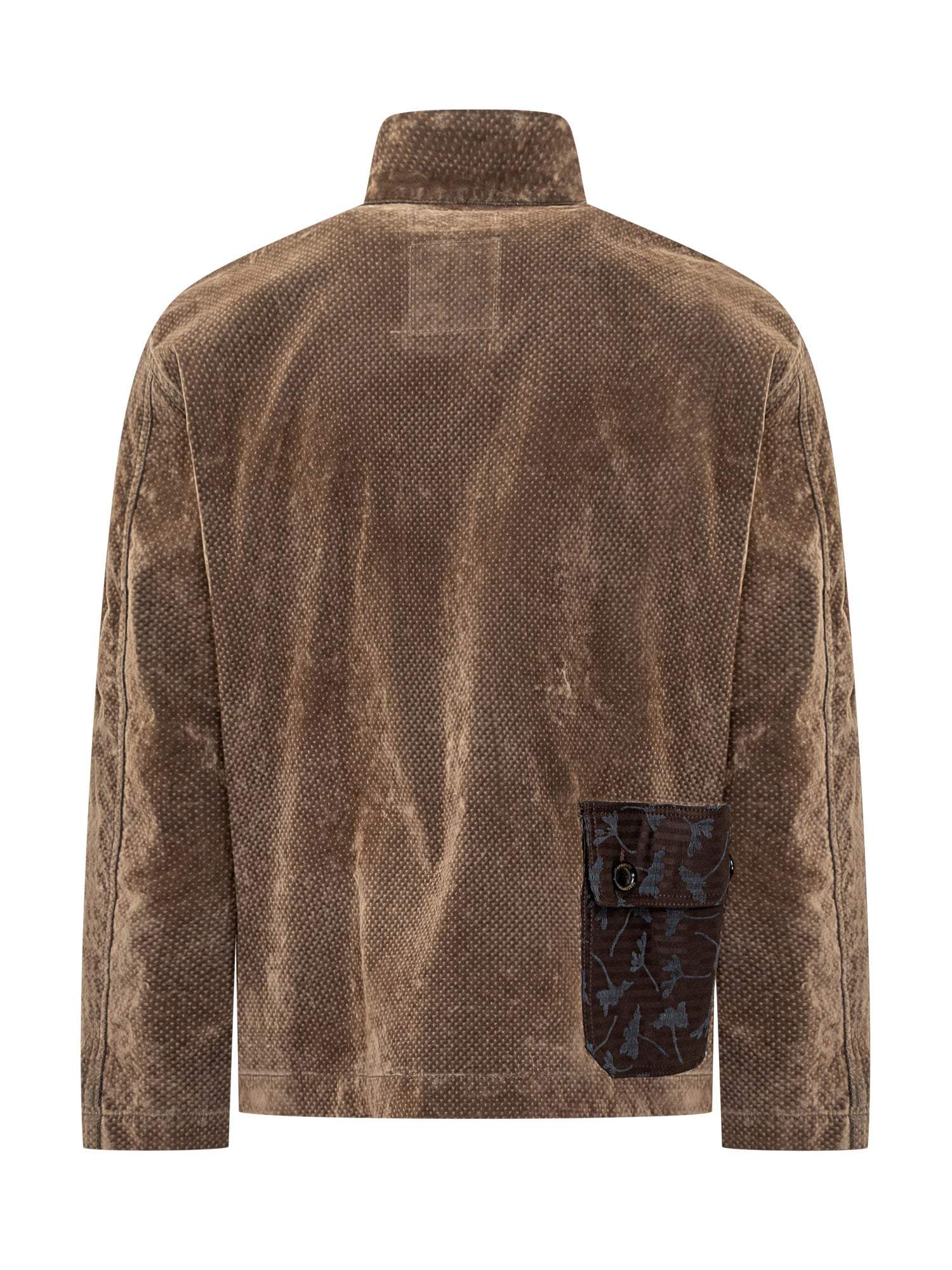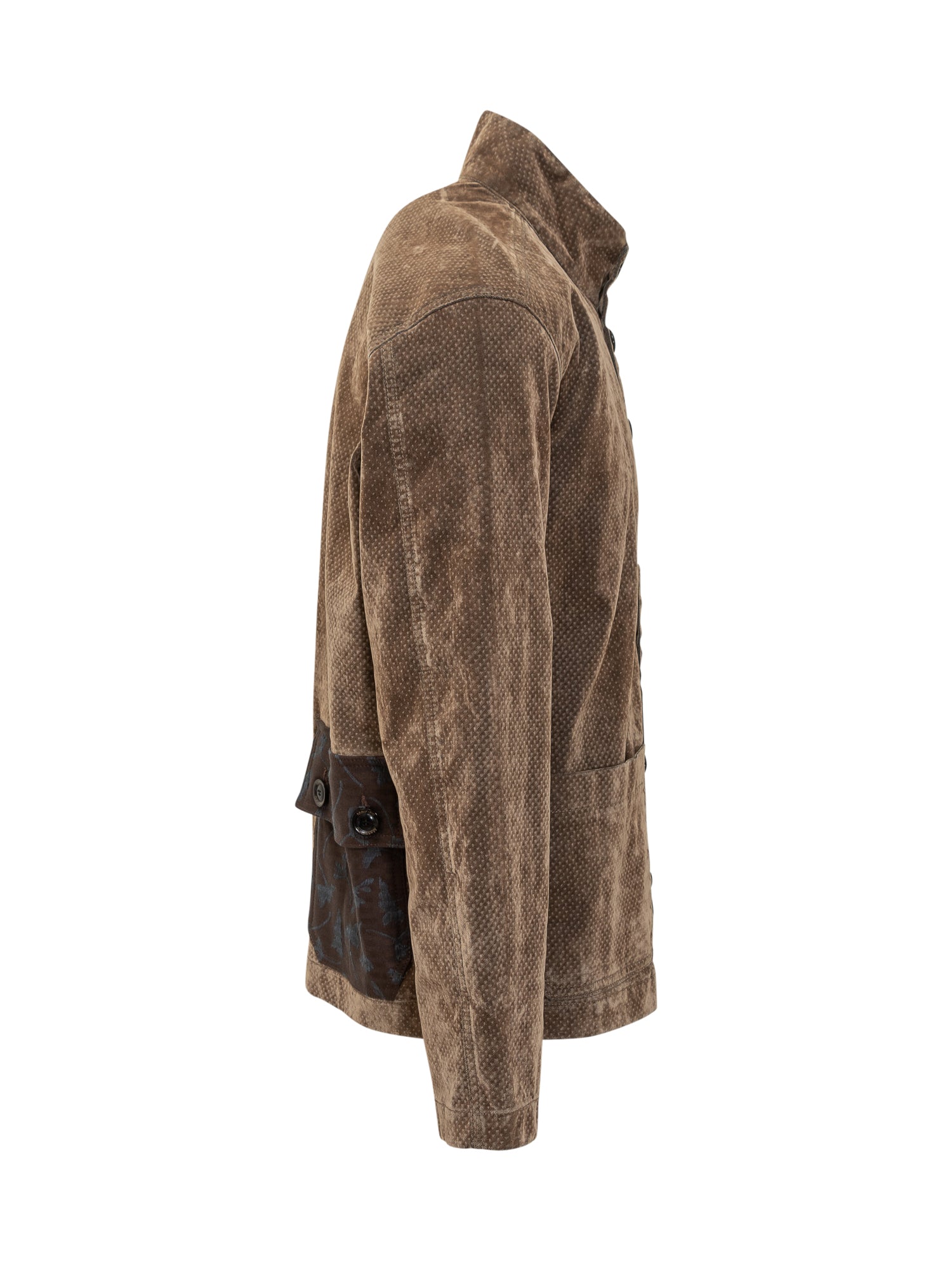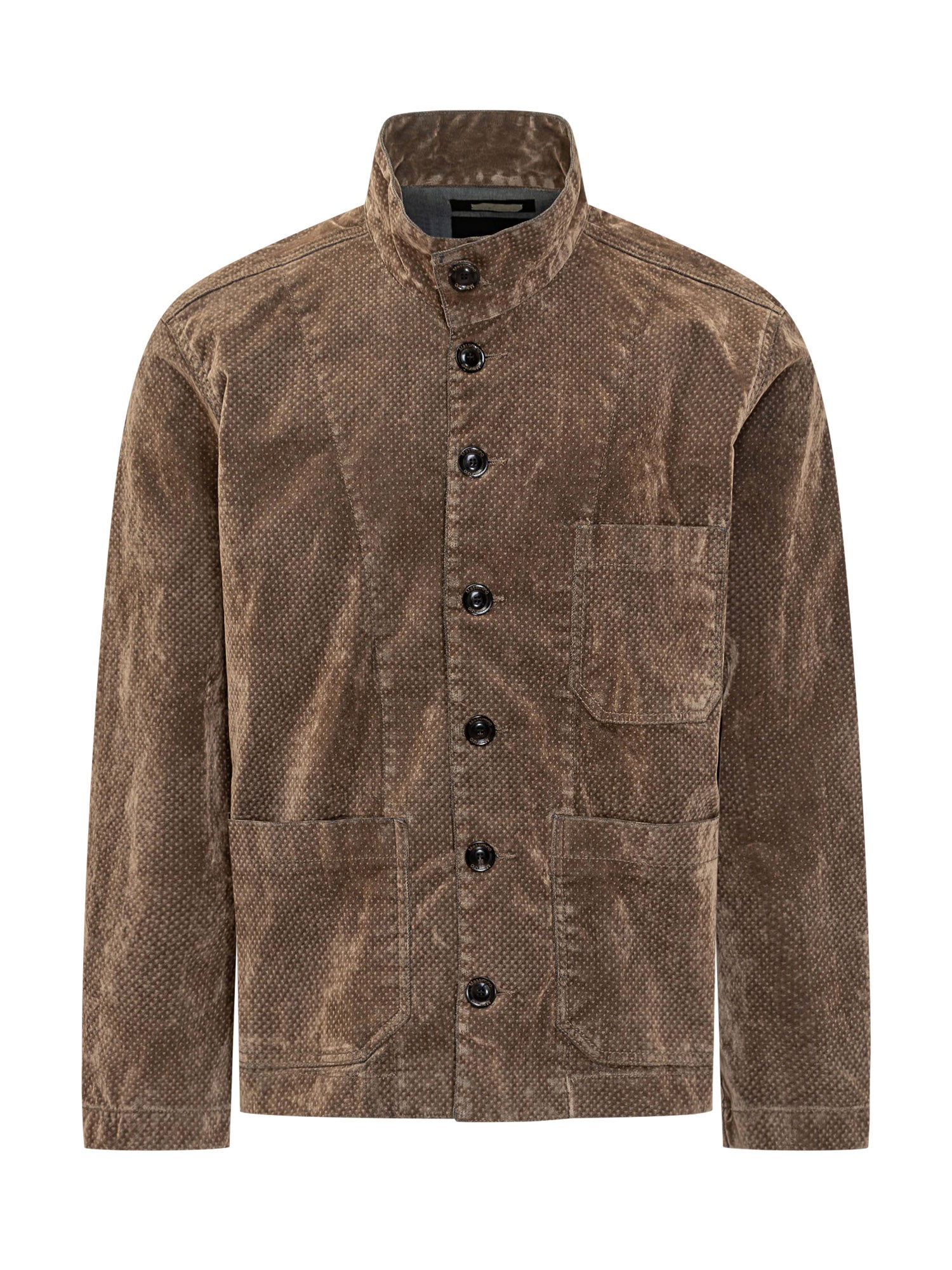 Giacca Maurizio Massimino modello Giovanni 788 in velluto flock. Collo alto, chiusura a bottoni e tasche applicate.