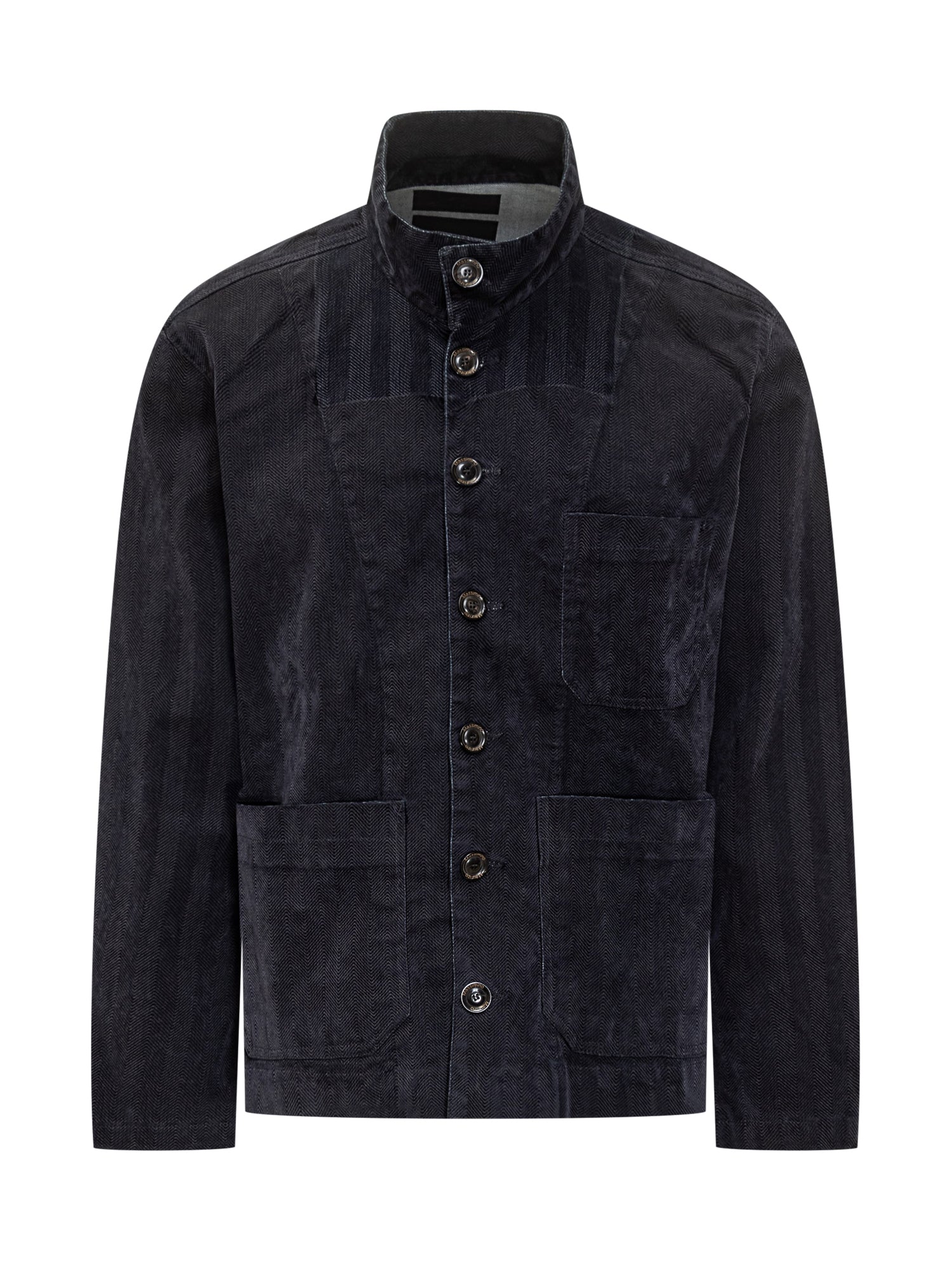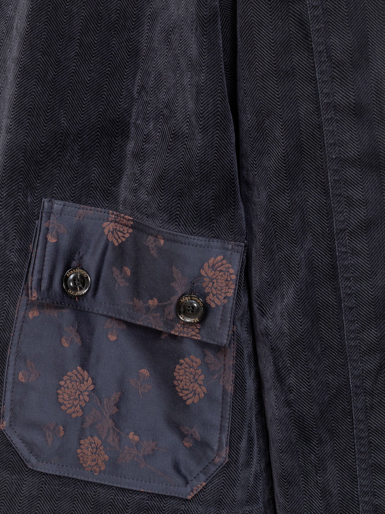 Giacca Maurizio Massimino modello Giovanni 788 in velluto flock blu. Con collo alto, chiusura a bottoni e tasche applicate.