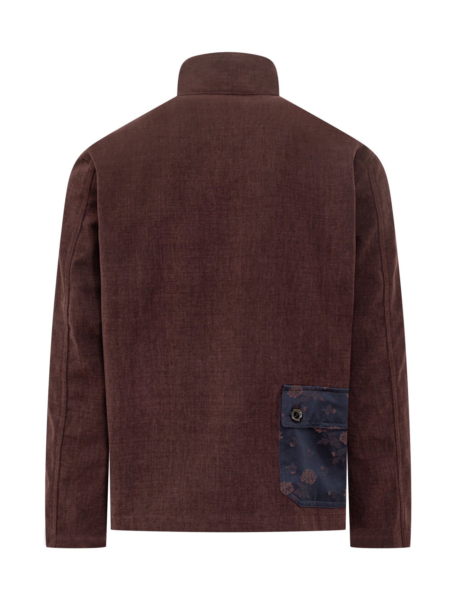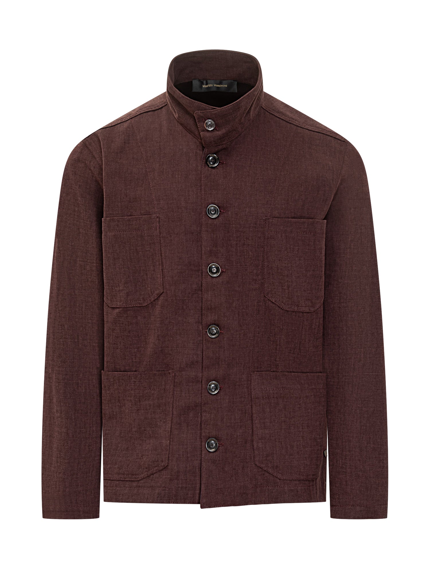 Giacca Maurizio Massimino modello Giovanni 788 in tessuto flock bordeaux. Design con collo alto, chiusura a bottoni e ampie tasche applicate.