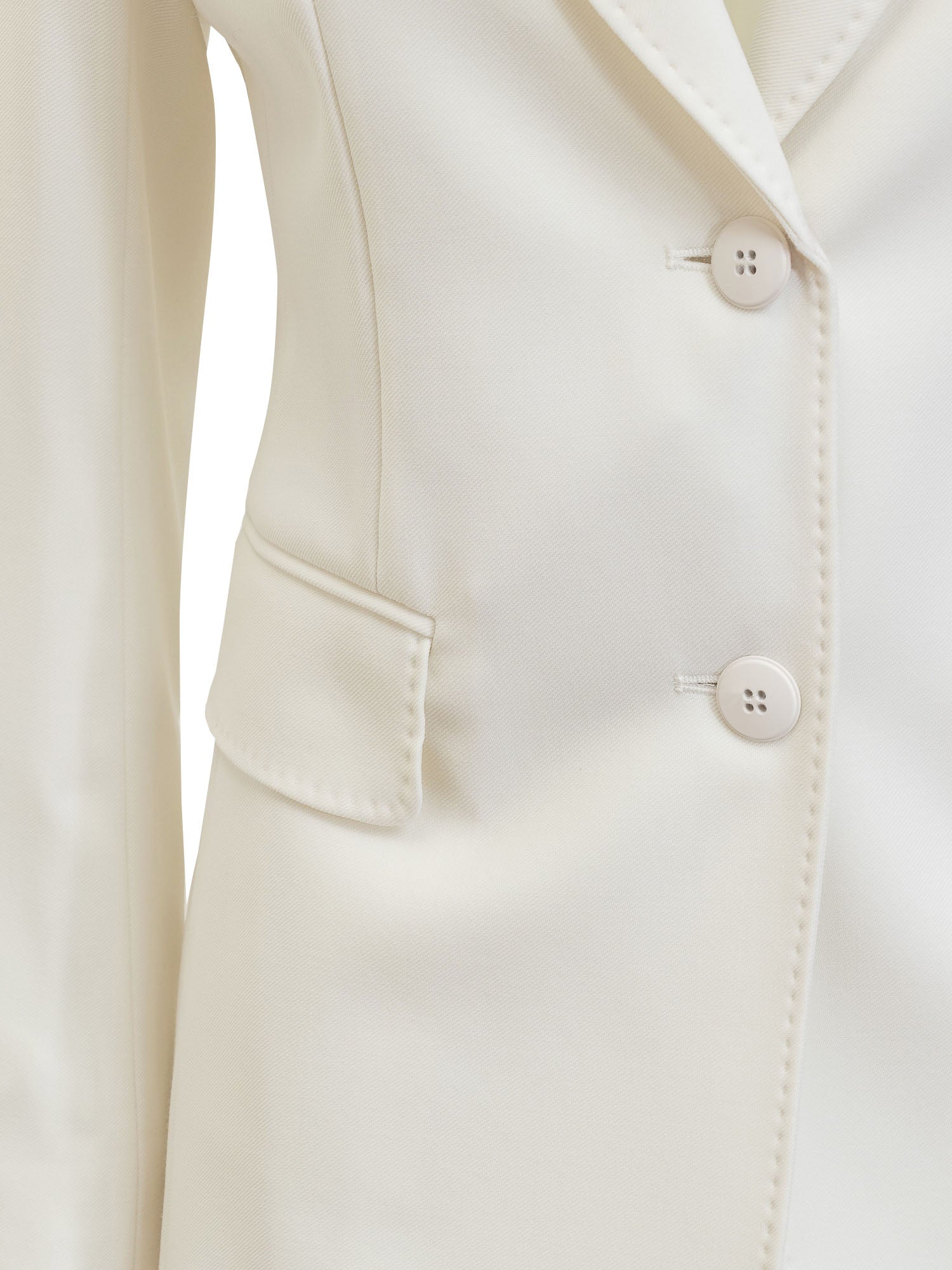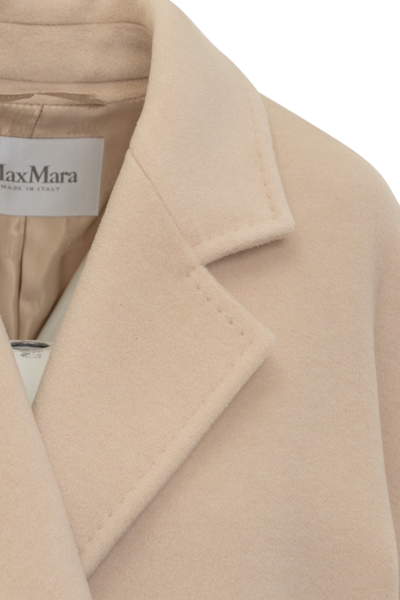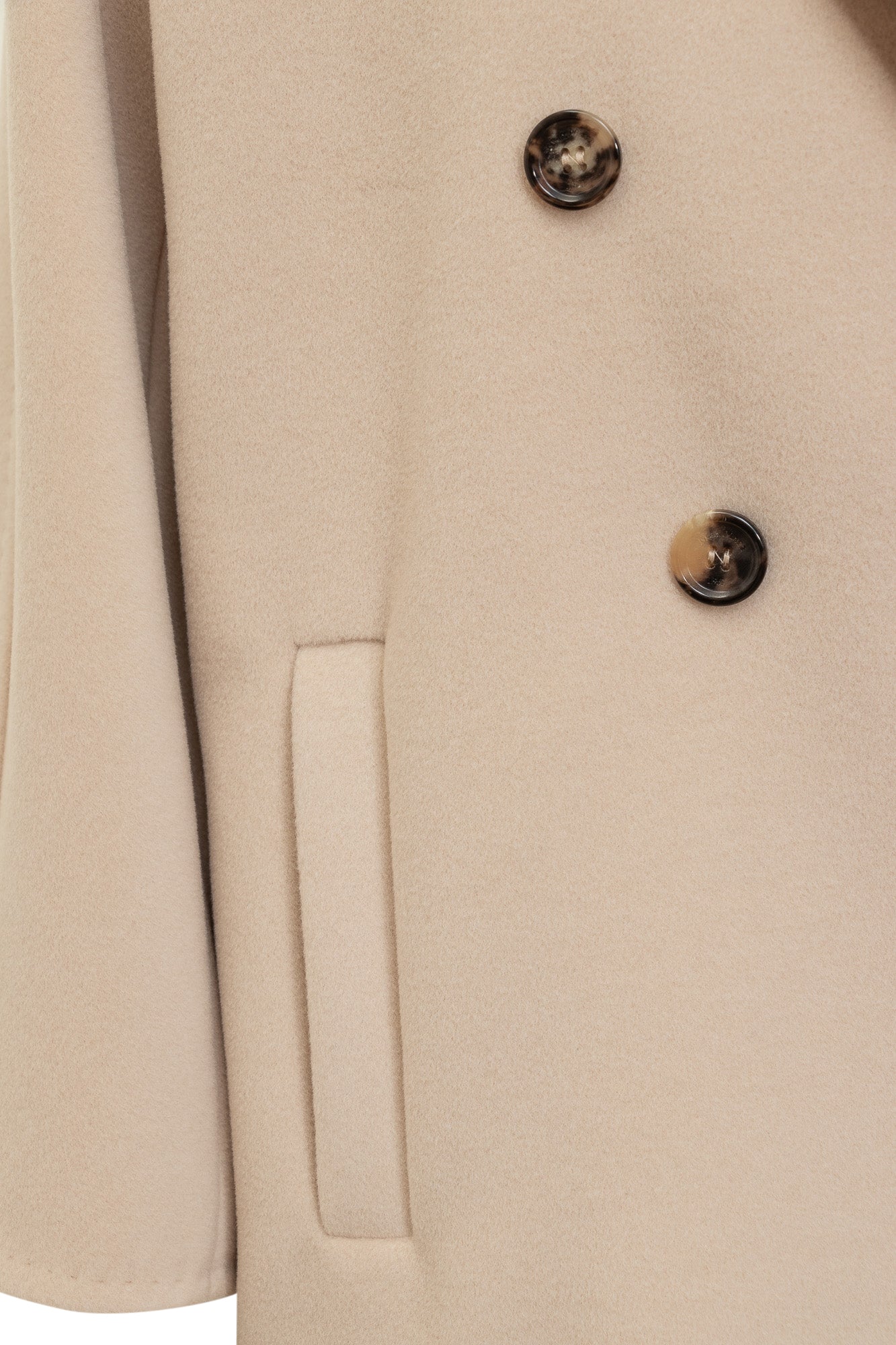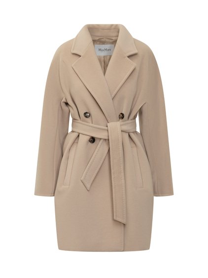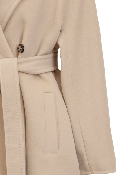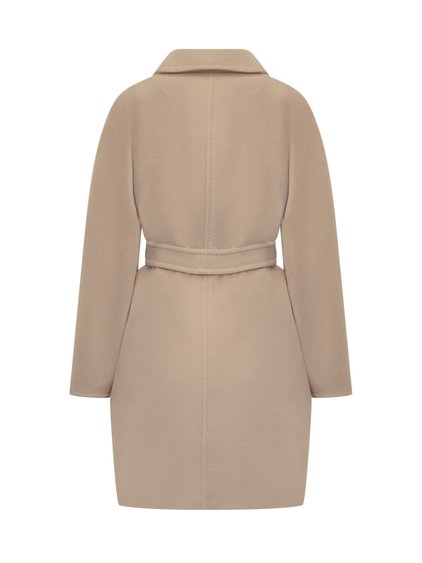 Cappotto in lana vergine e cashmere. Collo revers. Chiusura doppiopetto con bottone. Due tasche oblique sul davanti. Cintura in vita.