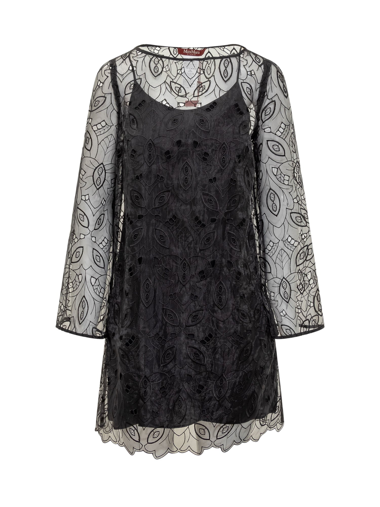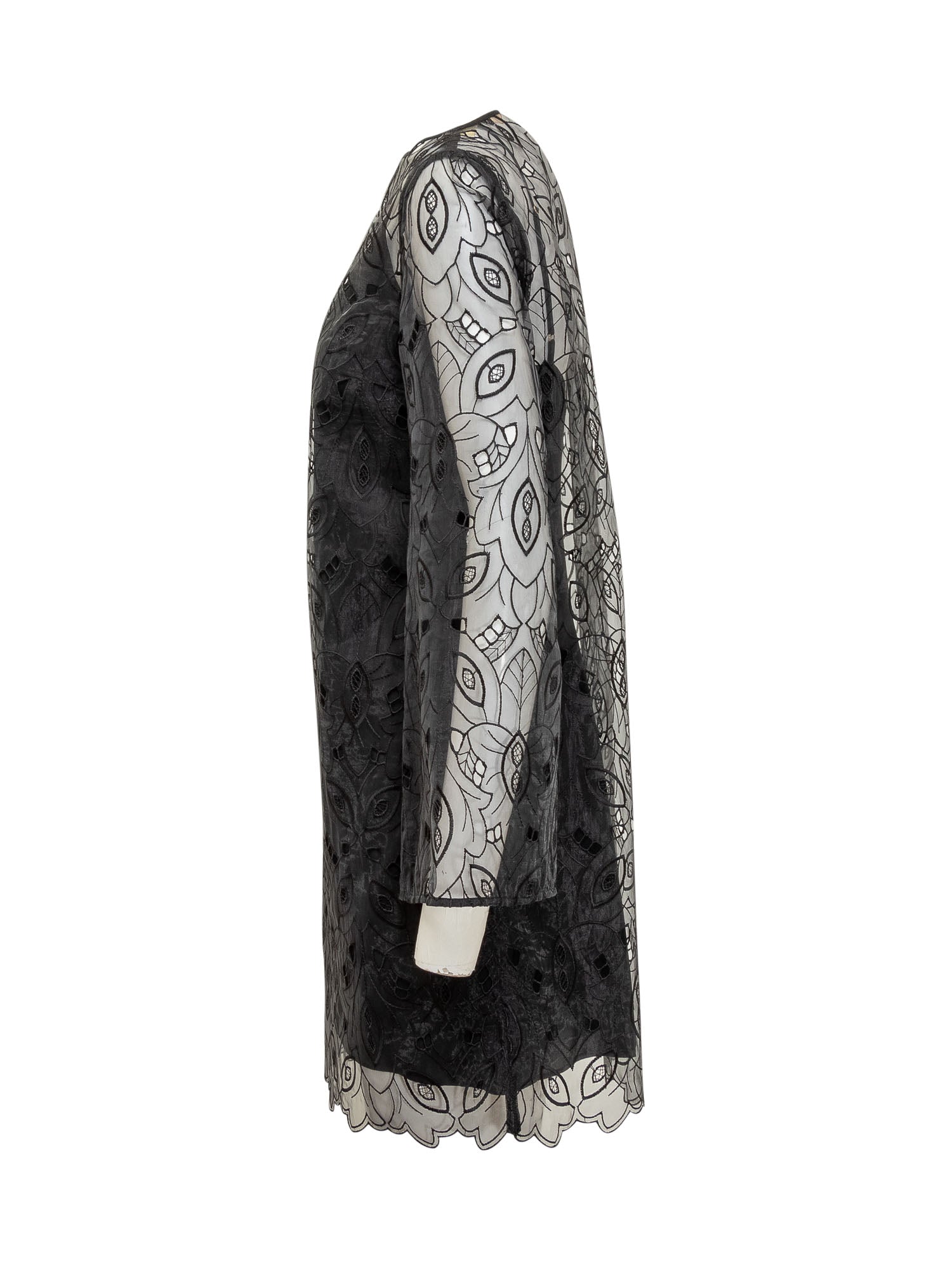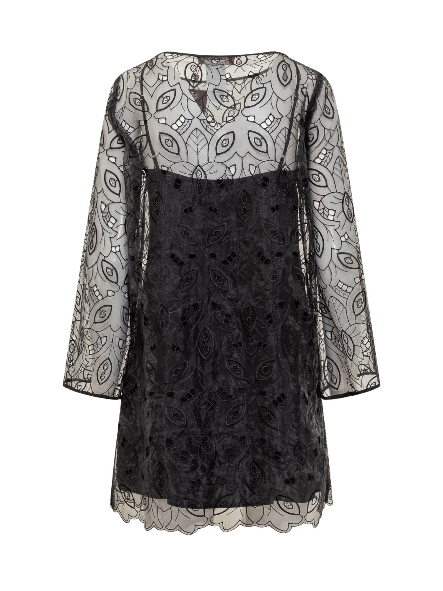 Abito mini in organza ricamata. Silhouette dritta. Scollo a giro. Maniche lunghe svasate sul fondo. Sottoveste abbinata in tono.