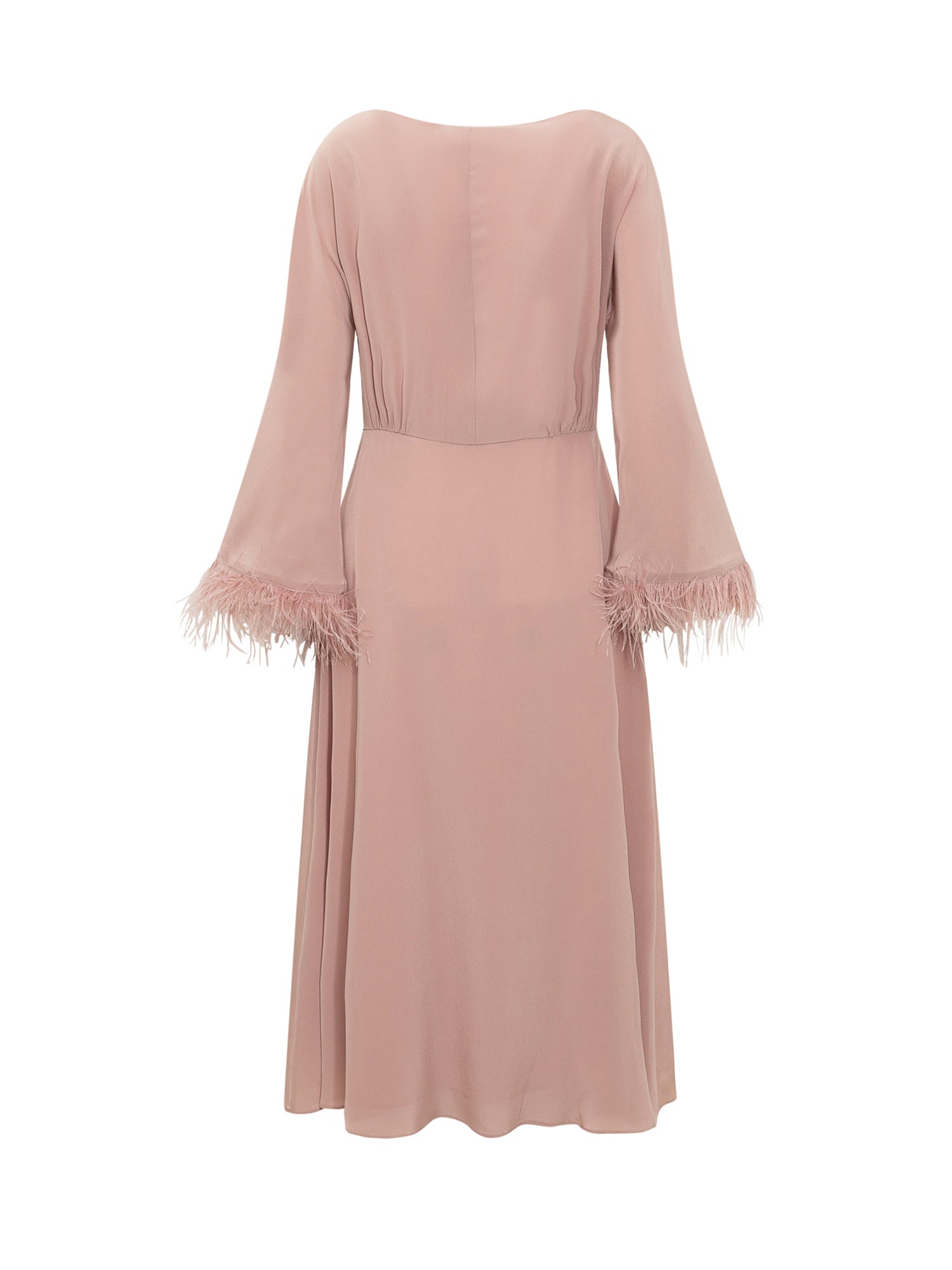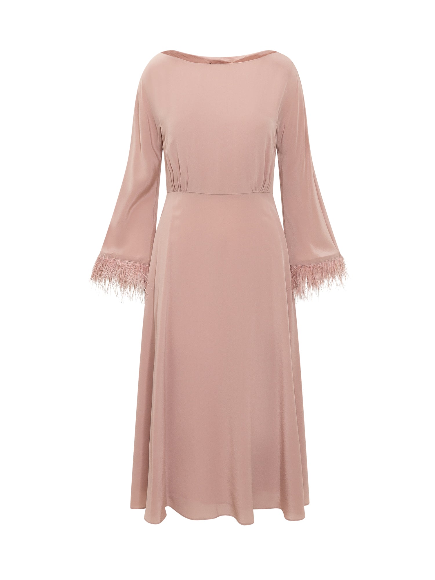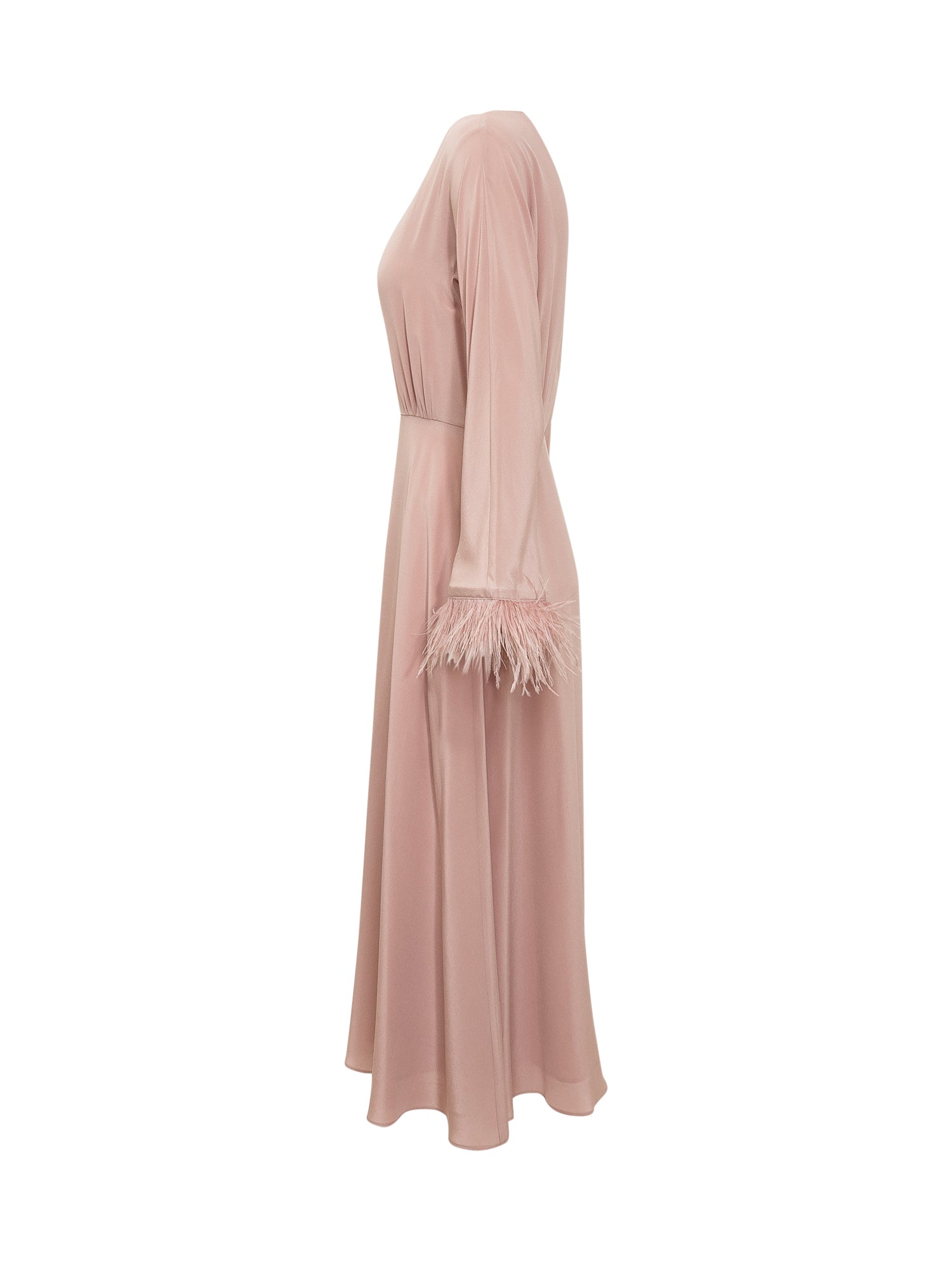 Abito a maniche lunghe. Dettaglio piume ai polsi. Chiusura laterale con zip. Girocollo.