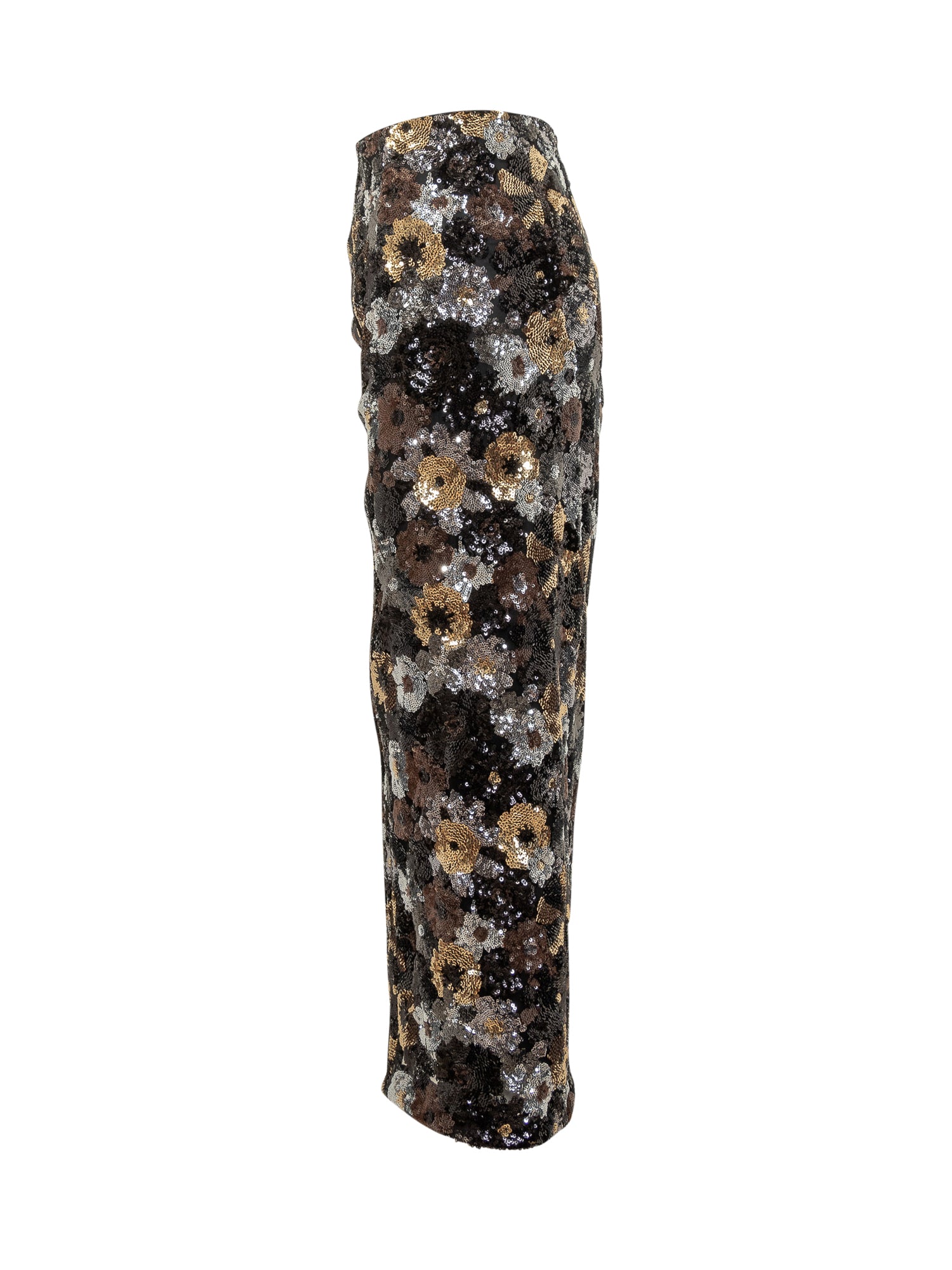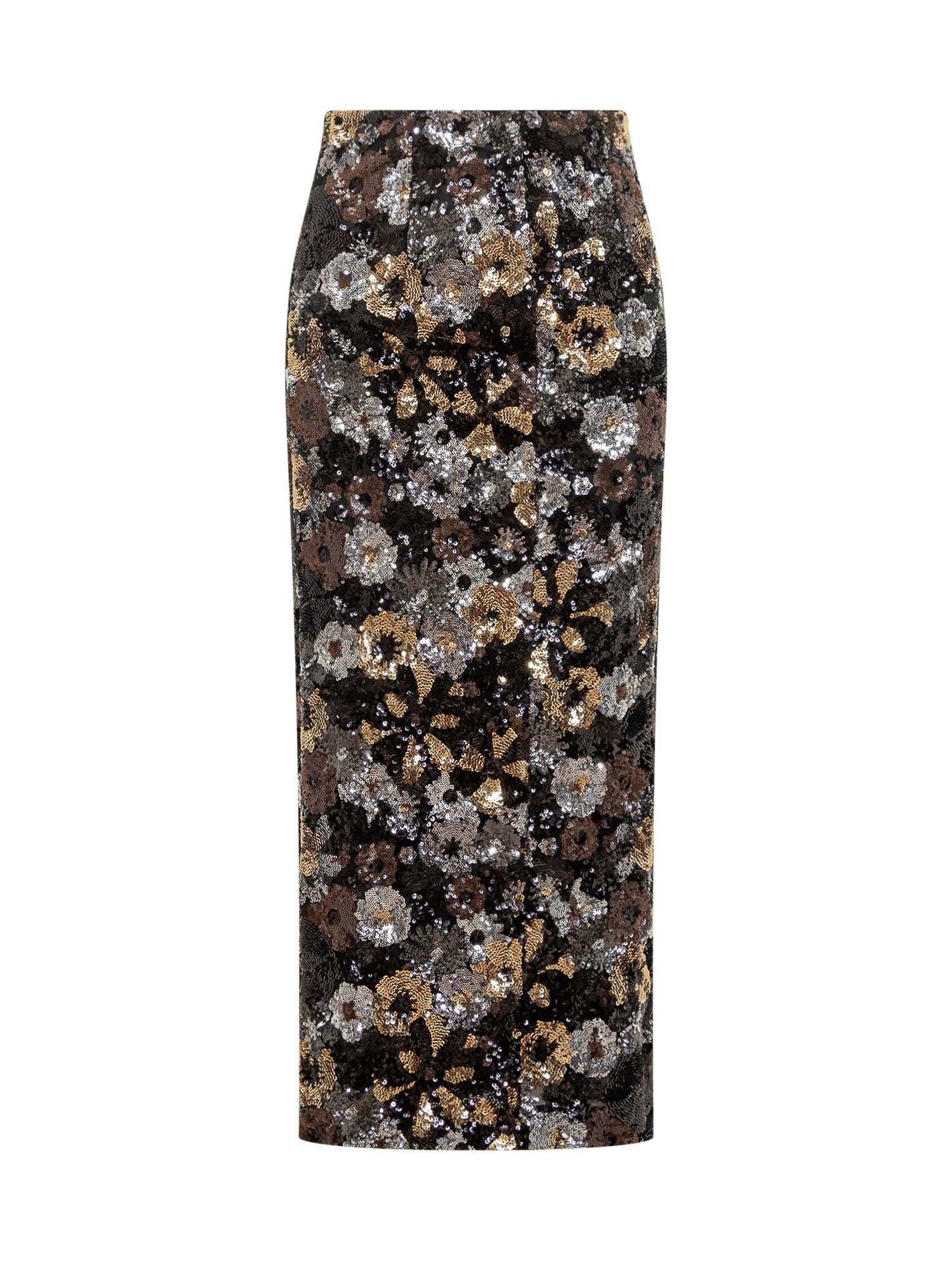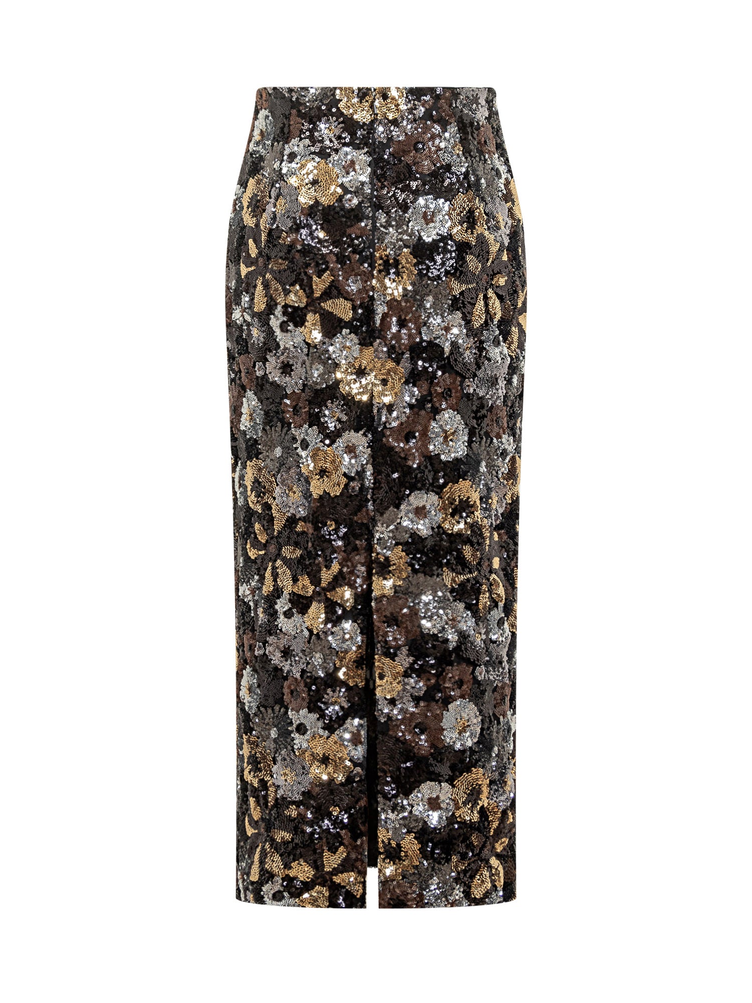 Gonna a tubino Max Mara Elegante Studio con raffinata lavorazione di paillettes dorate, argento e bronzo. Modello midi a vita alta con chiusura posteriore a zip.