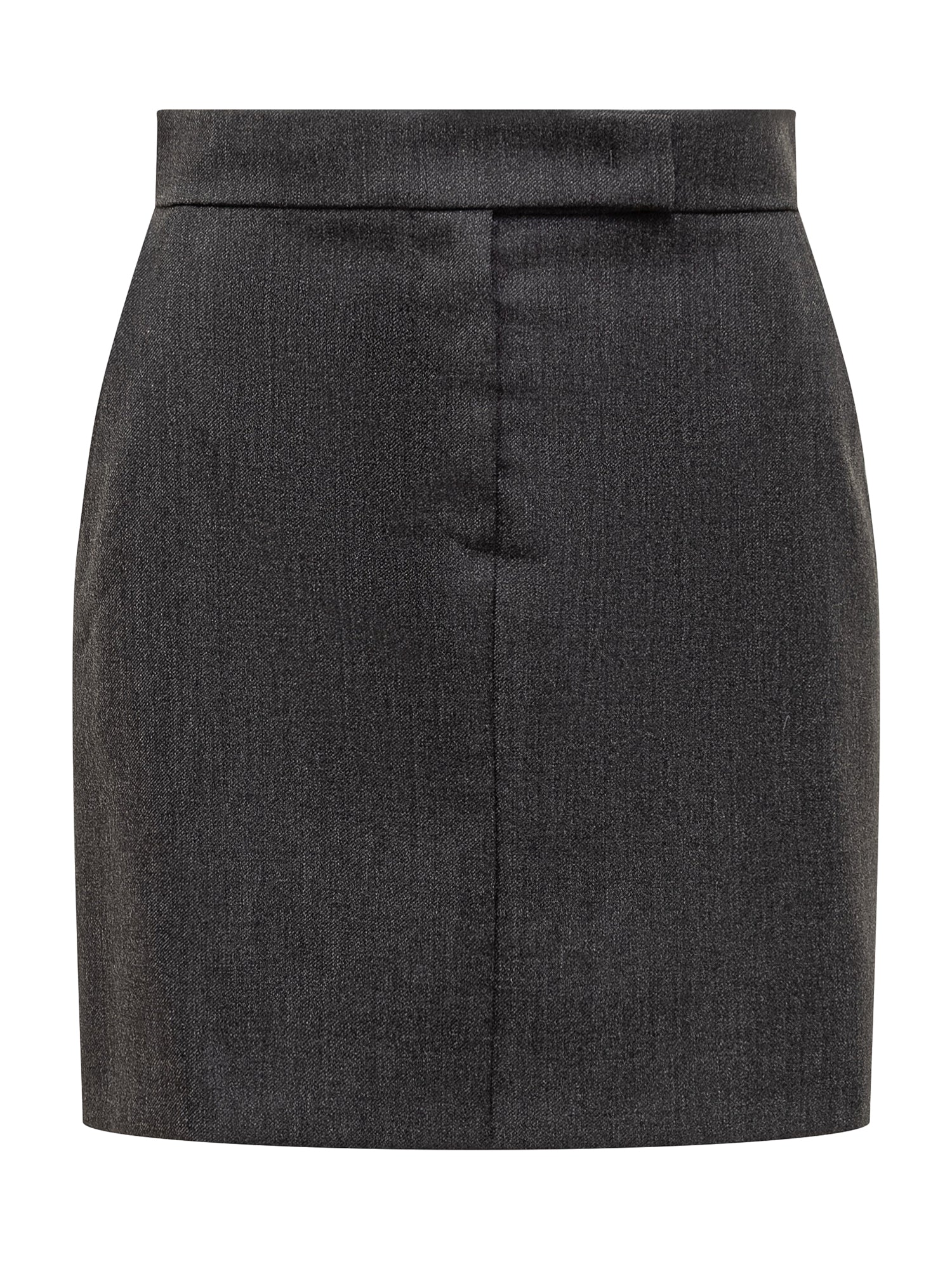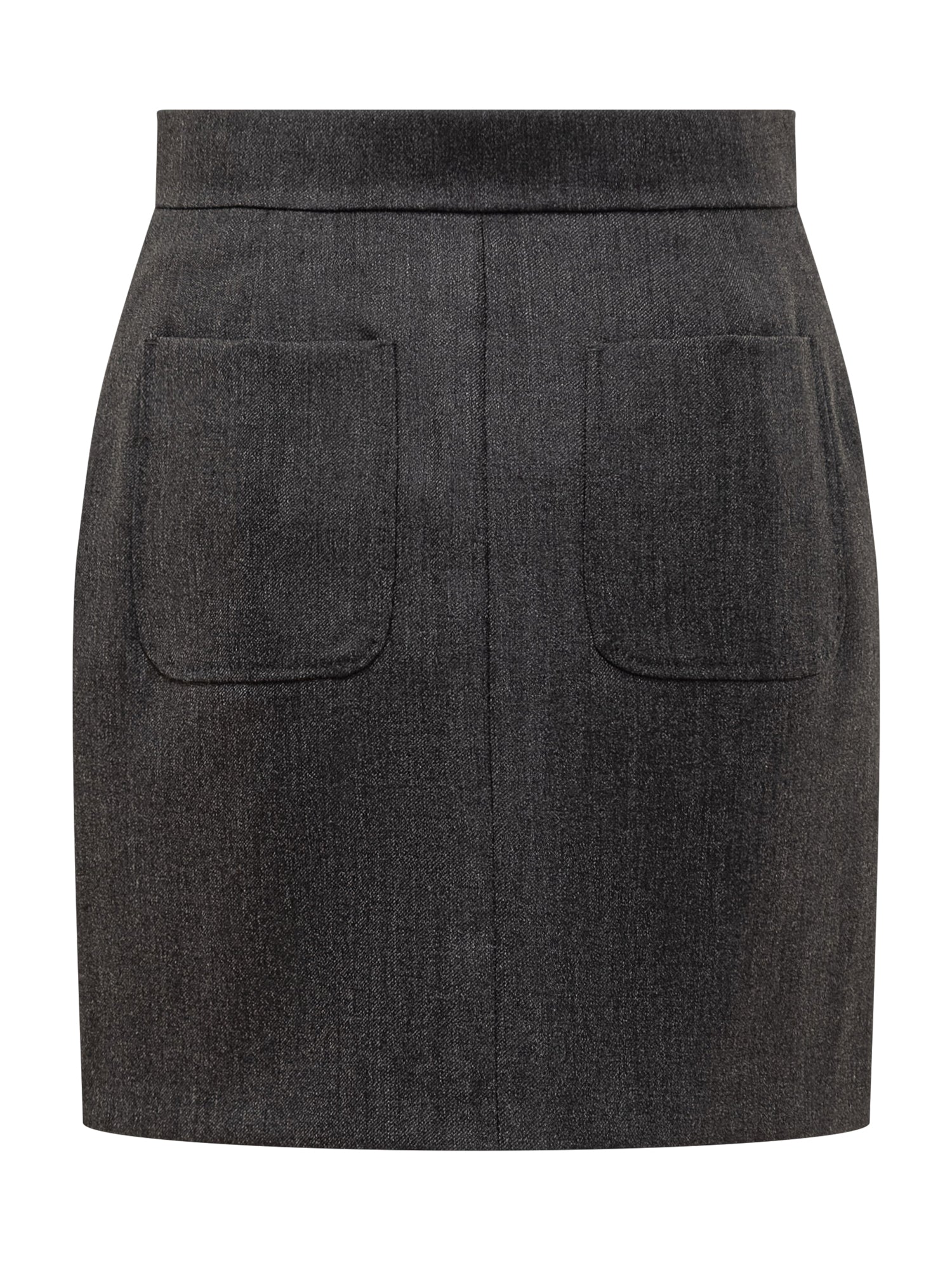 Gonna corta grigia in lana. Tasche applicate sul retro. Chiusura con zip e gancini.