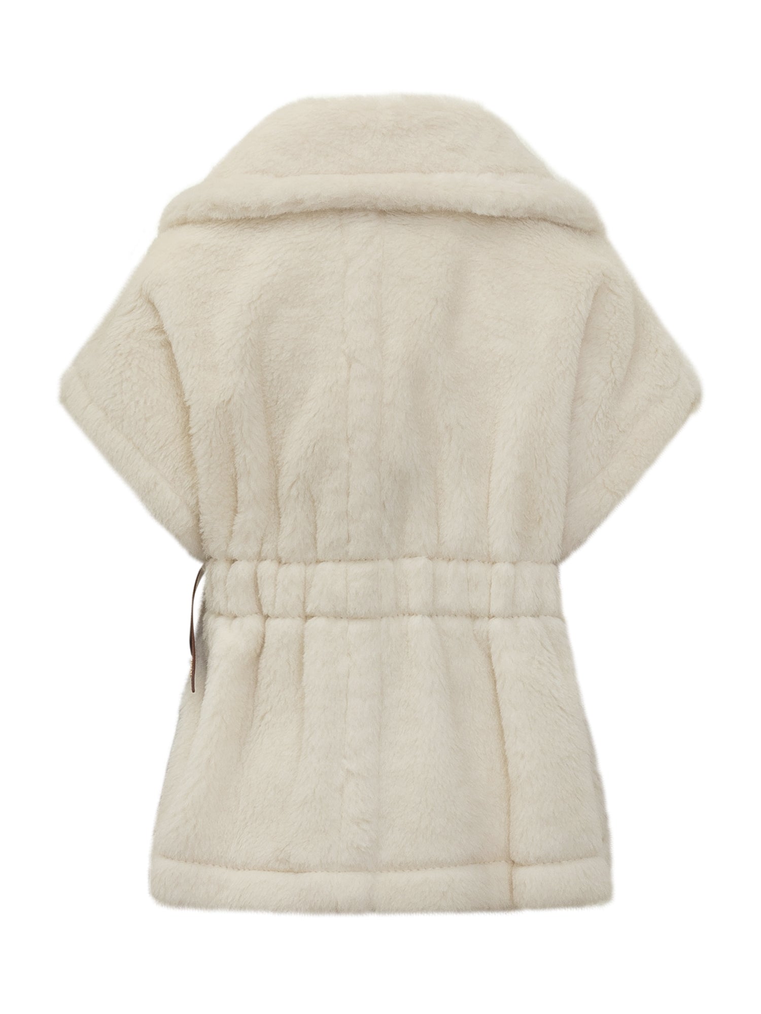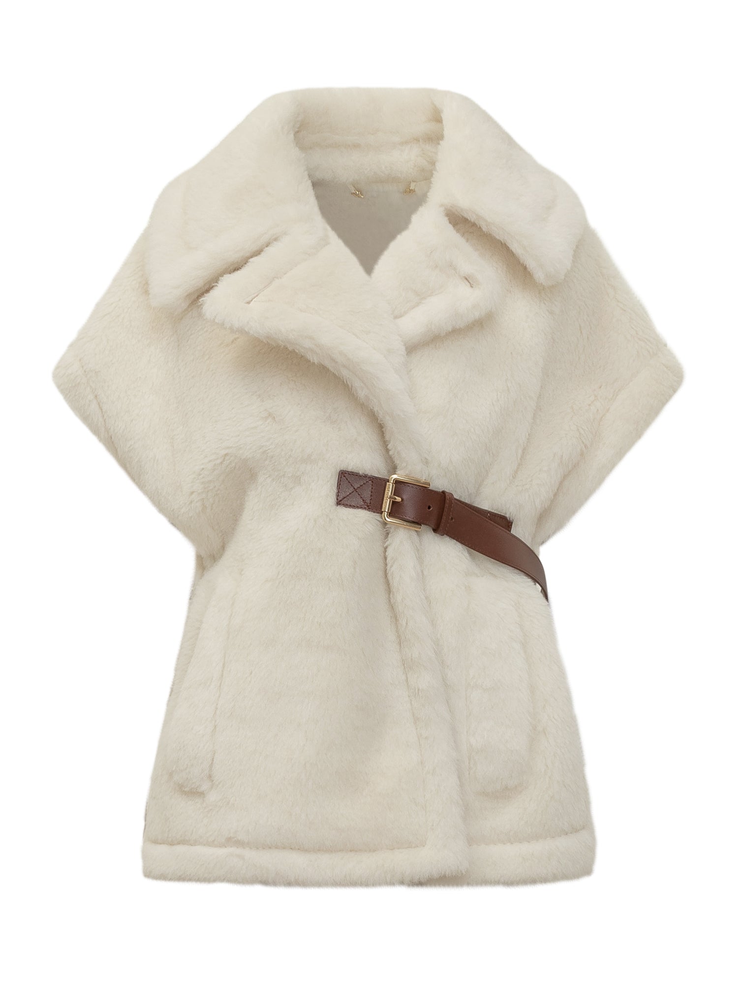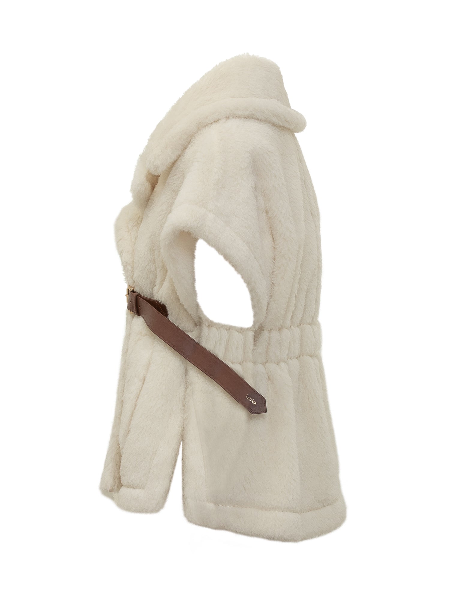 Gilet Max Mara in morbida pelliccia ecologica color panna con revers classici e cintura in pelle marrone. Modello senza maniche.
