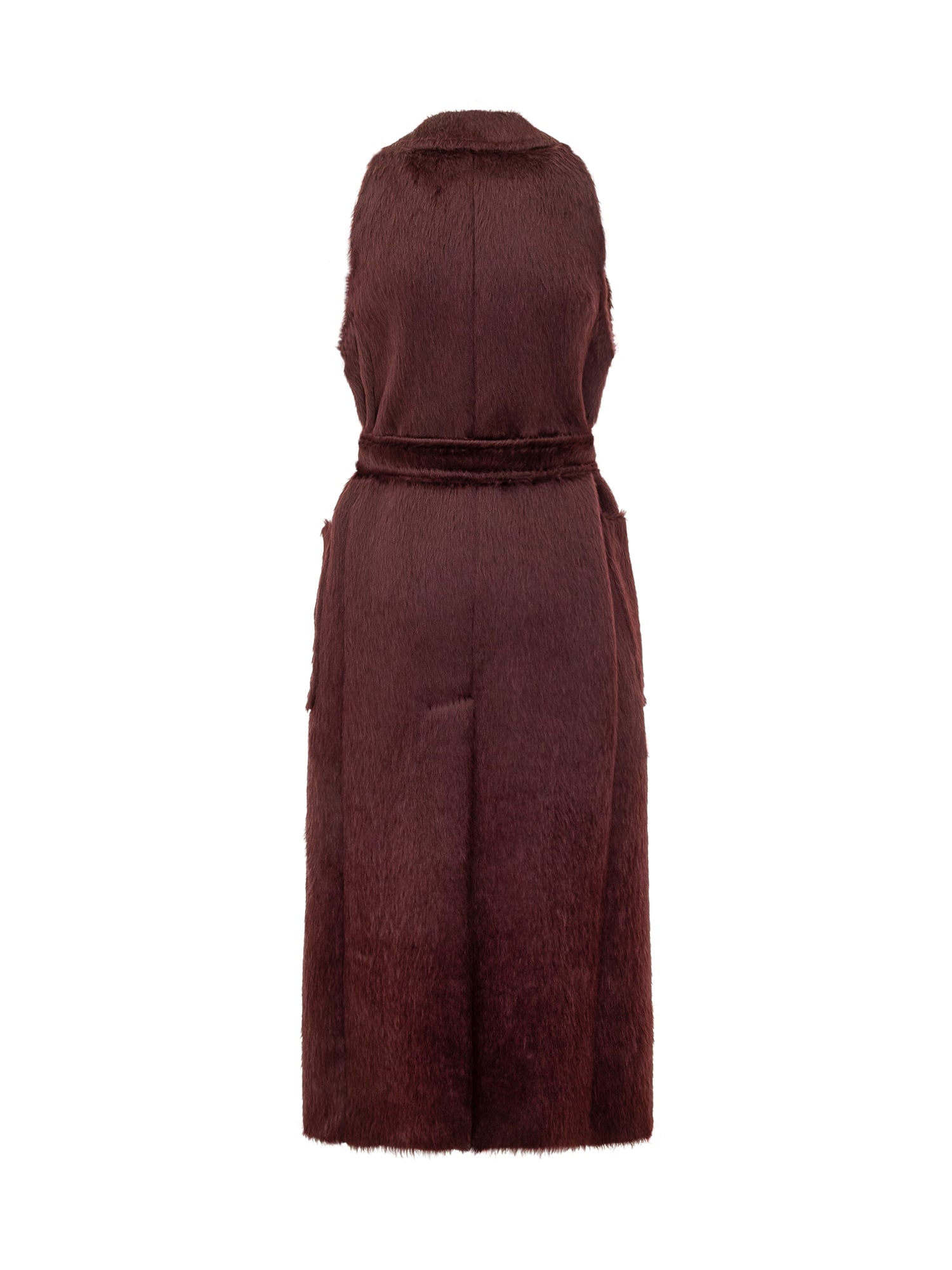 Gilet lungo Max Mara in morbida lana bordeaux con revers ampi, tasche applicate e cintura coordinata in vita.