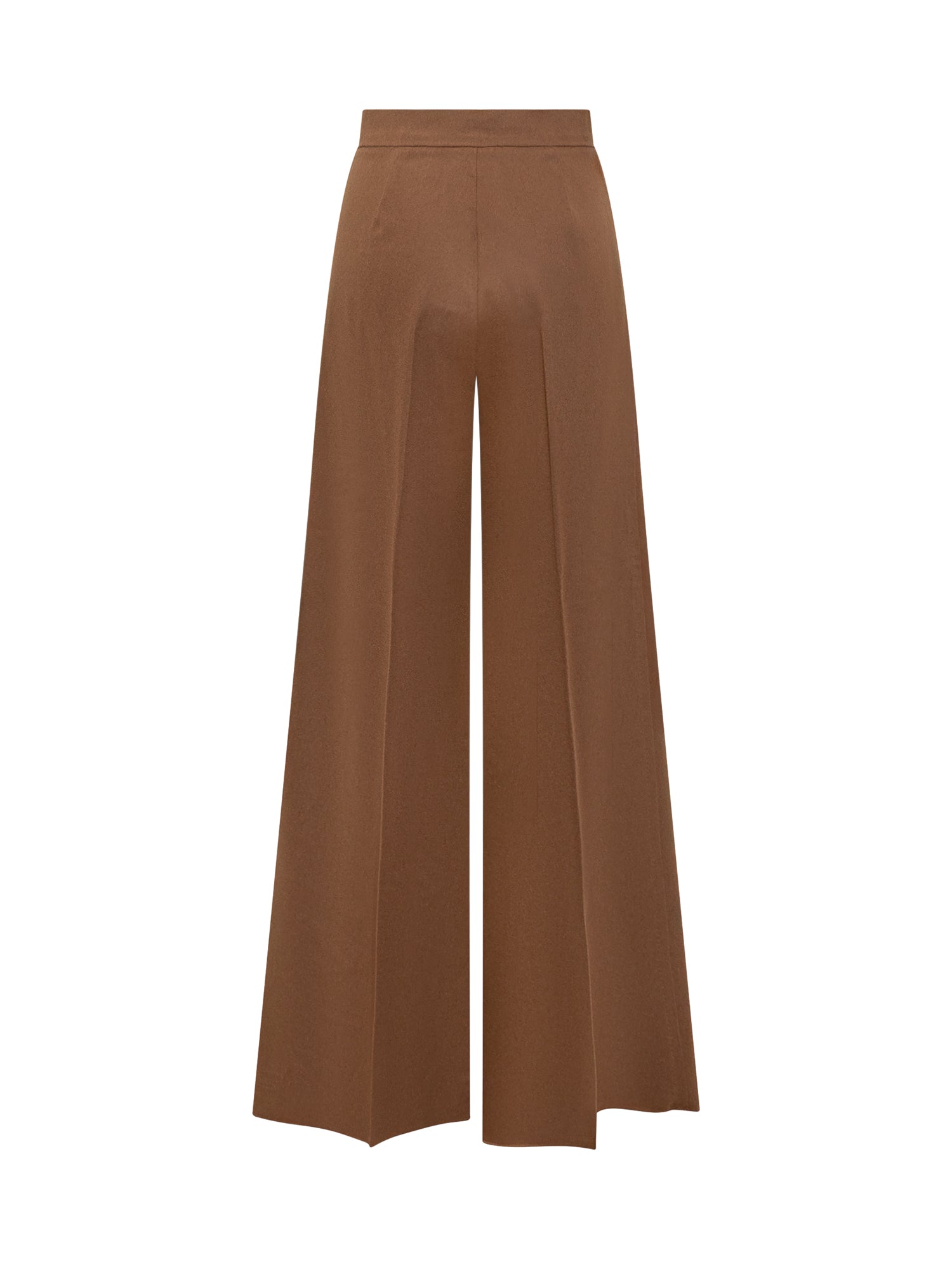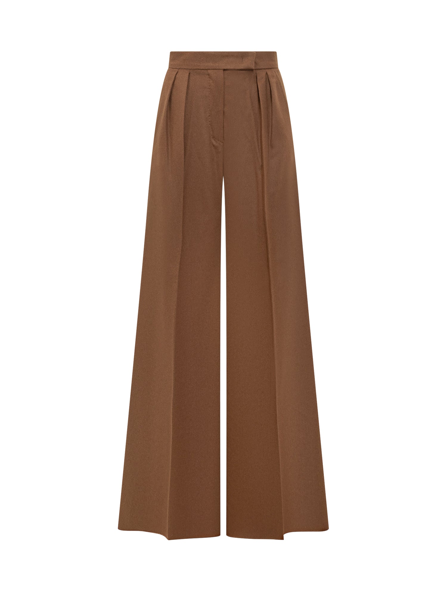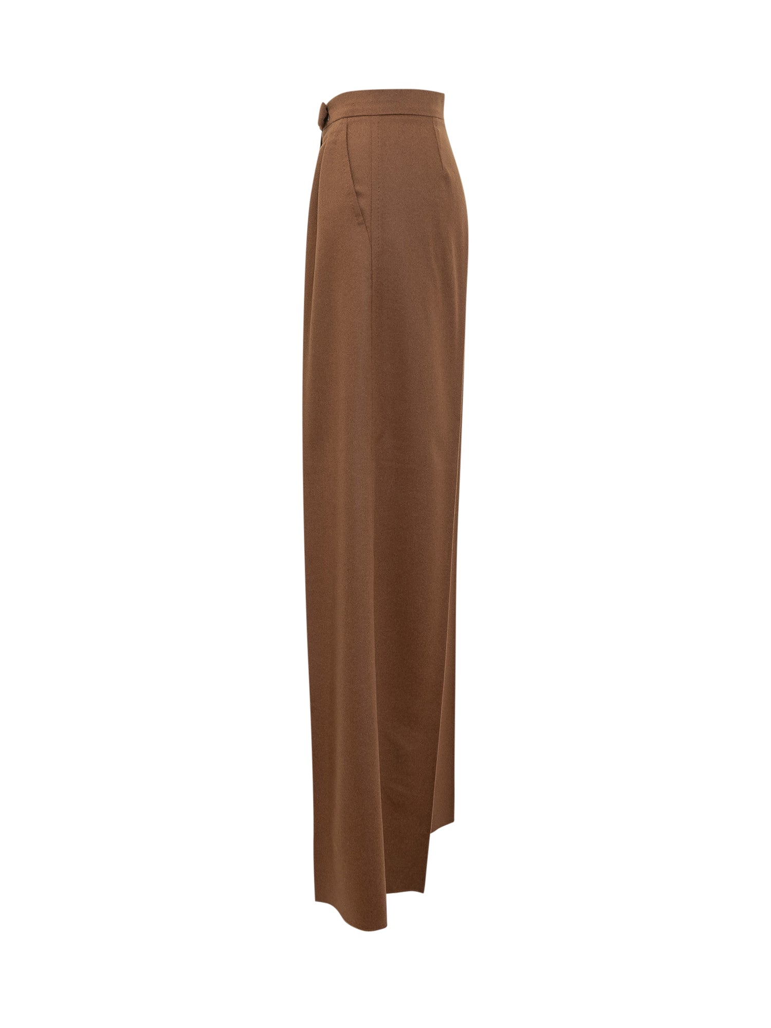 Pantaloni palazzo Max Mara in lana marrone con linea ampia e pieghe frontali. Vita alta con chiusura a bottone e zip.