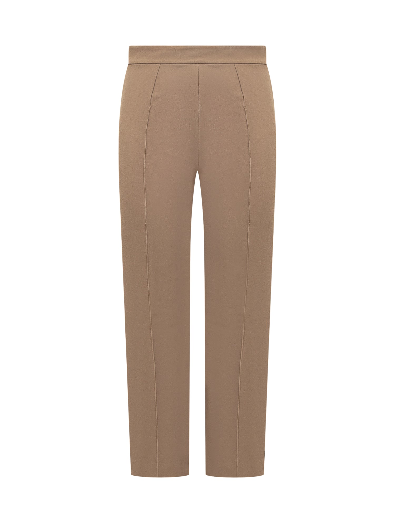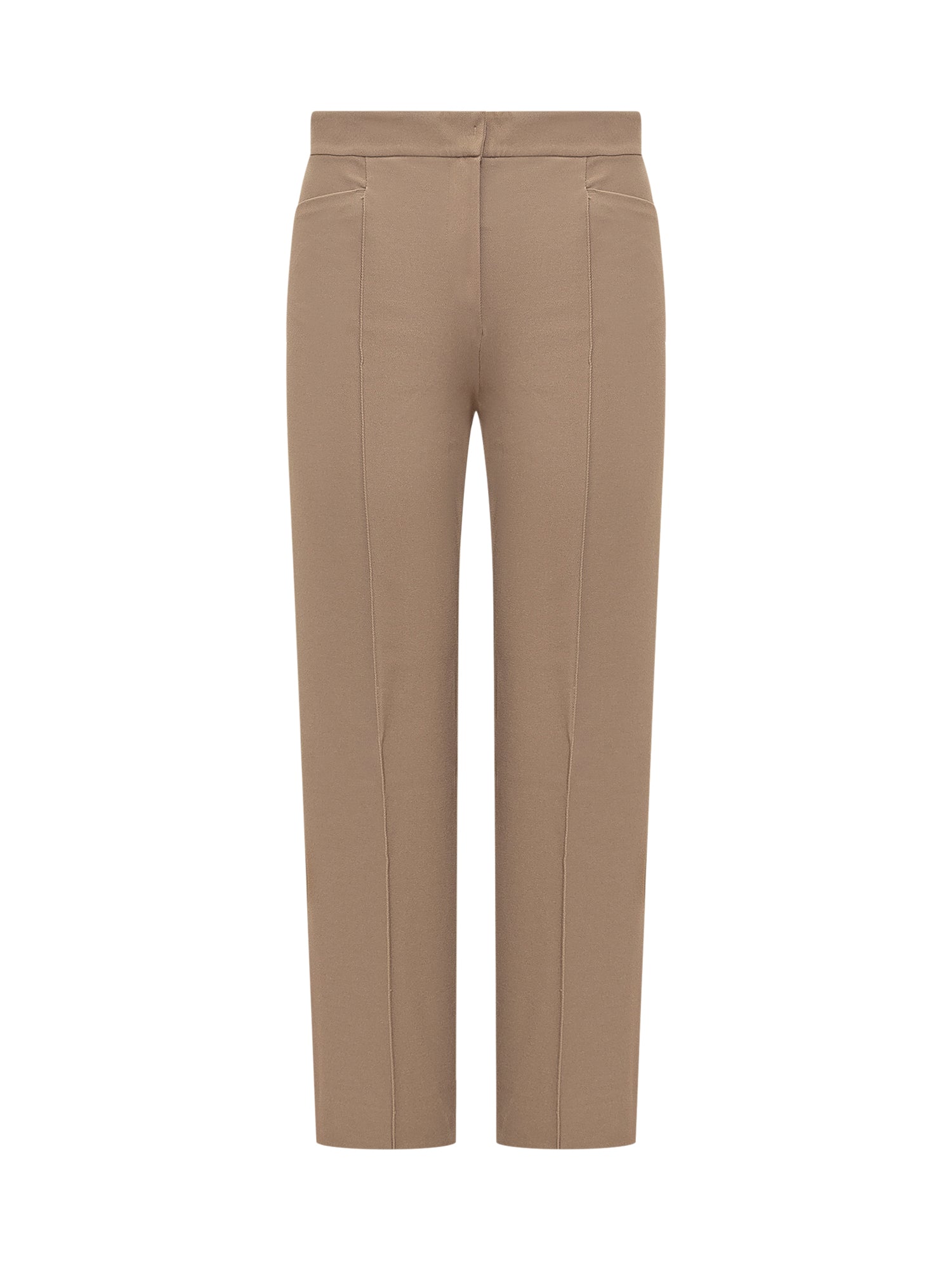 Pantalone cropped alla caviglia in cover di cotone stretch. Chiusura con zip, bottone e gancino. Due tasche alla carrettiera sul davanti. Rifinito con piega cucita.