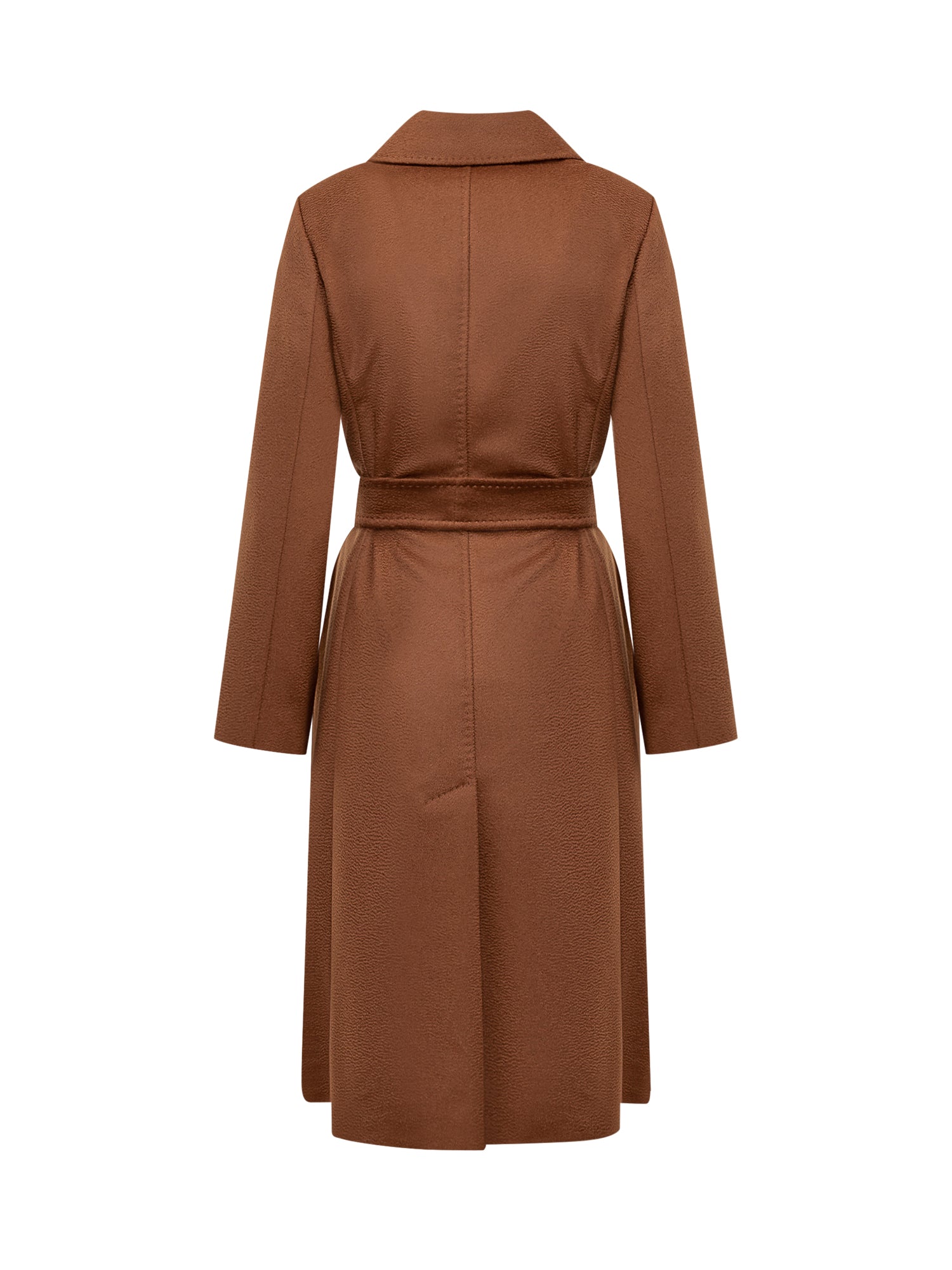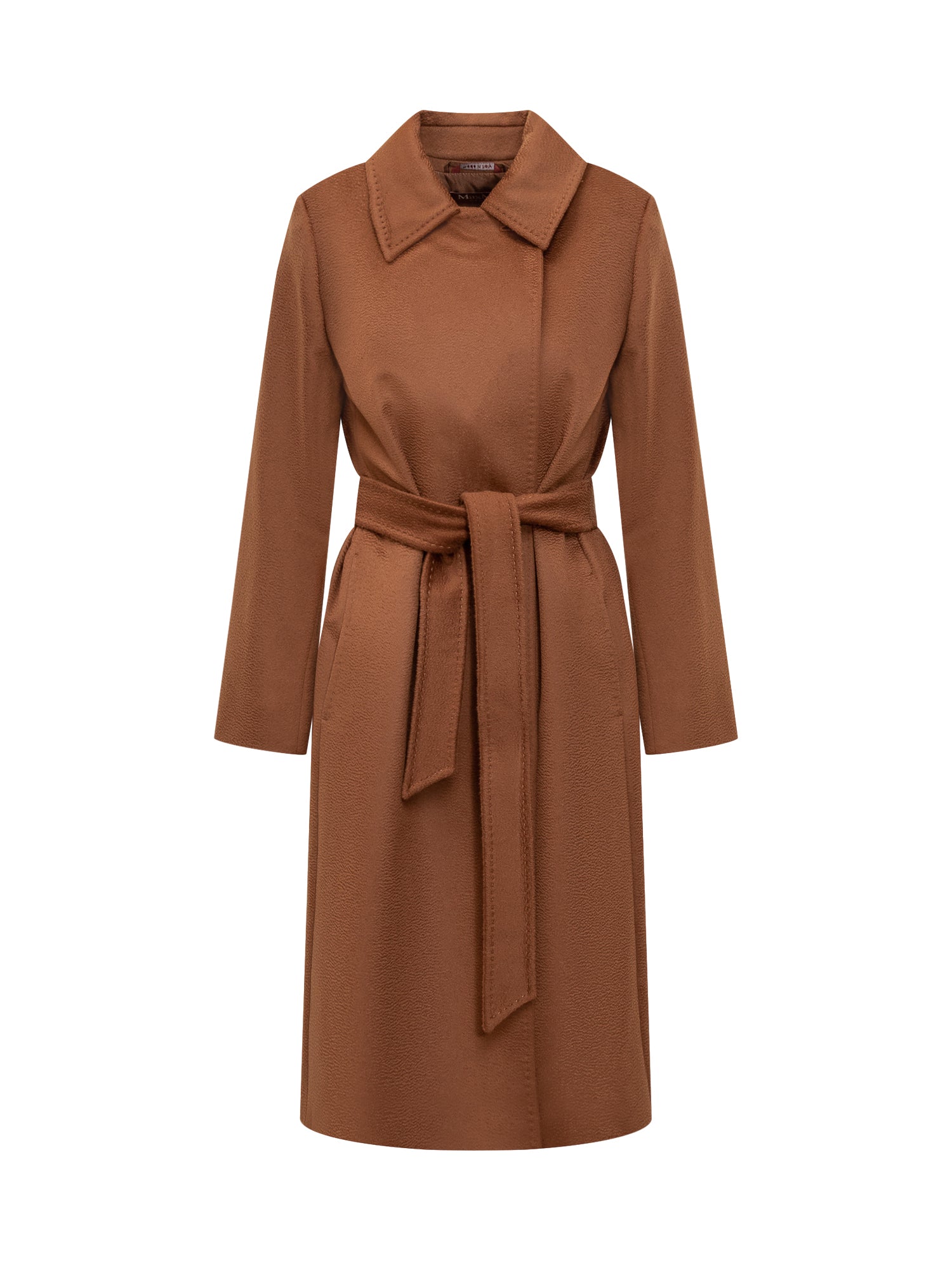 Cappotto con collo classico. Cintura in vita. Due tasche.