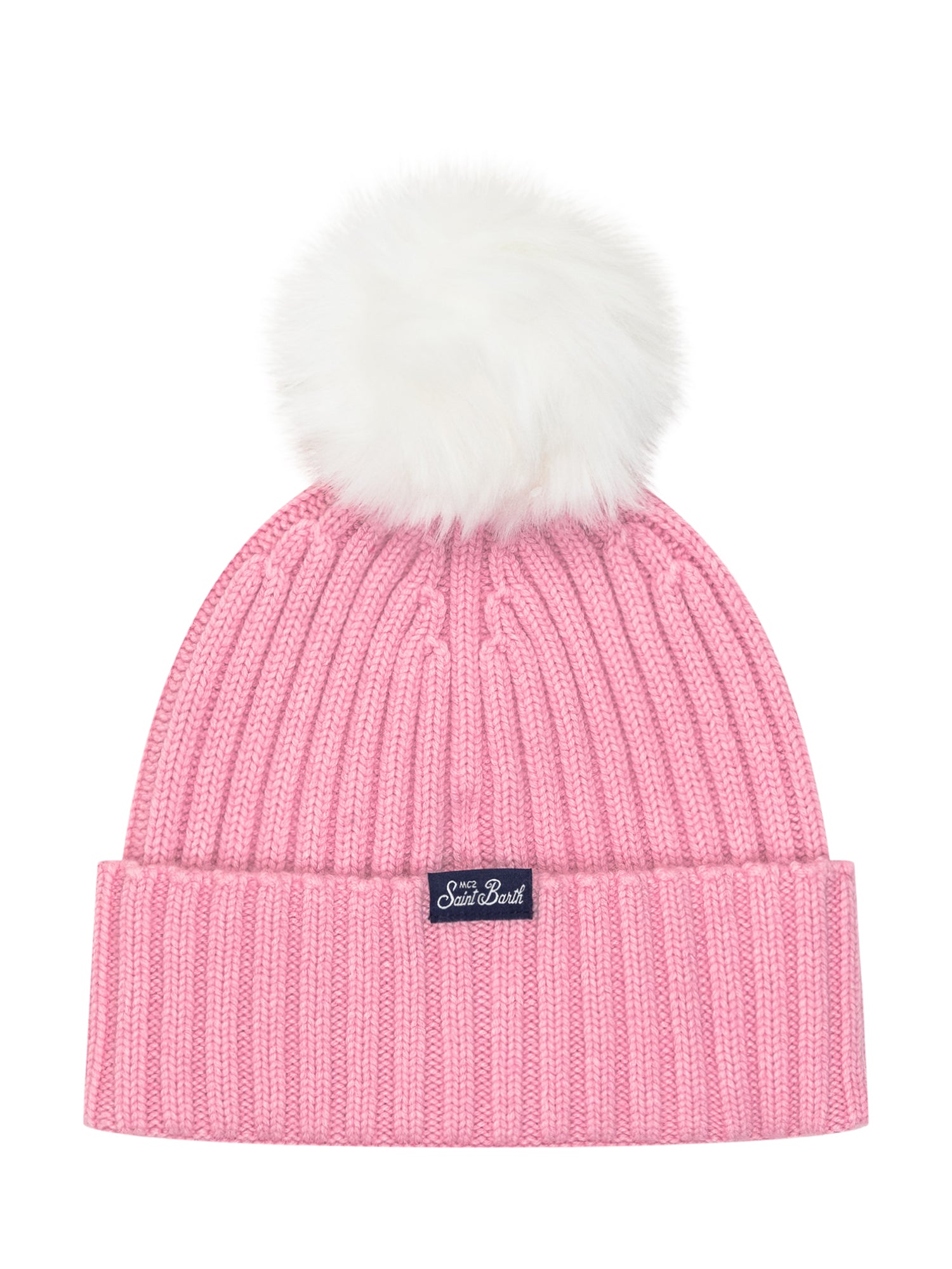 Cuffia rosa in mista lana. Pom Pom a contrasto. Scritta "Cortina" ricamata sul davanti.