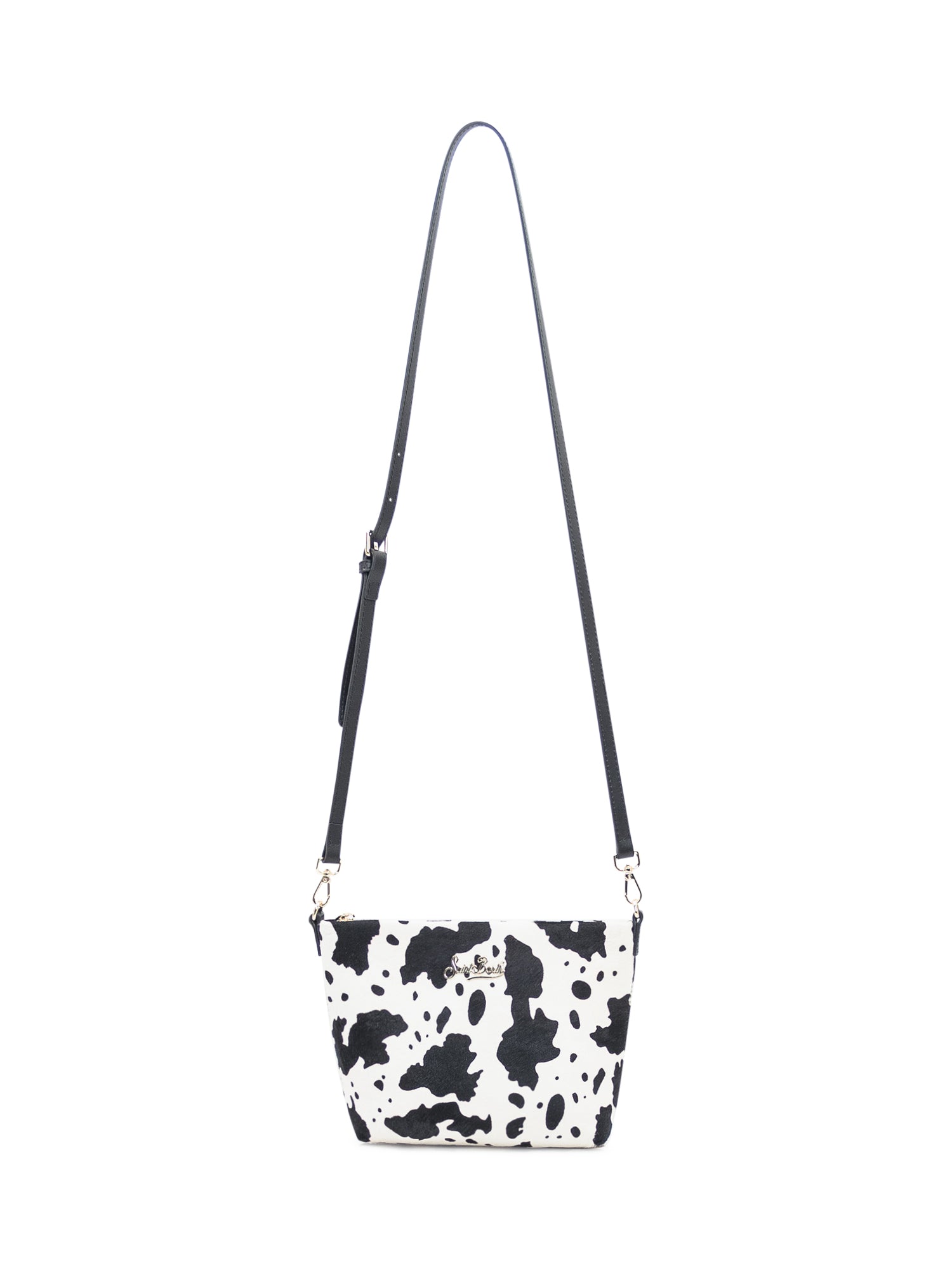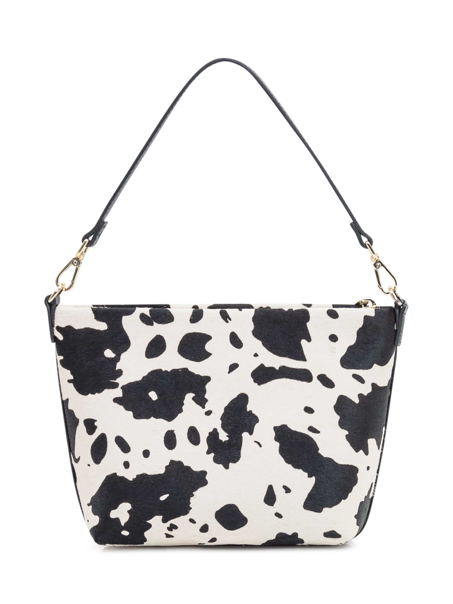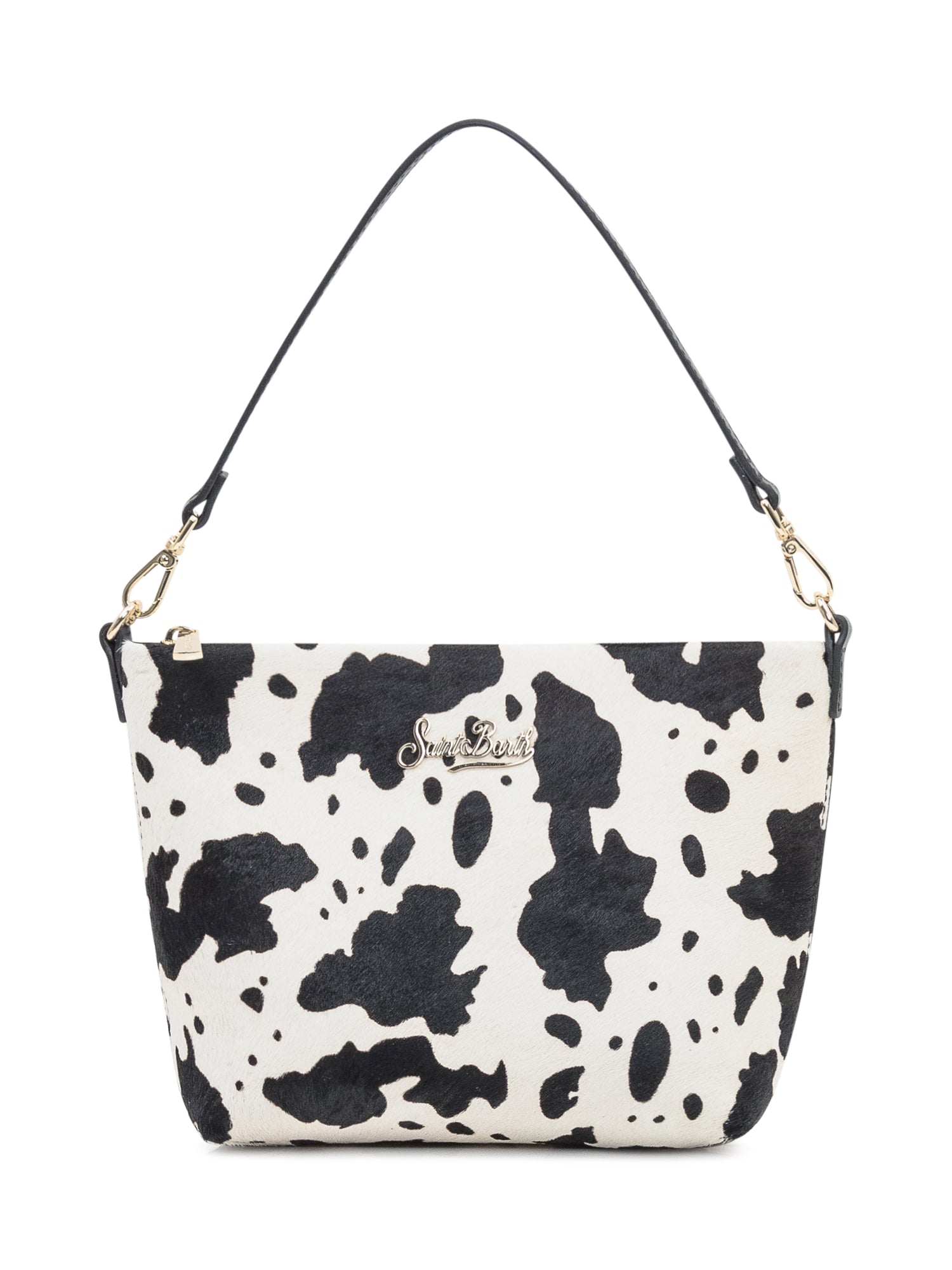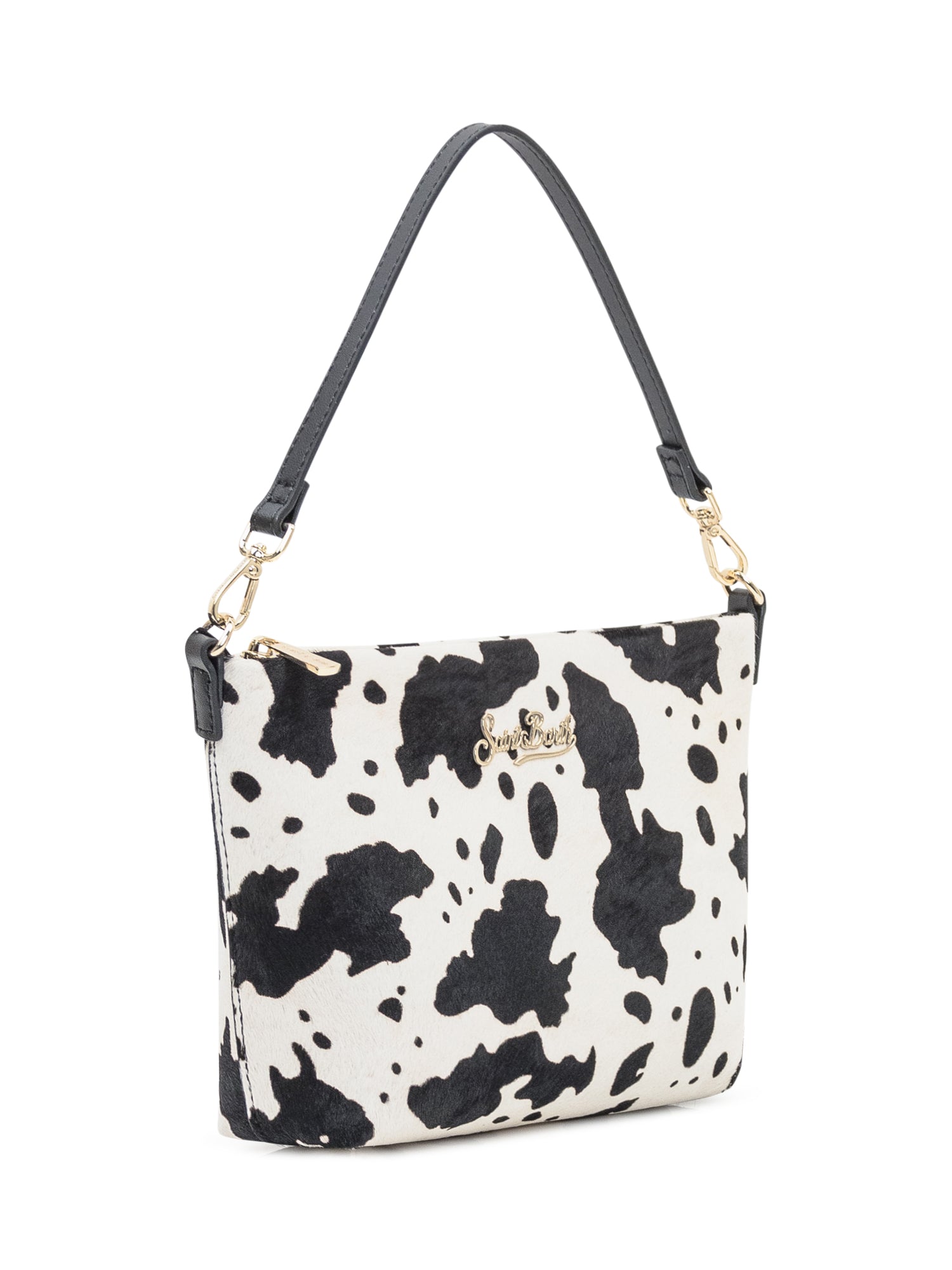 Borsa Aline MC2 Saint Barth in cavallino sintetico con fantasia maculata bianco e nero, manico a spalla rimovibile e logo frontale.