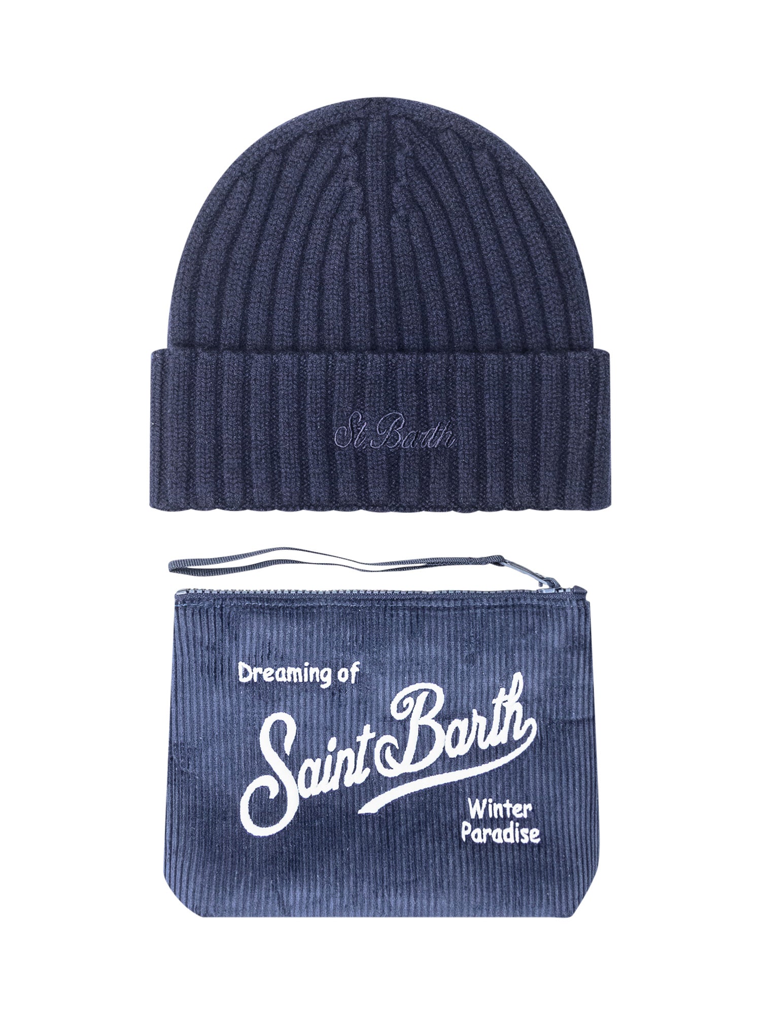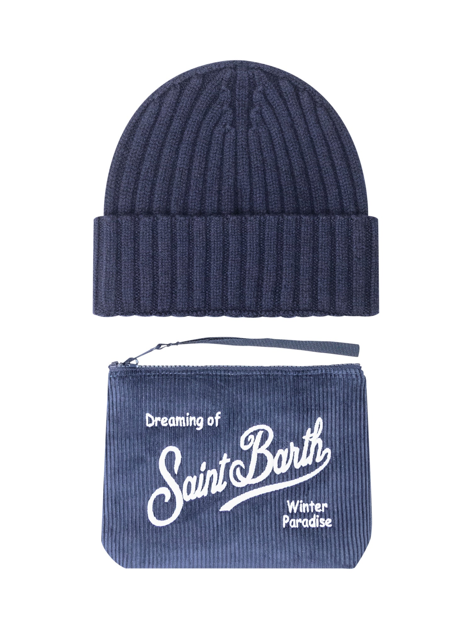 Christmas Box MC2 Saint Barth con cuffia in maglia blu navy e pochette in velluto a coste con logo.