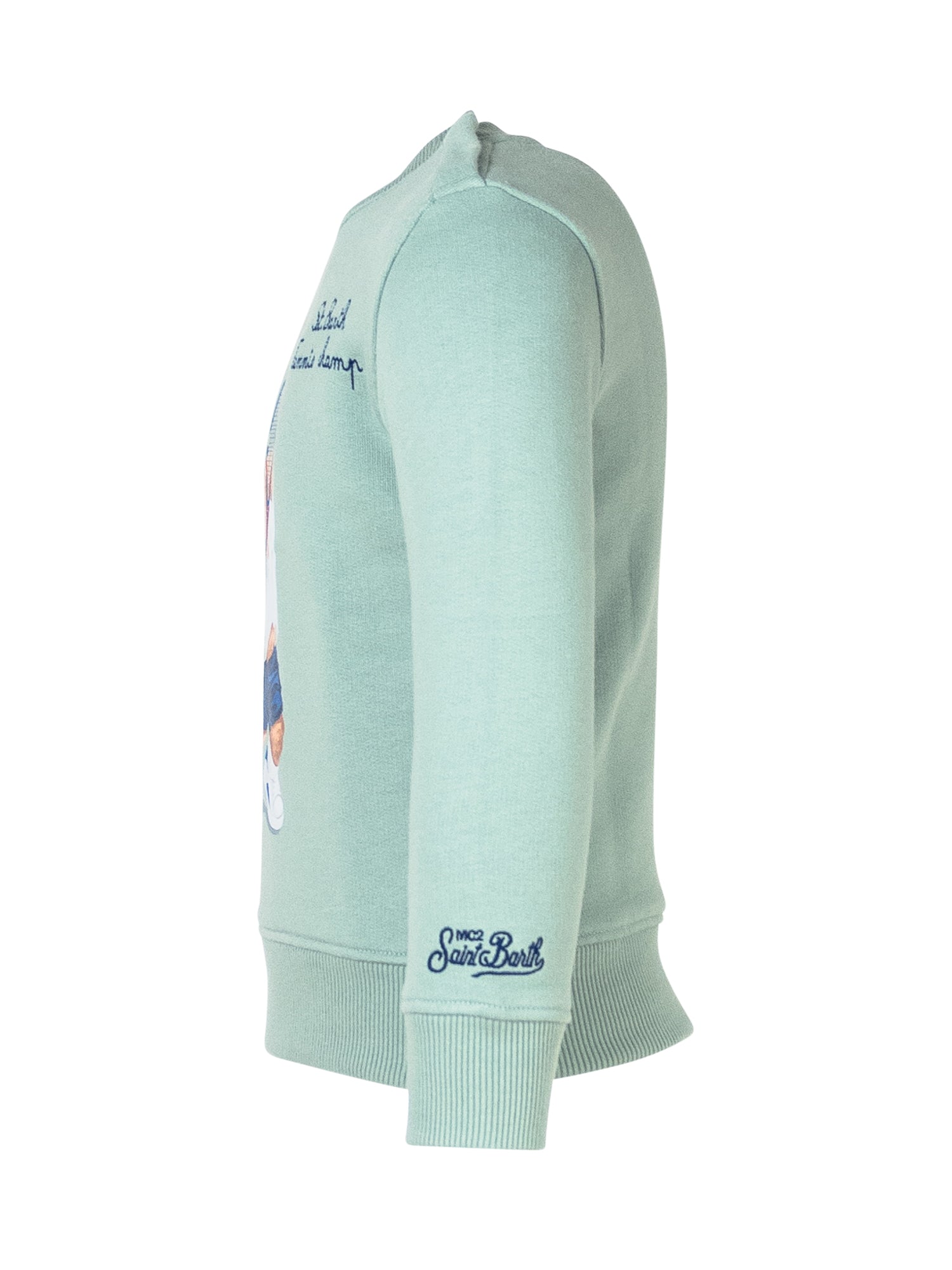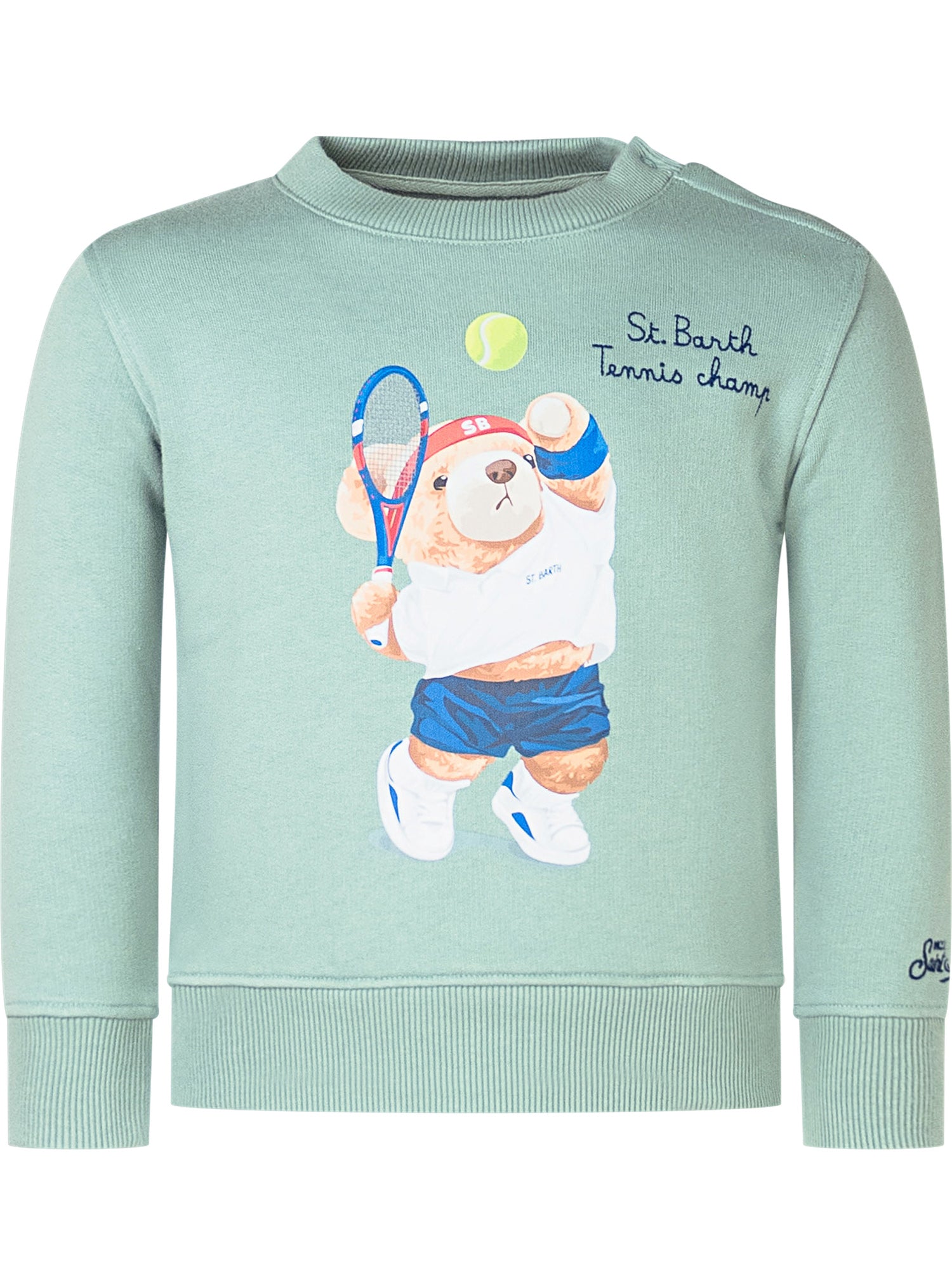 Felpa MC2 Saint Barth Kids in cotone verde con stampa orsetto tennista e scritta ricamata St. Barth Tennis Champ.