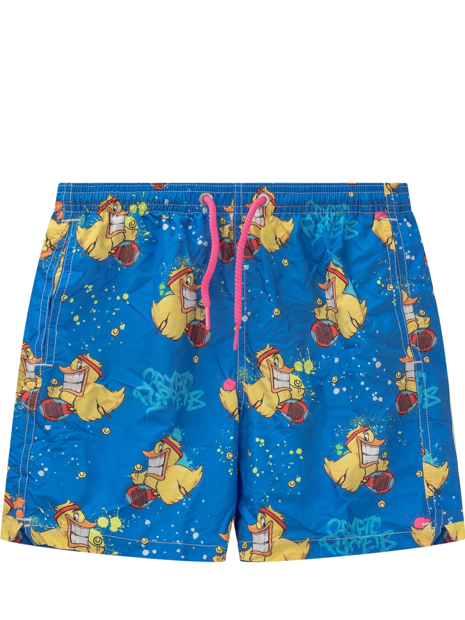 Shorts costume blu. Elastico e coulisse in vita. Due tasche. Tasca sul retro con patta. Stampa all-over.