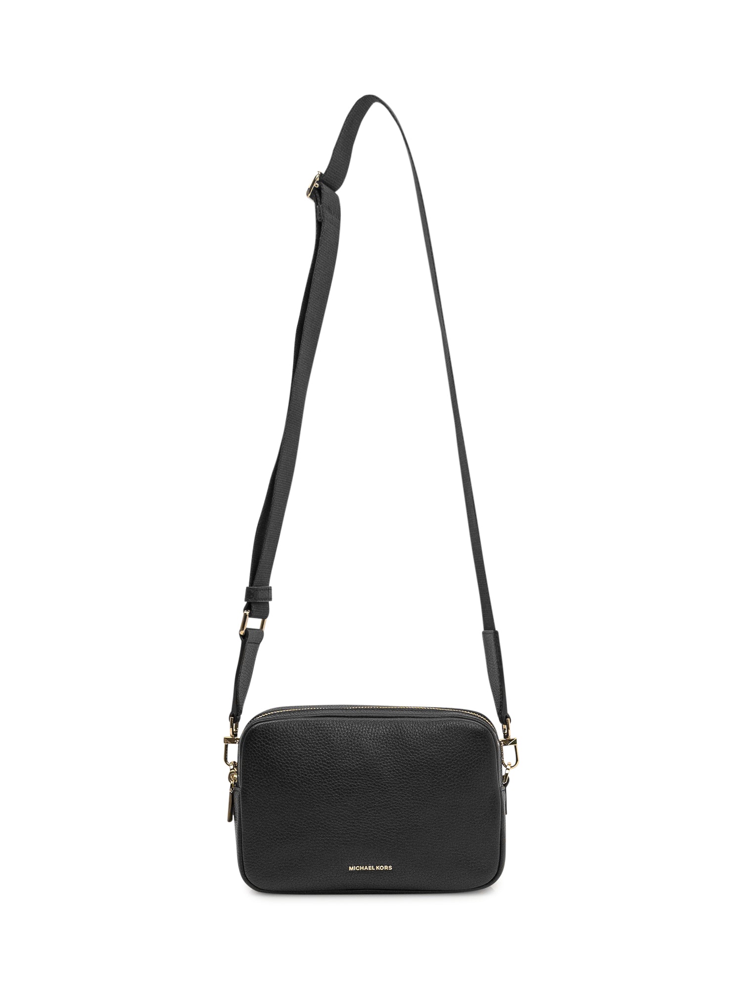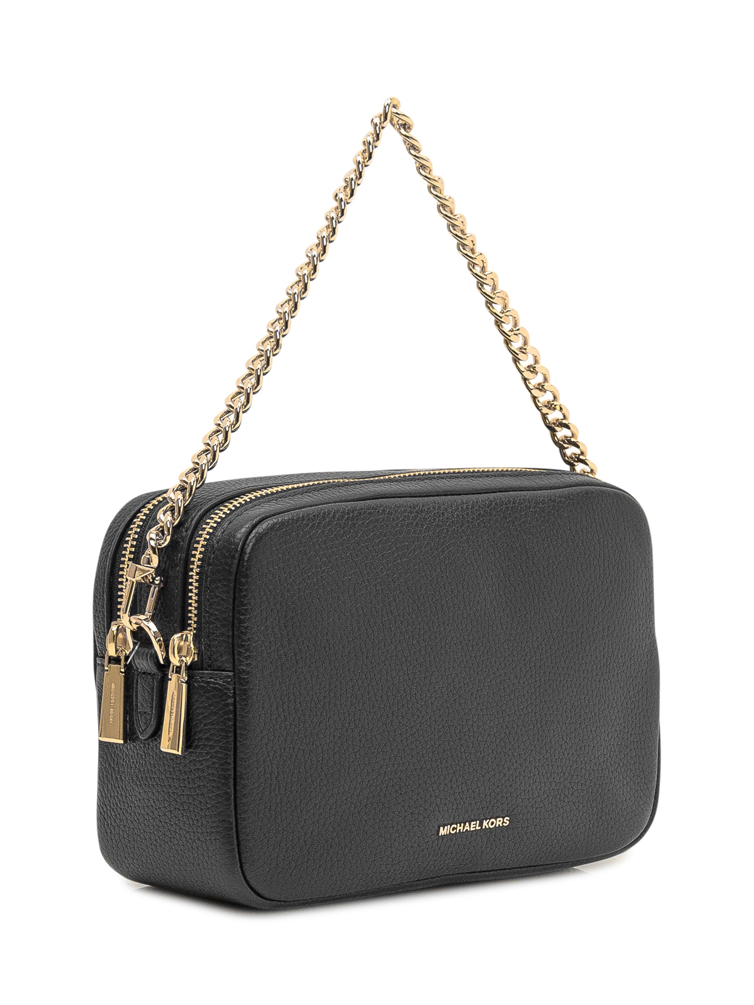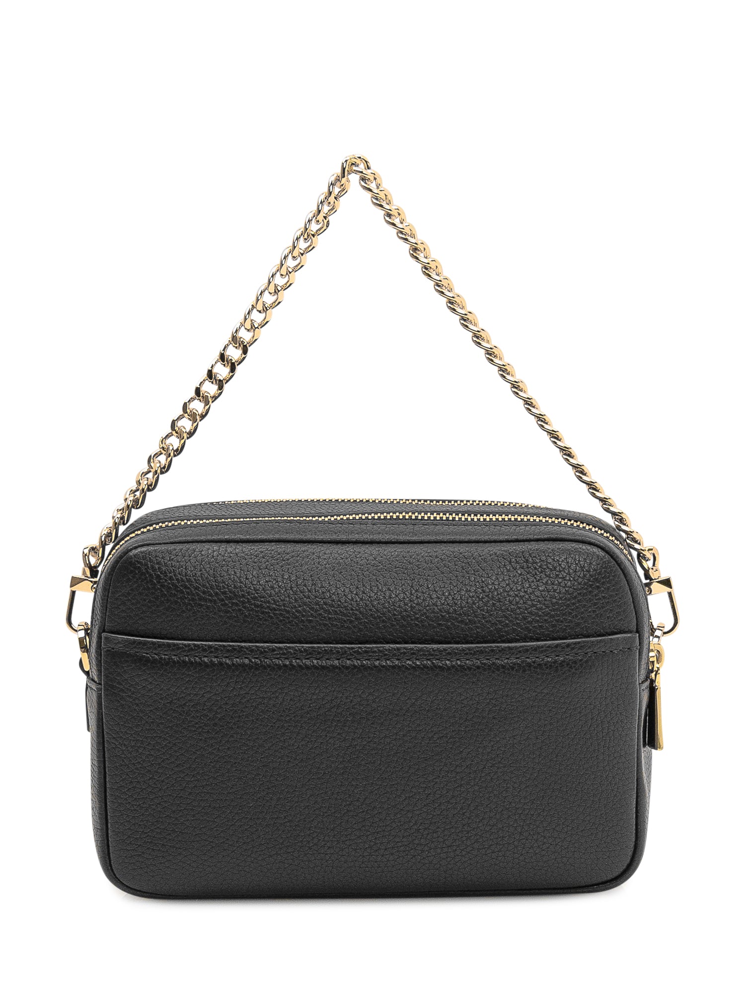 Borsa Michael Kors in pelle nera martellata con catena dorata e logo frontale.