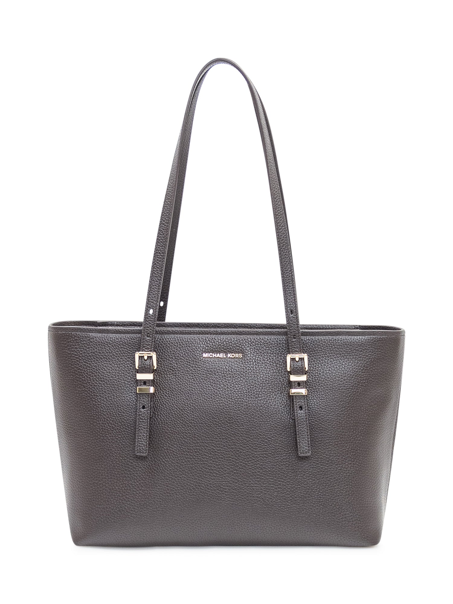 Borsa shopper Michael Kors nera in pelle martellata con doppi manici regolabili e logo frontale.