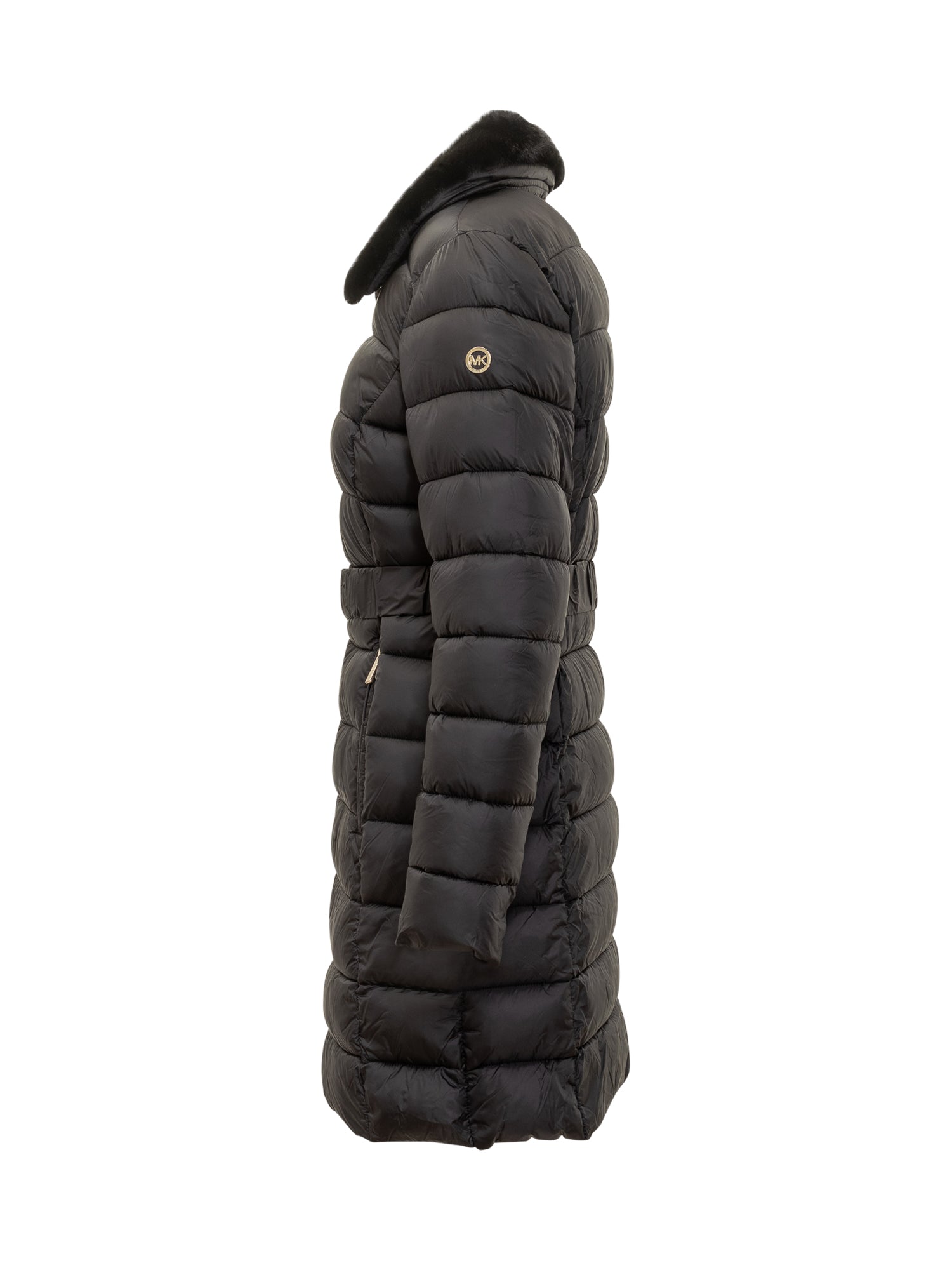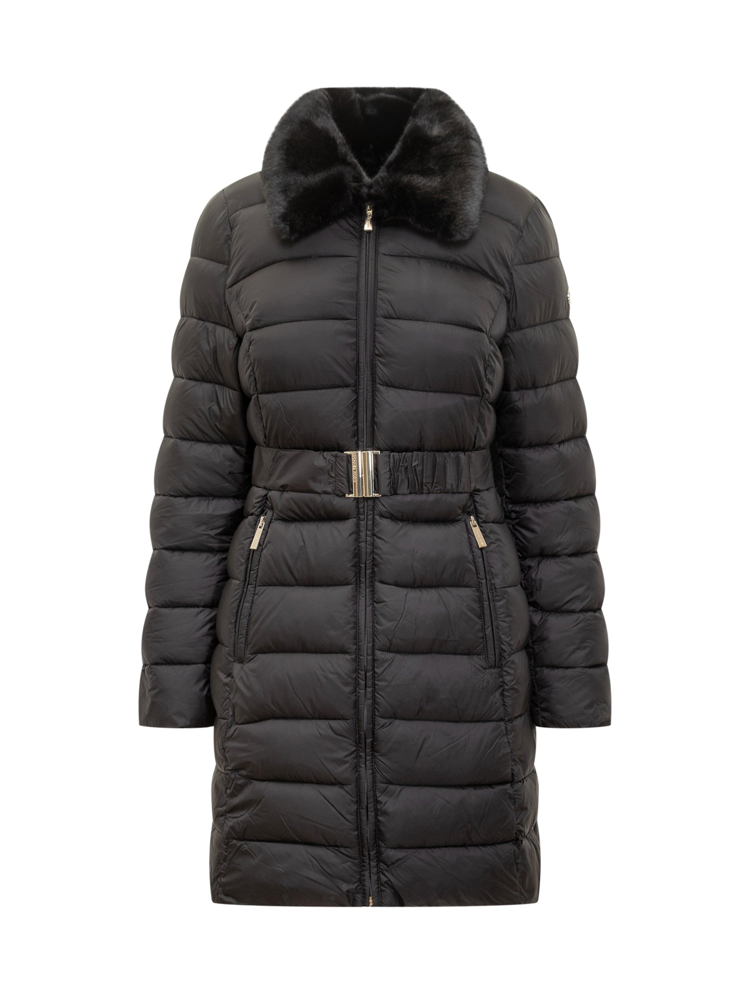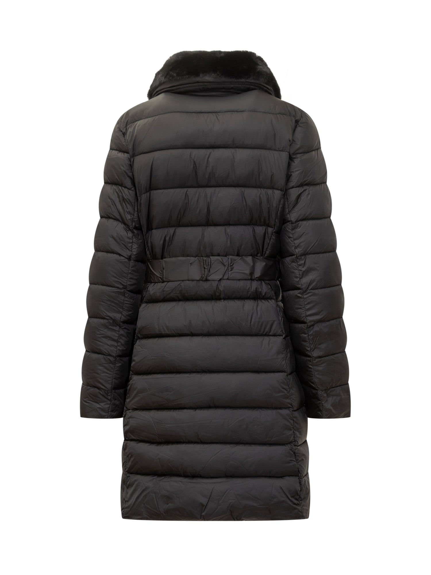 Piumino lungo nero con cintura in vita e collo in pelliccia. Dotato di zip frontale e tasche con chiusura a zip.