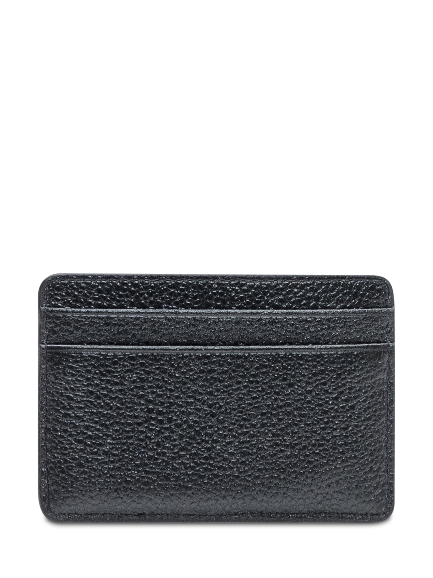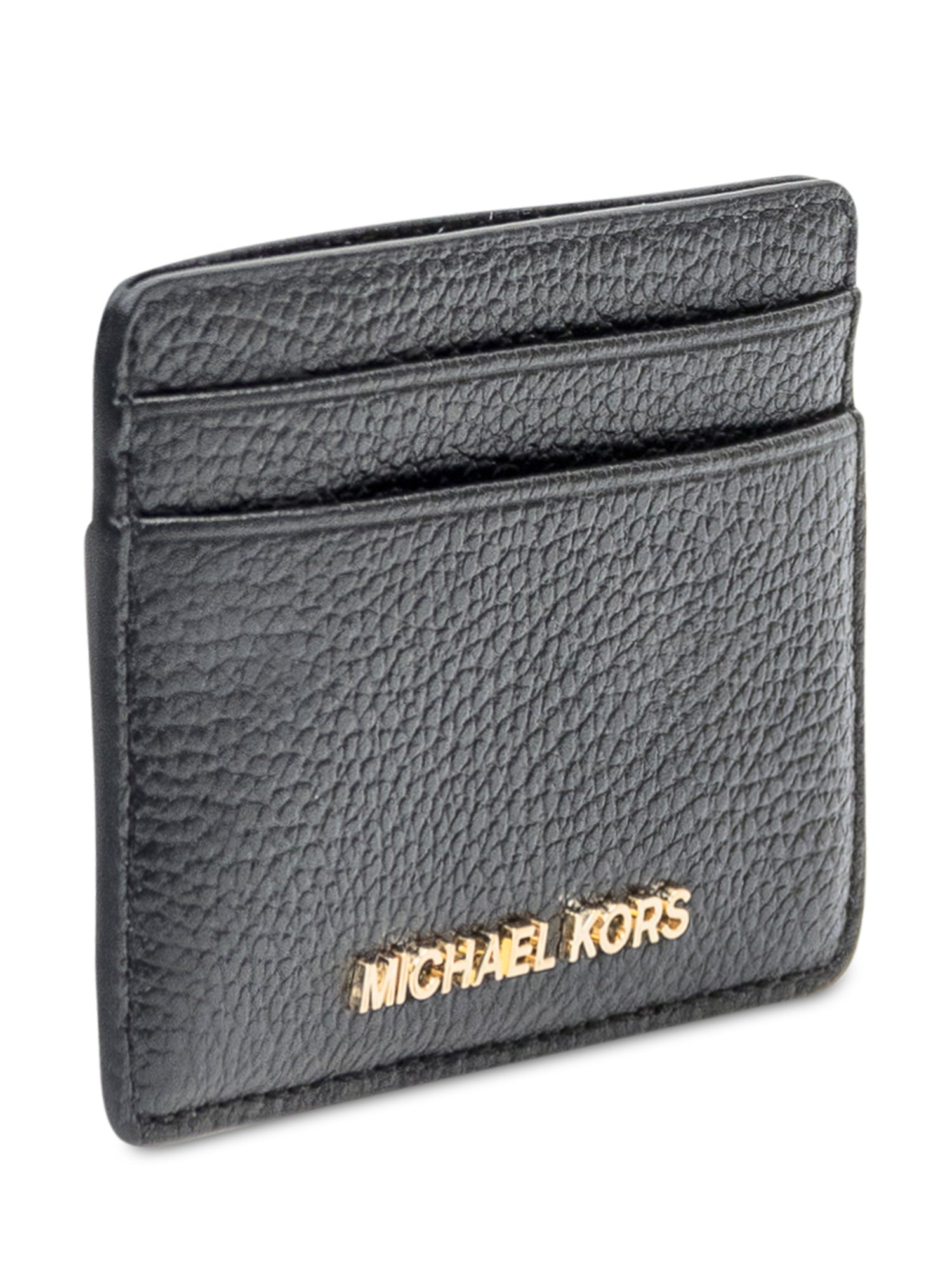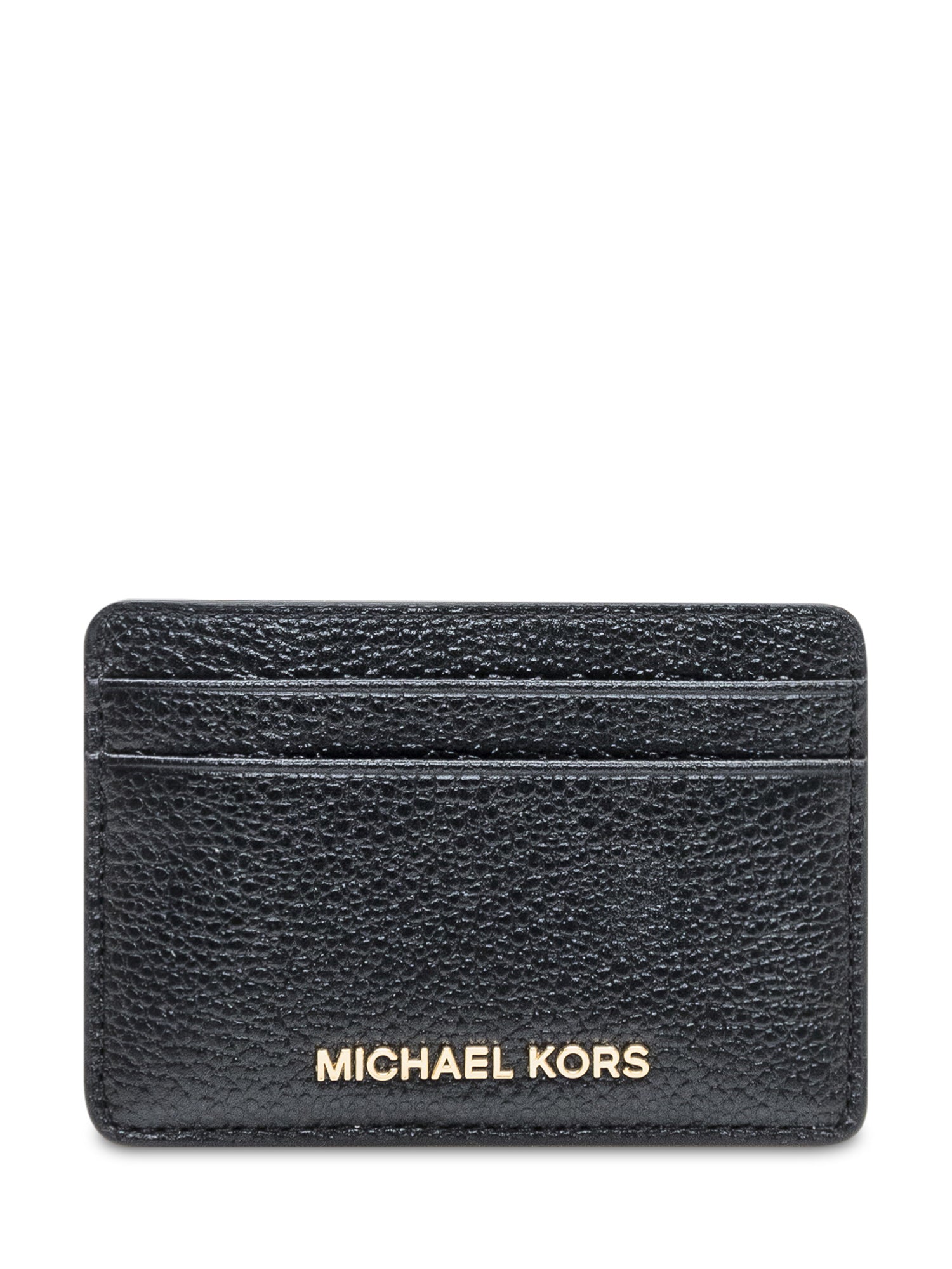 Portacarte Michael Kors in pelle nera martellata con logo frontale dorato. Design sottile e funzionale.