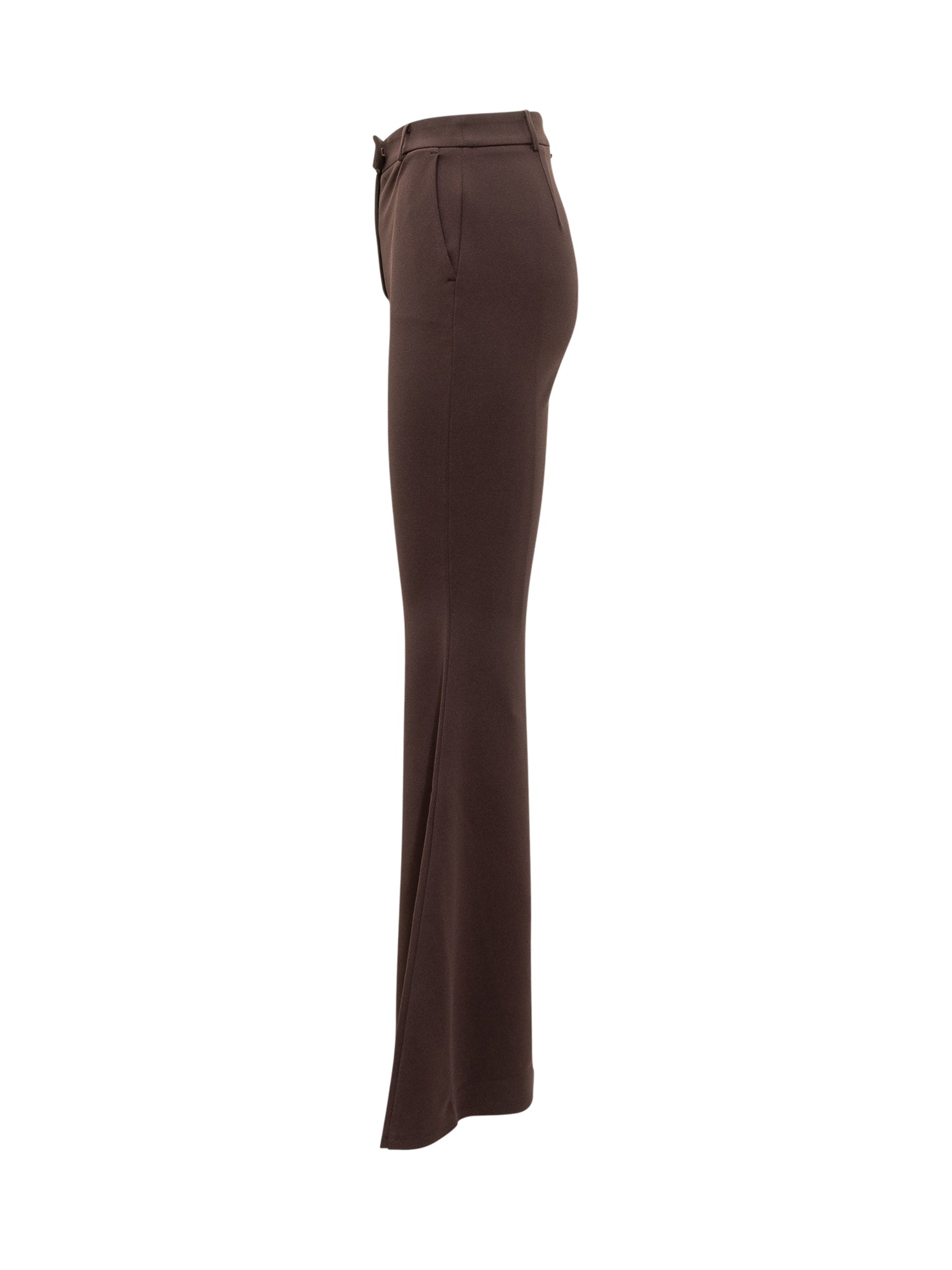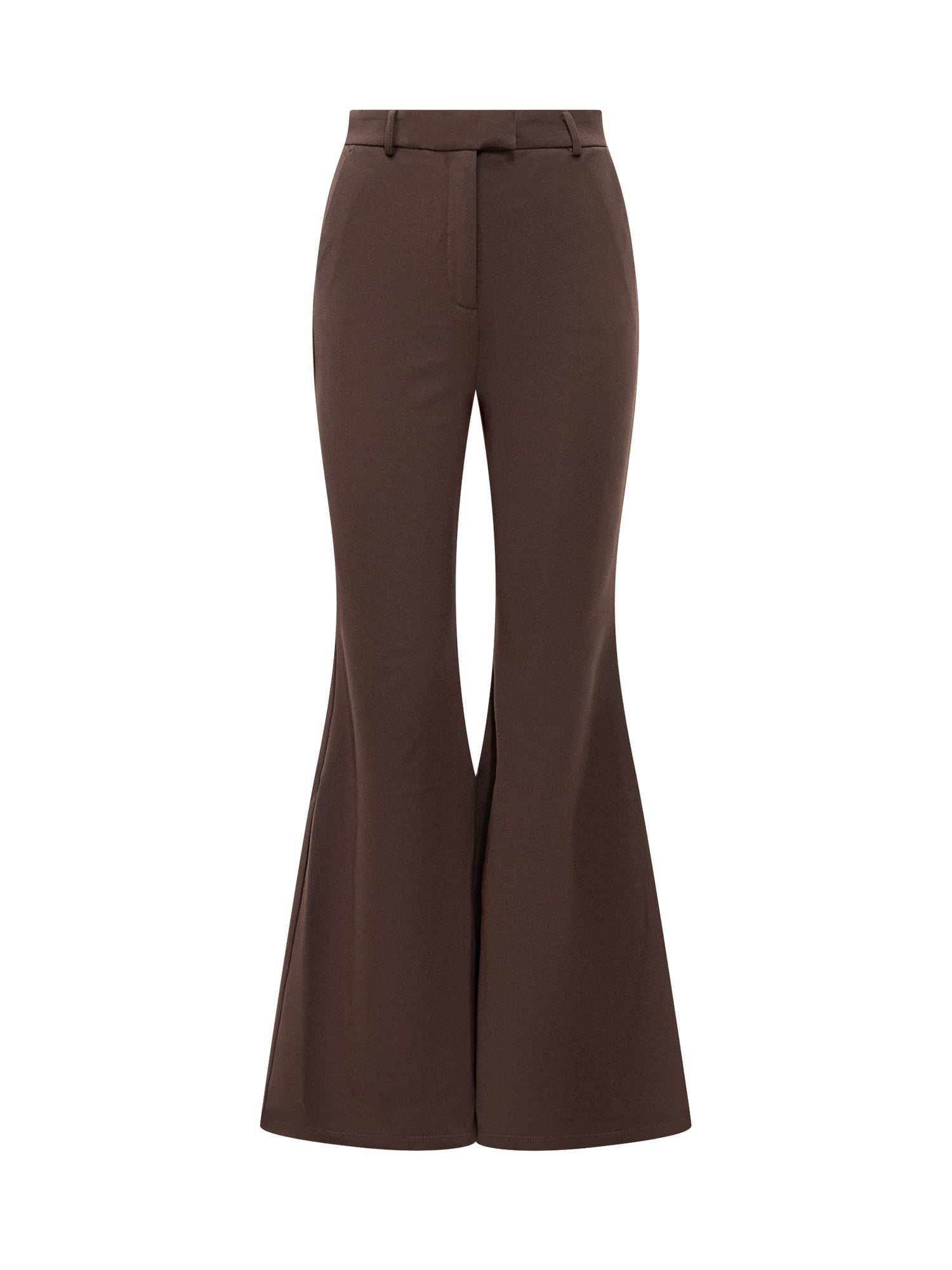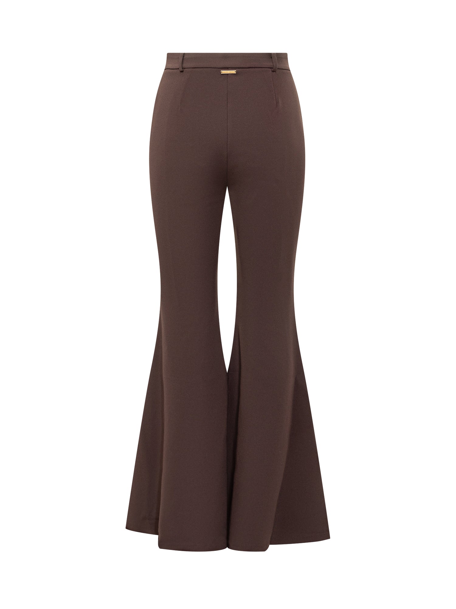 Pantalone elegante a vita alta con linea svasata, realizzato in tessuto stretch marrone.