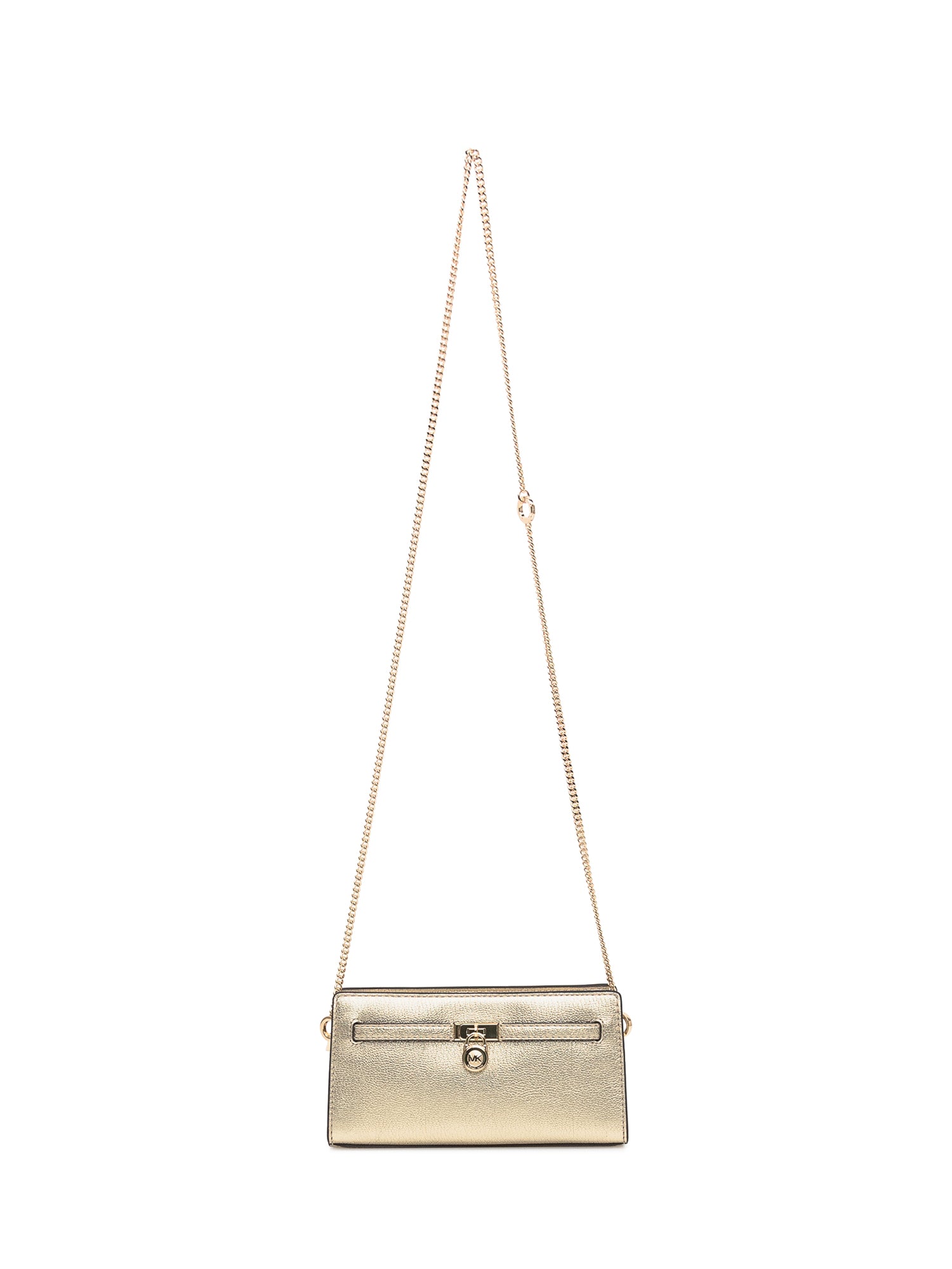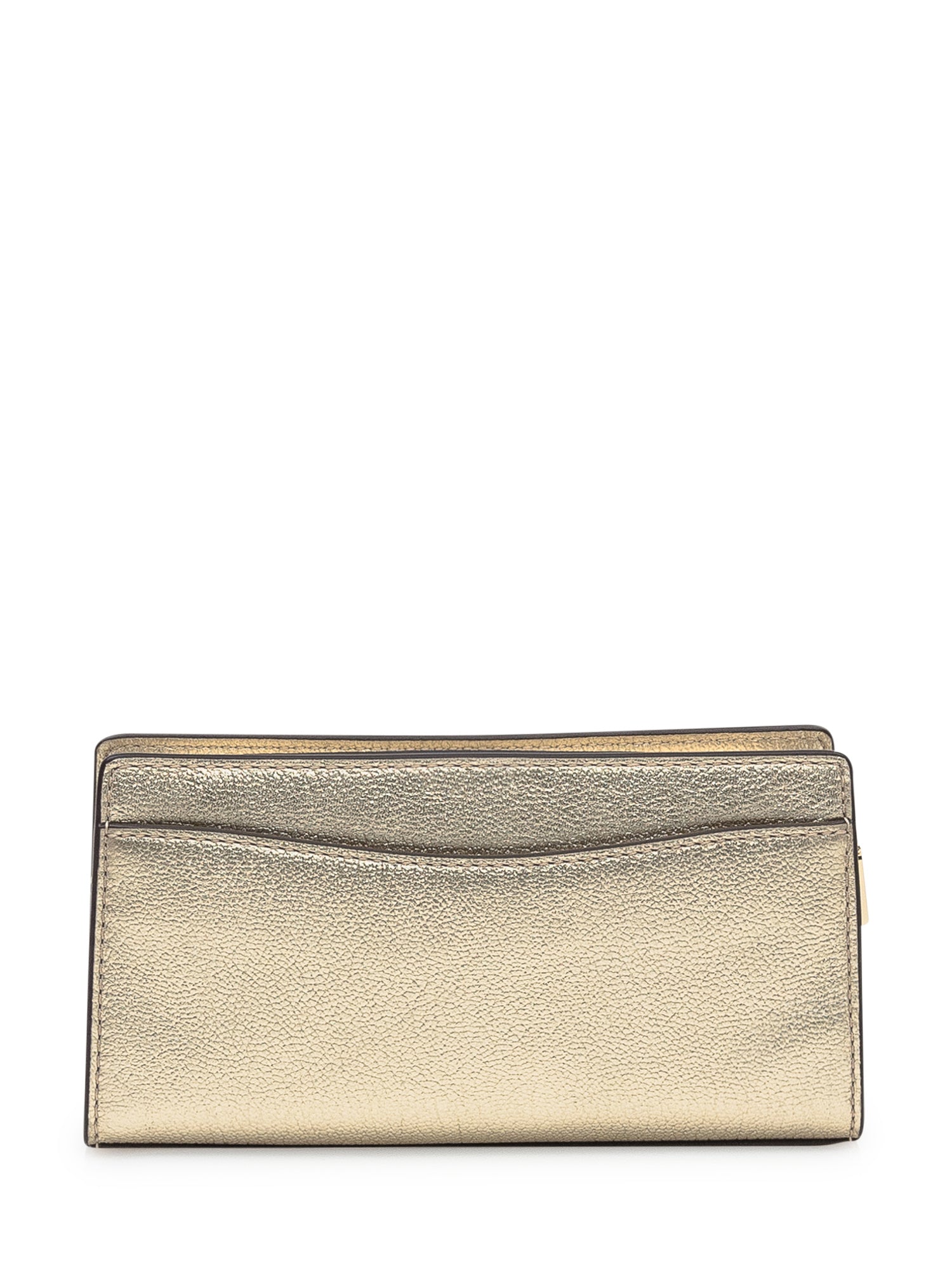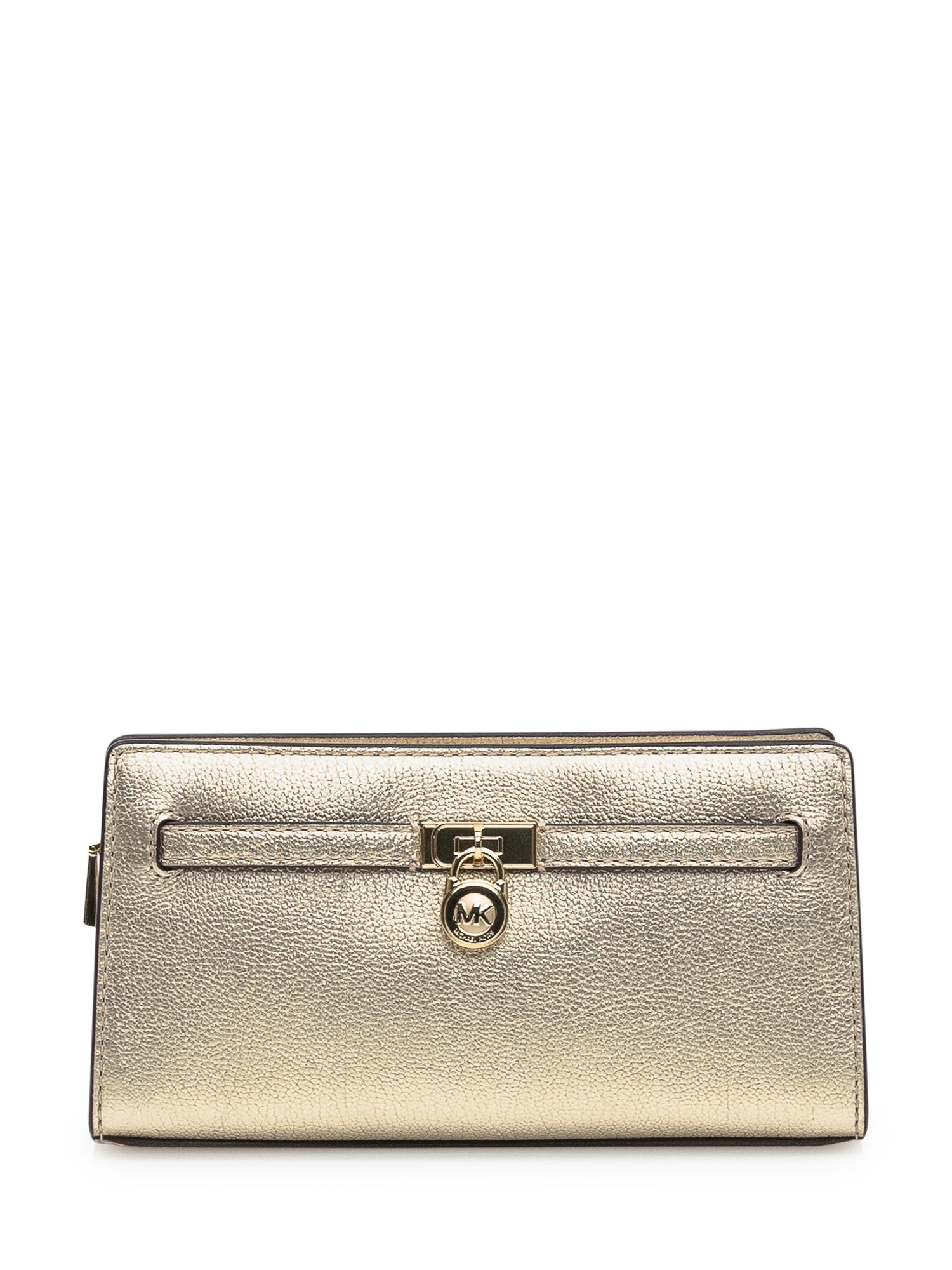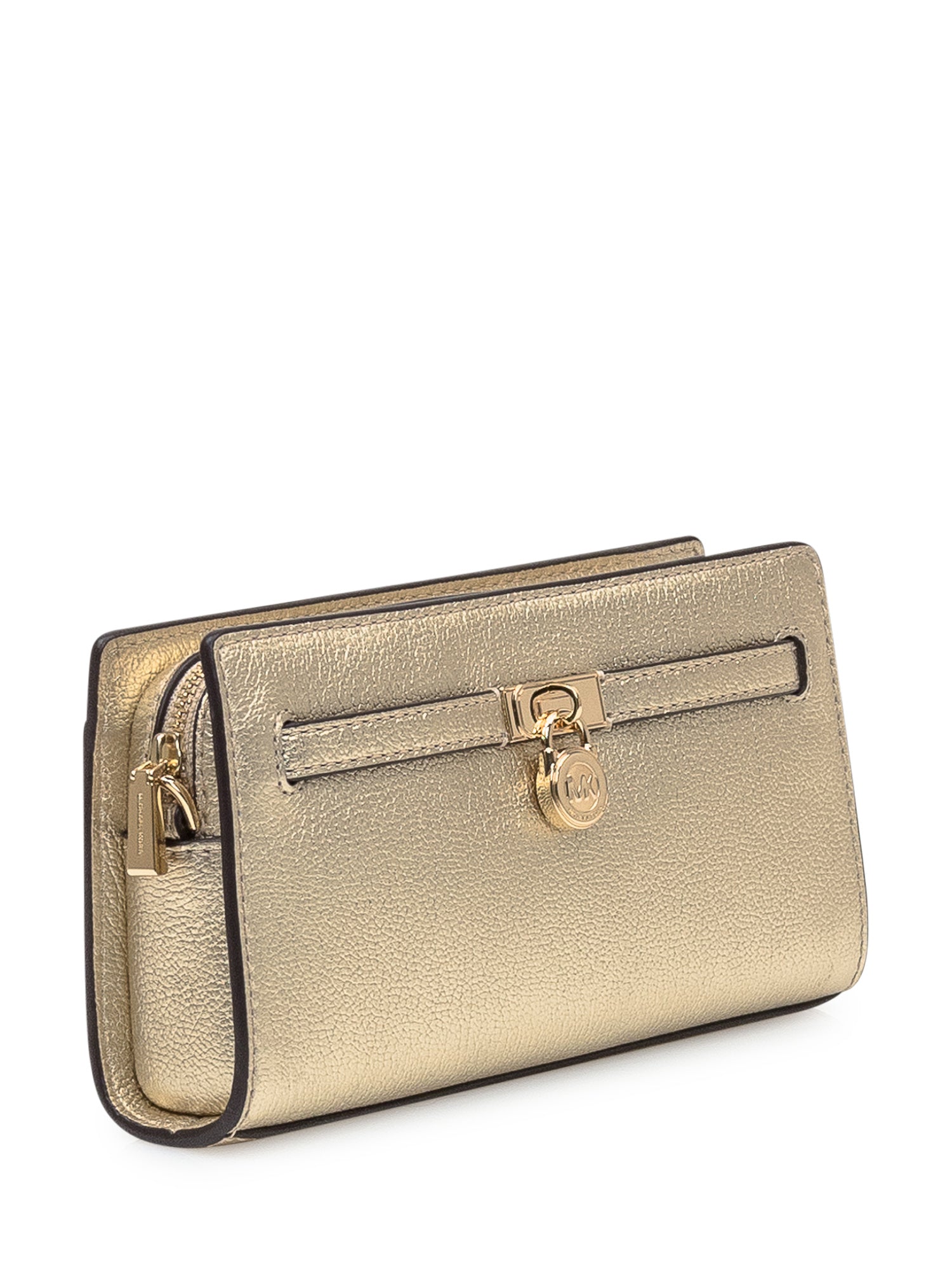 Elegante portafoglio Michael Kors in pelle metallizzata oro, con chiusura a zip e charm logato frontale.
