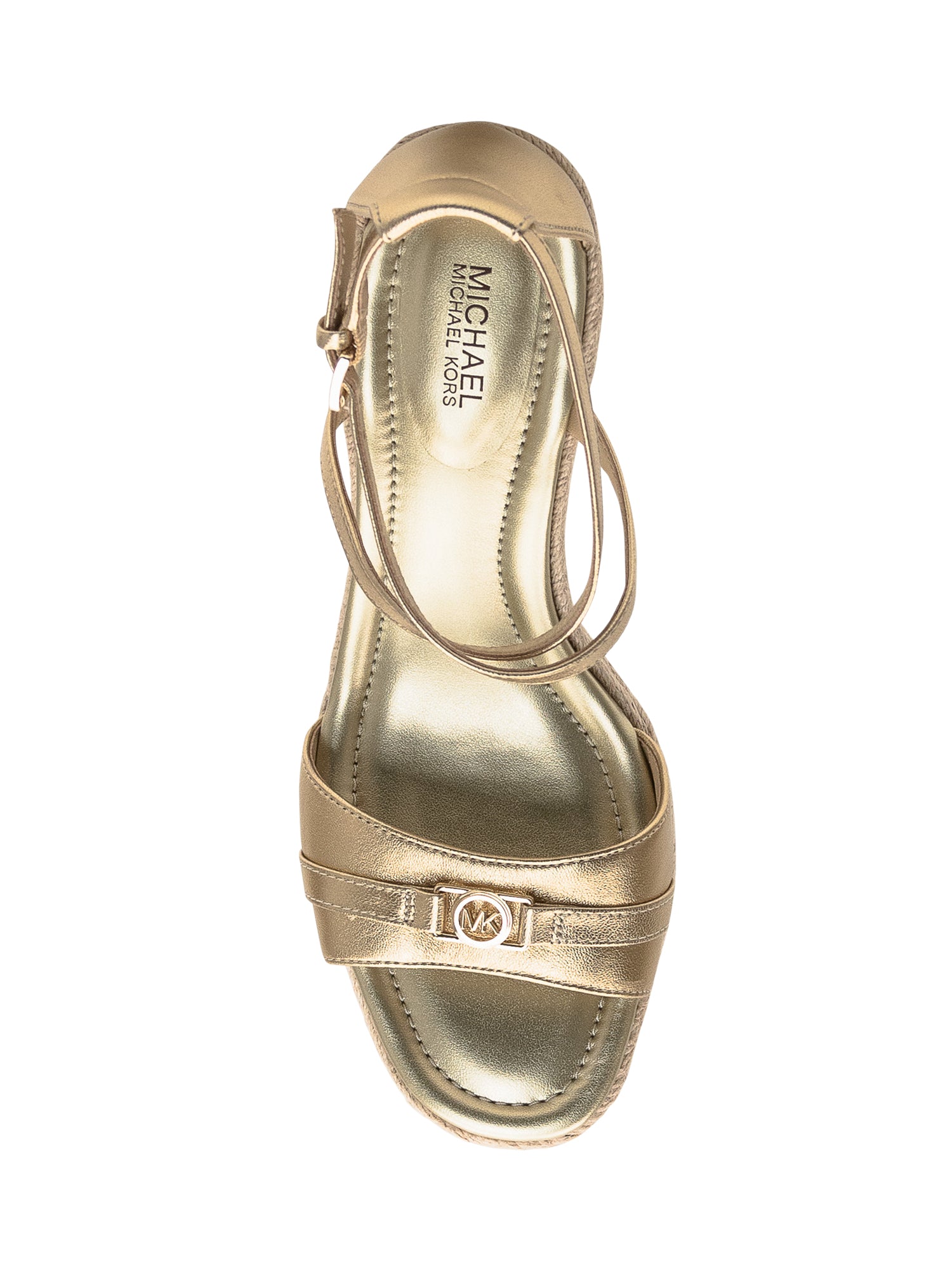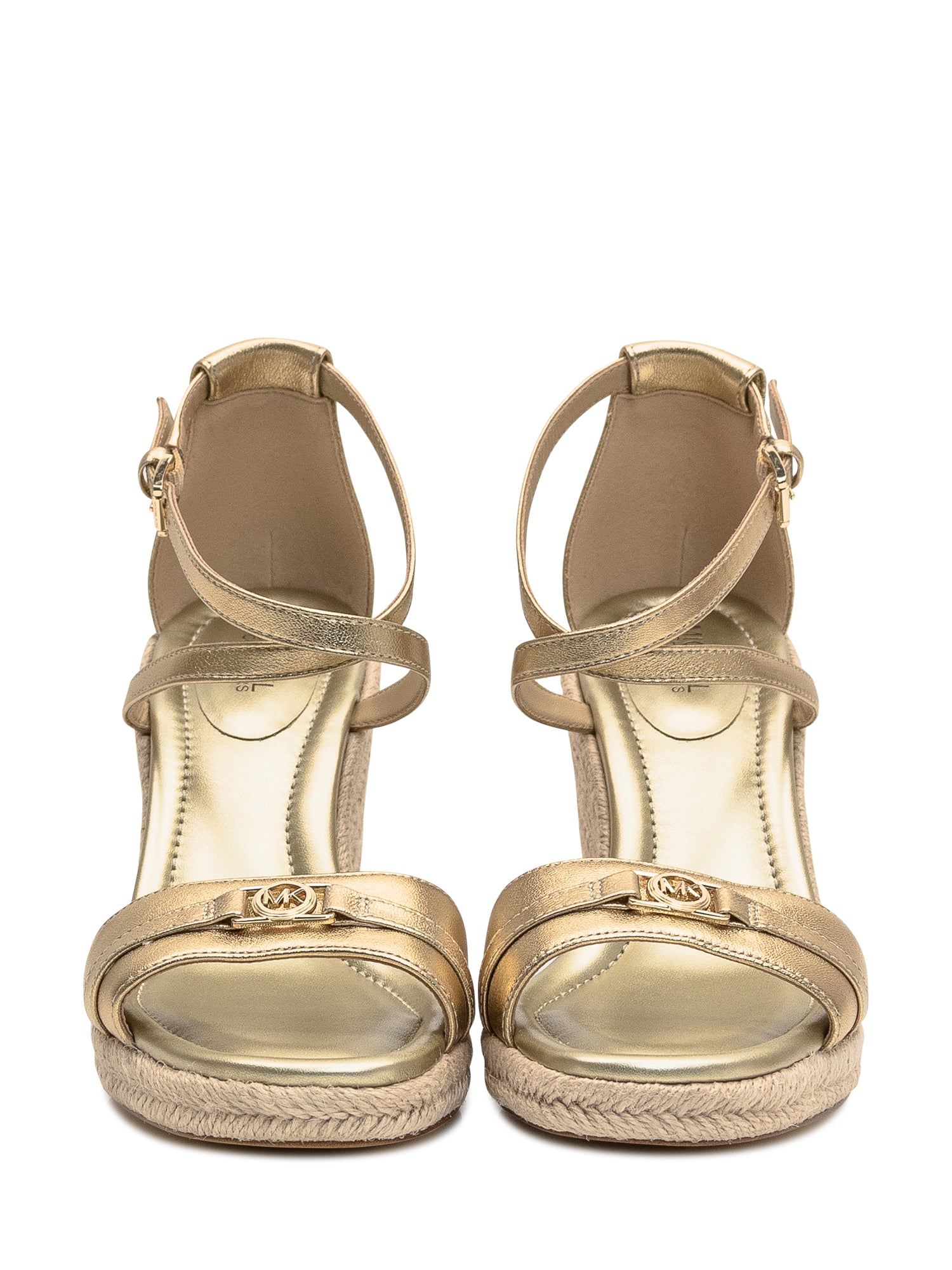 Sandalo con zappa in rafia. Stringhe di color oro. Punta aperta. Cinturino alla caviglia.