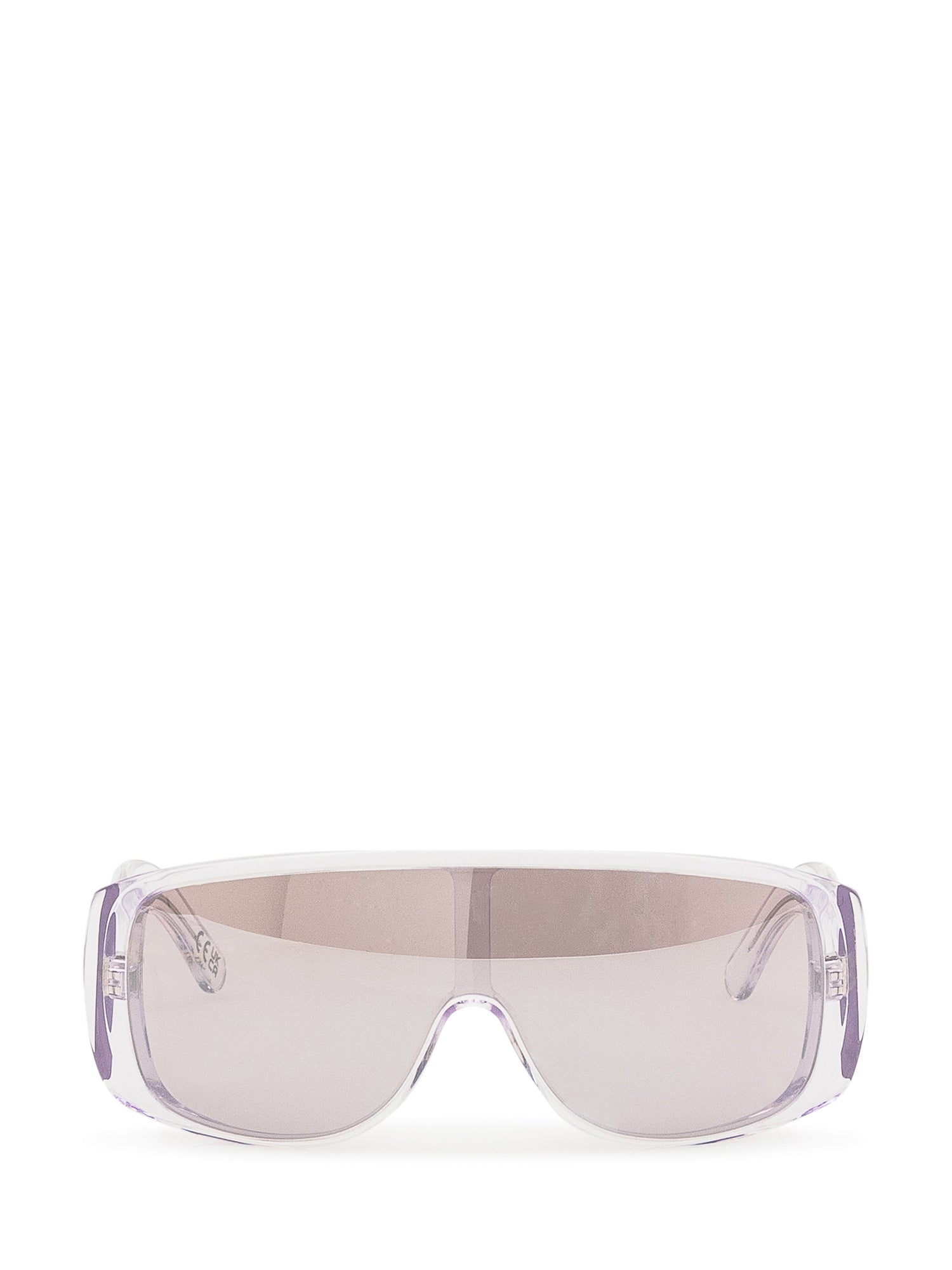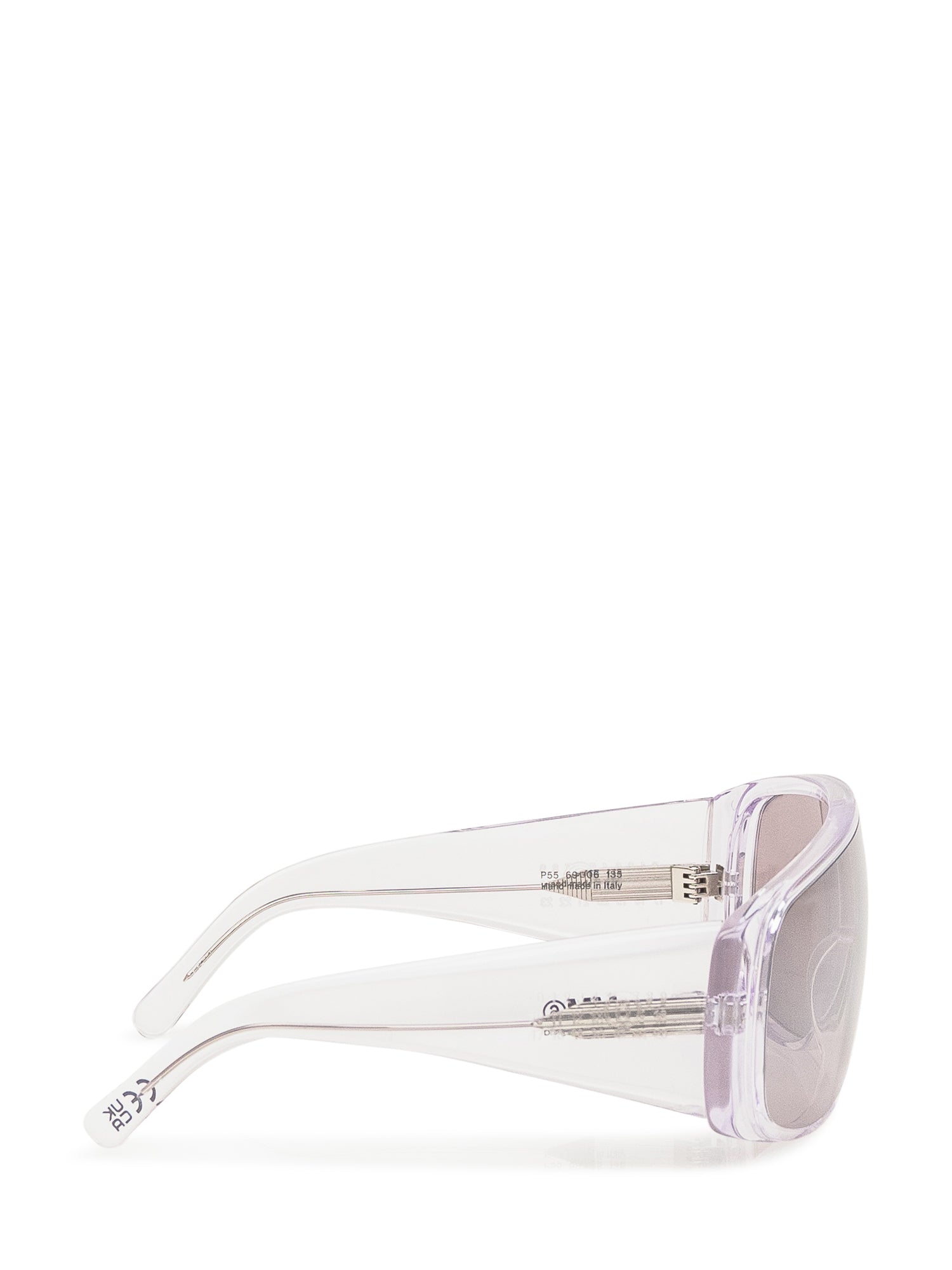 Occhiali da sole MM6 con montatura trasparente lilla e lente specchiata.