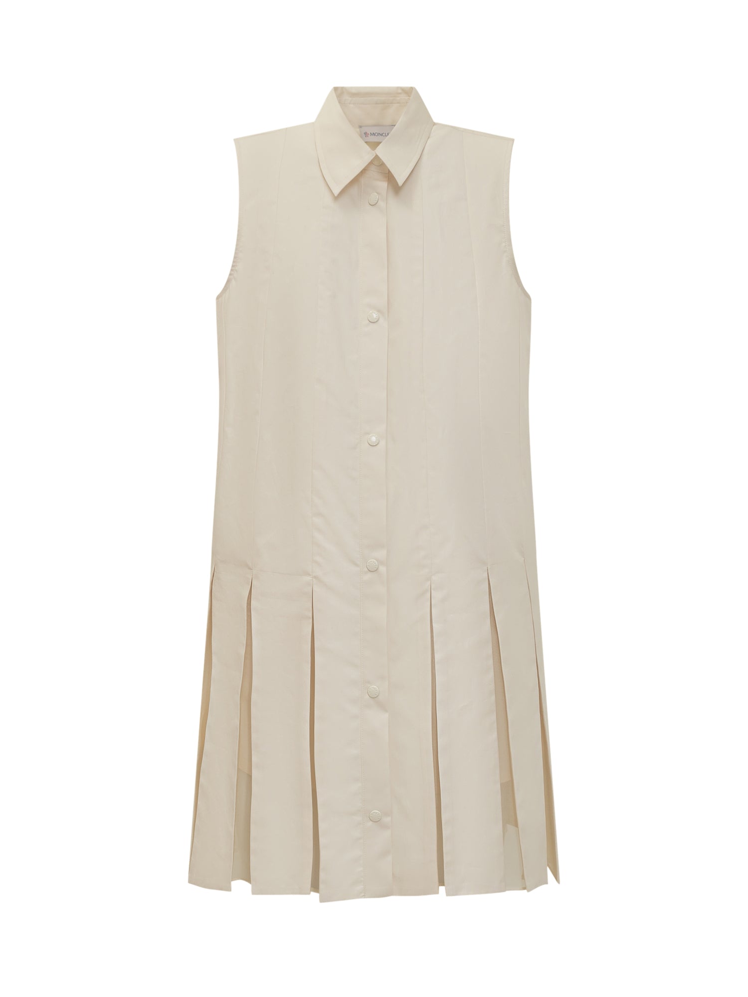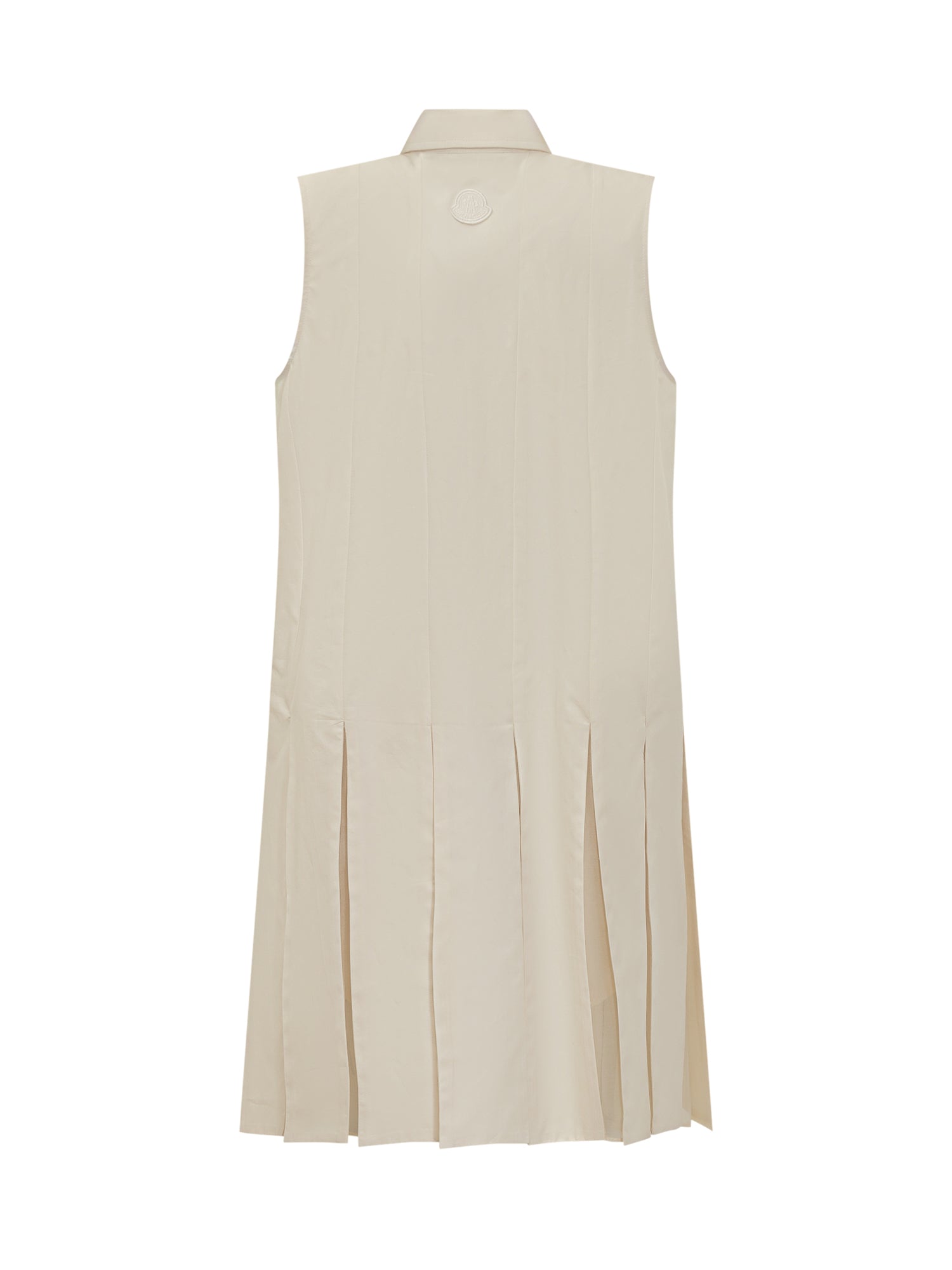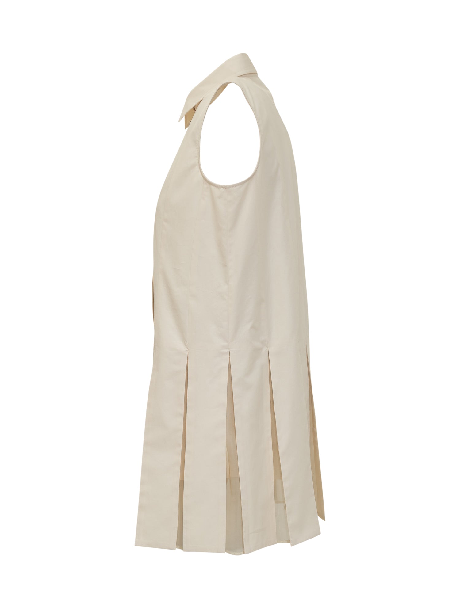 Abito corto smanicato. Collo a punta. Chiusura con bottoni. Dettagli con spacchi sul fondo. Coulotte abbinata.