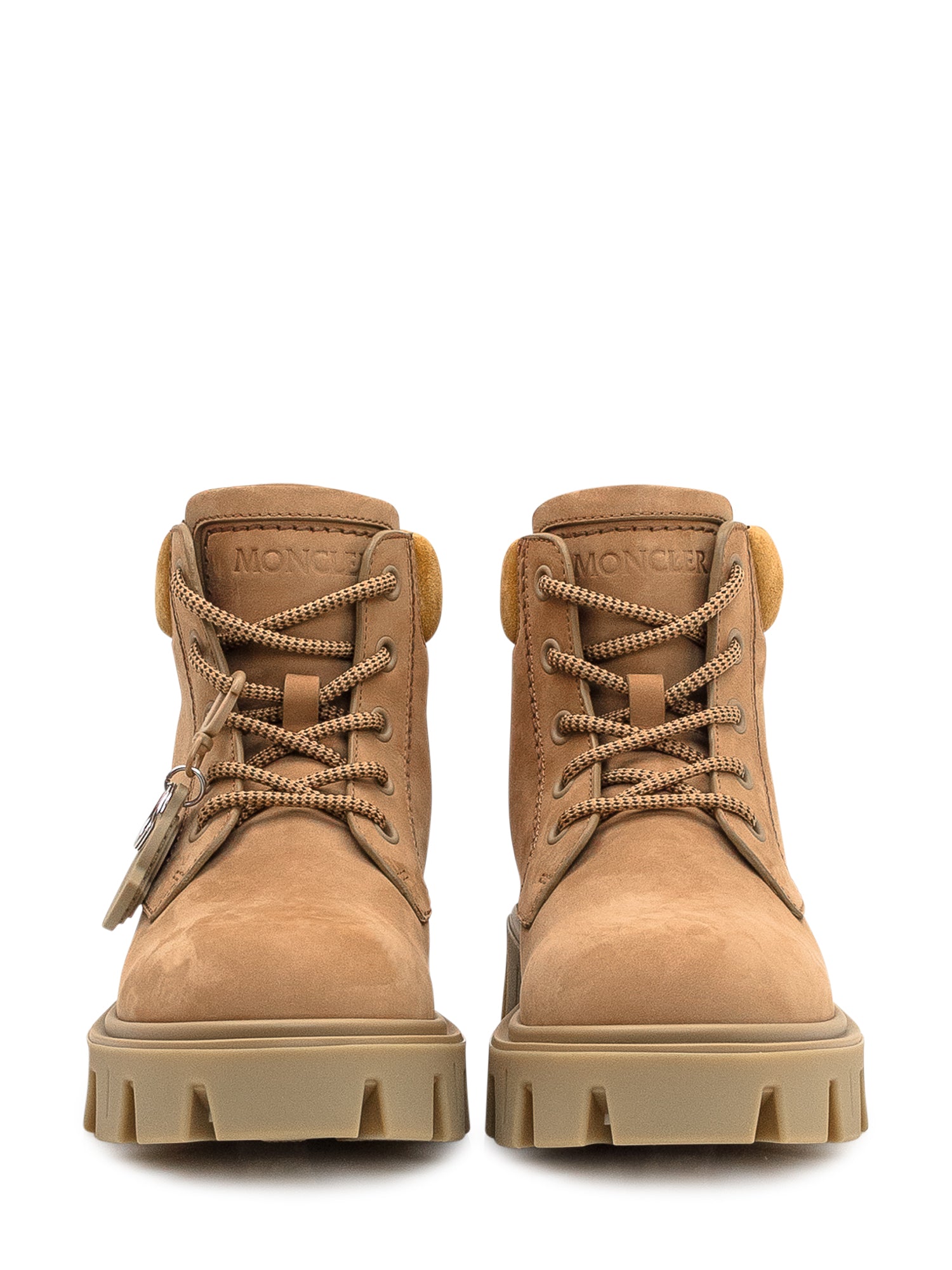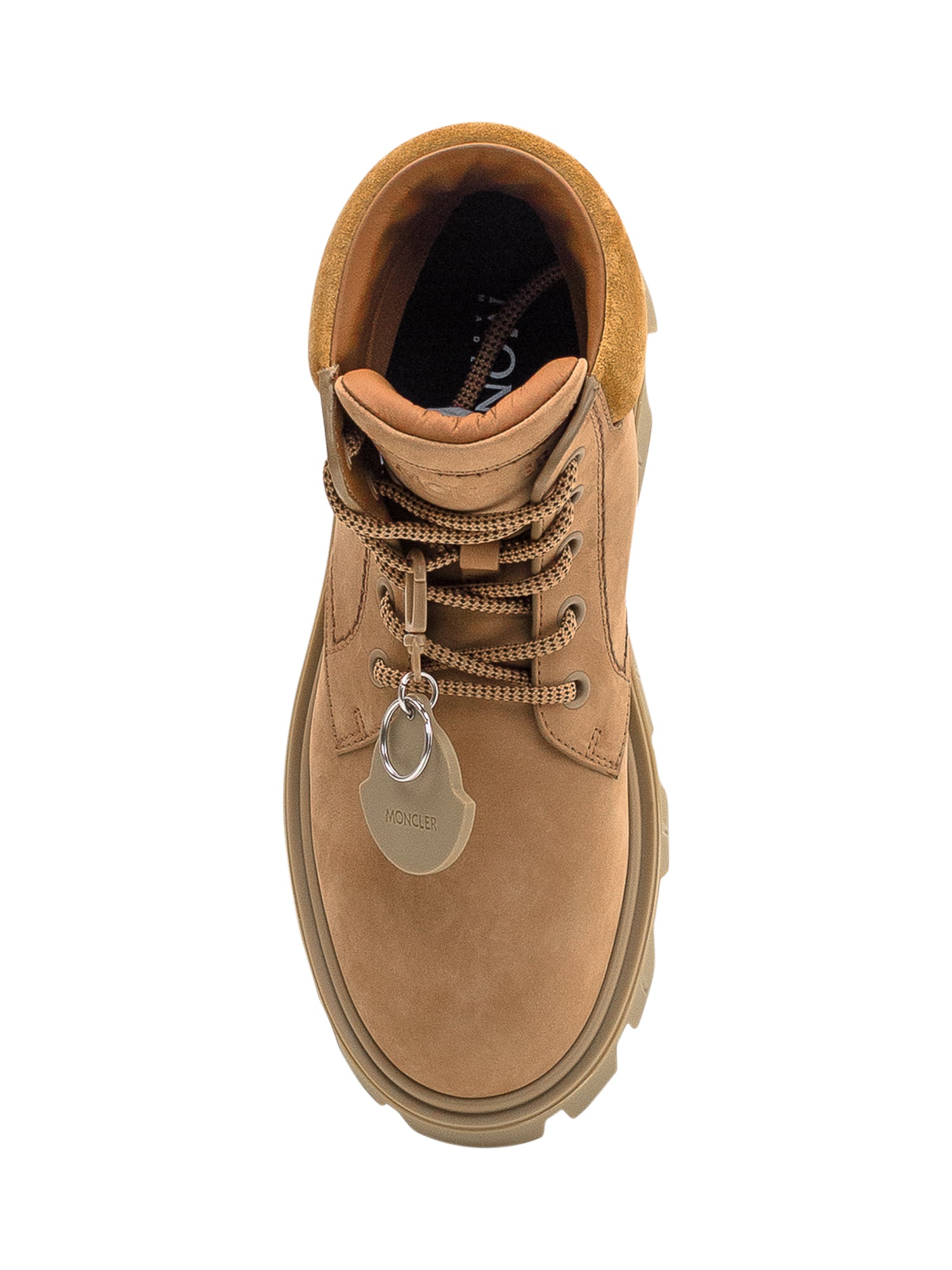 in suede color cuoio con suola chunky e dettagli imbottiti alla caviglia. Lacci di ricambio verde militare.