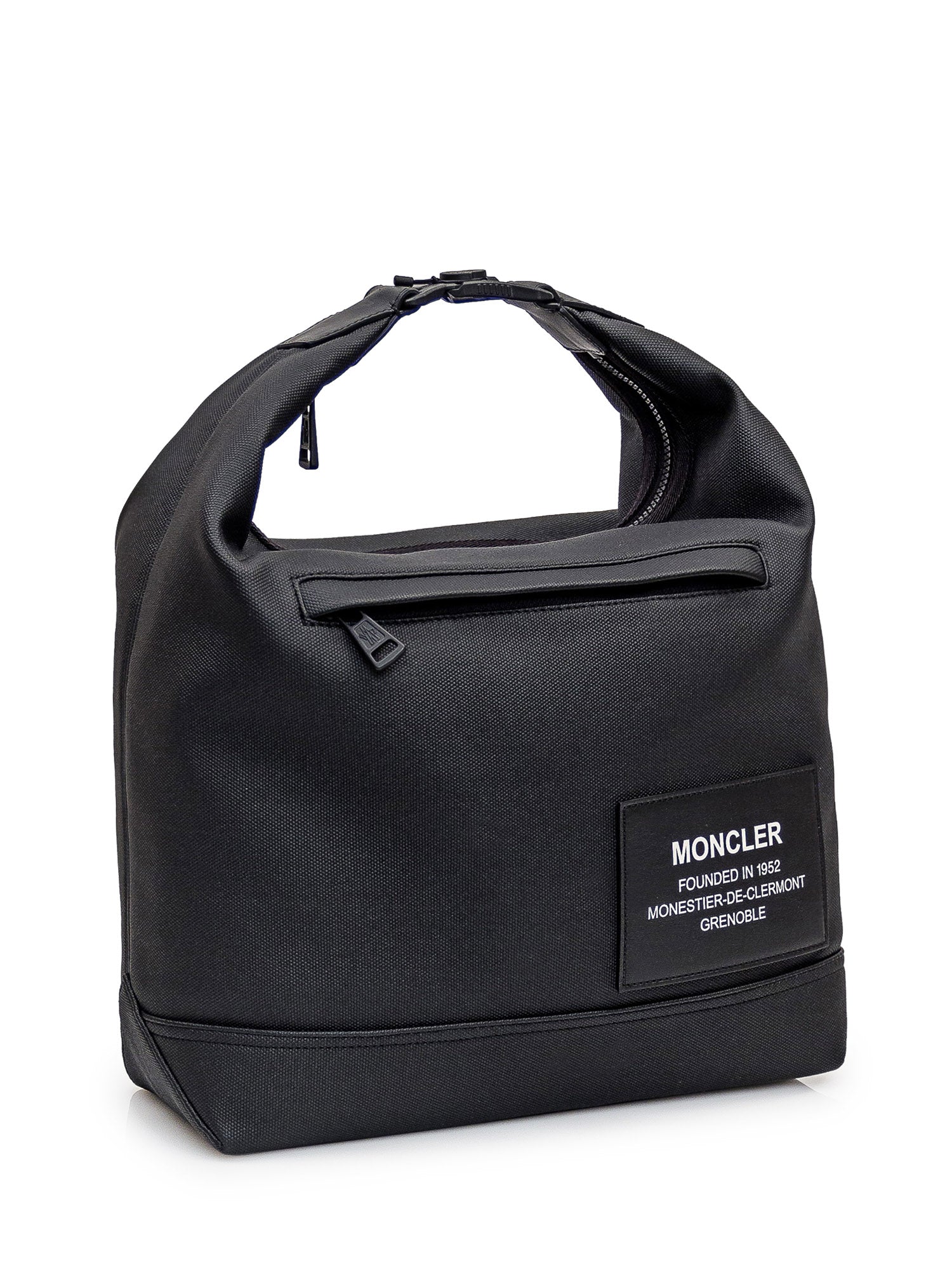 Borsa Tote nera. Un manico con fibbia. Due tasche con zip con due tracolle interne fronte e retro. Tasca interna con zip. Chiusura con zip. Patch Logo in pelle sul davanti.