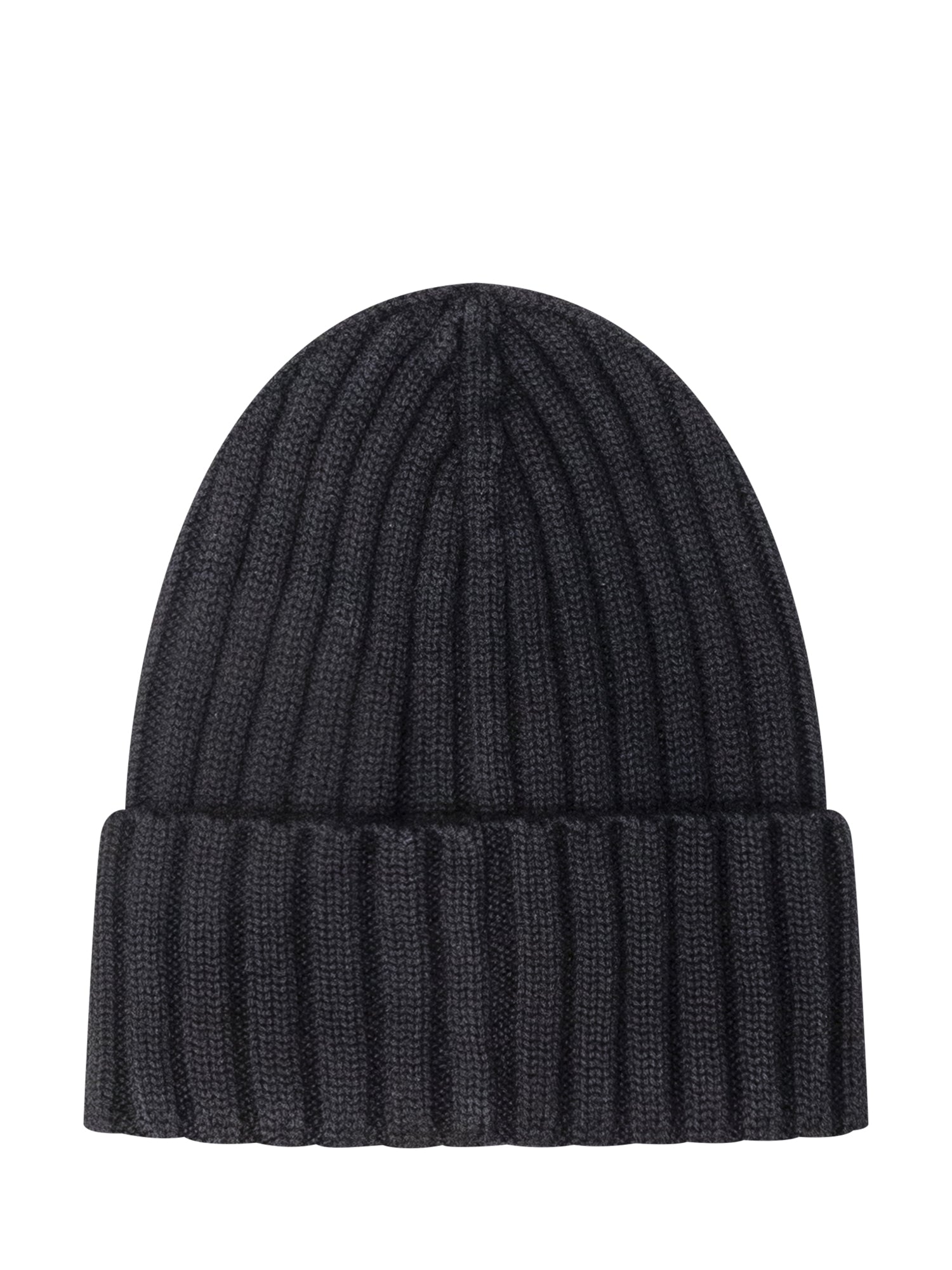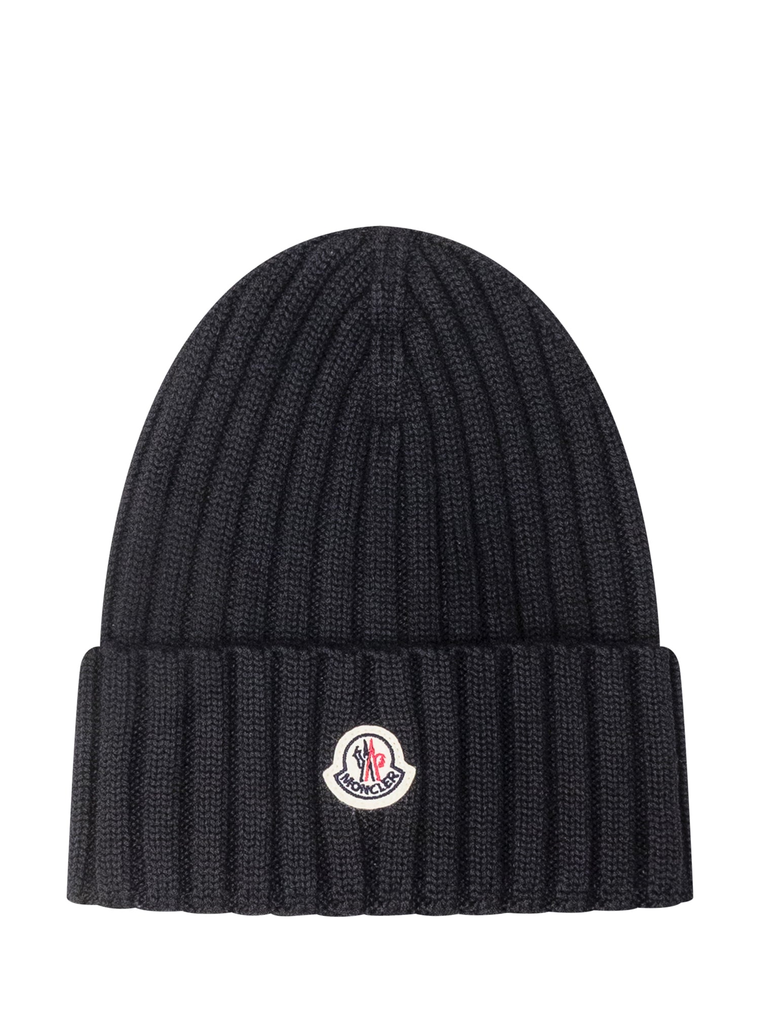 Cappello Moncler in maglia a coste nera con classico logo ricamato sul fronte.