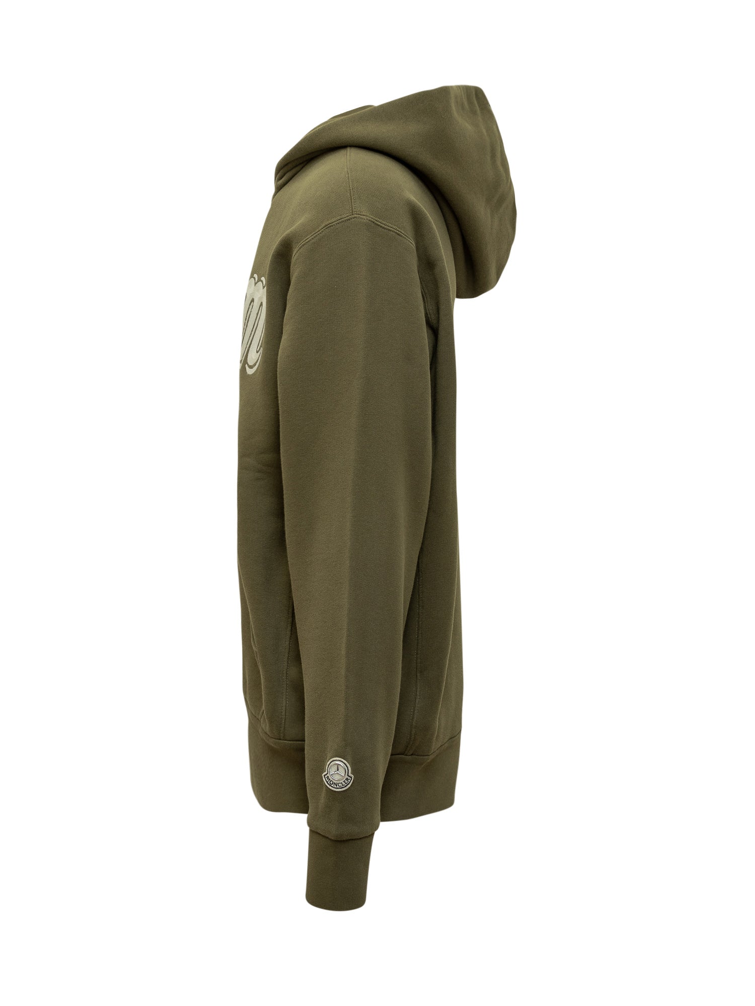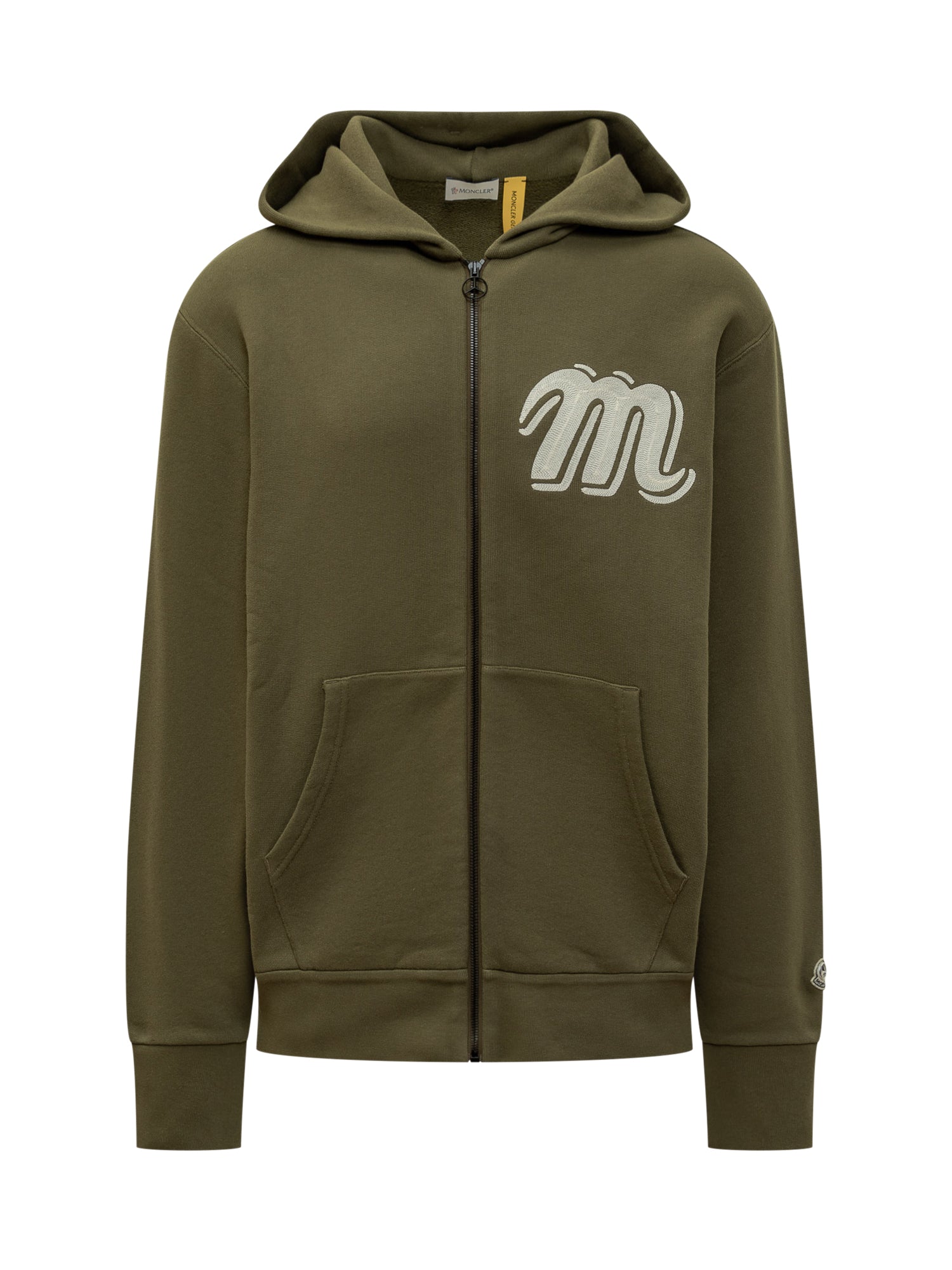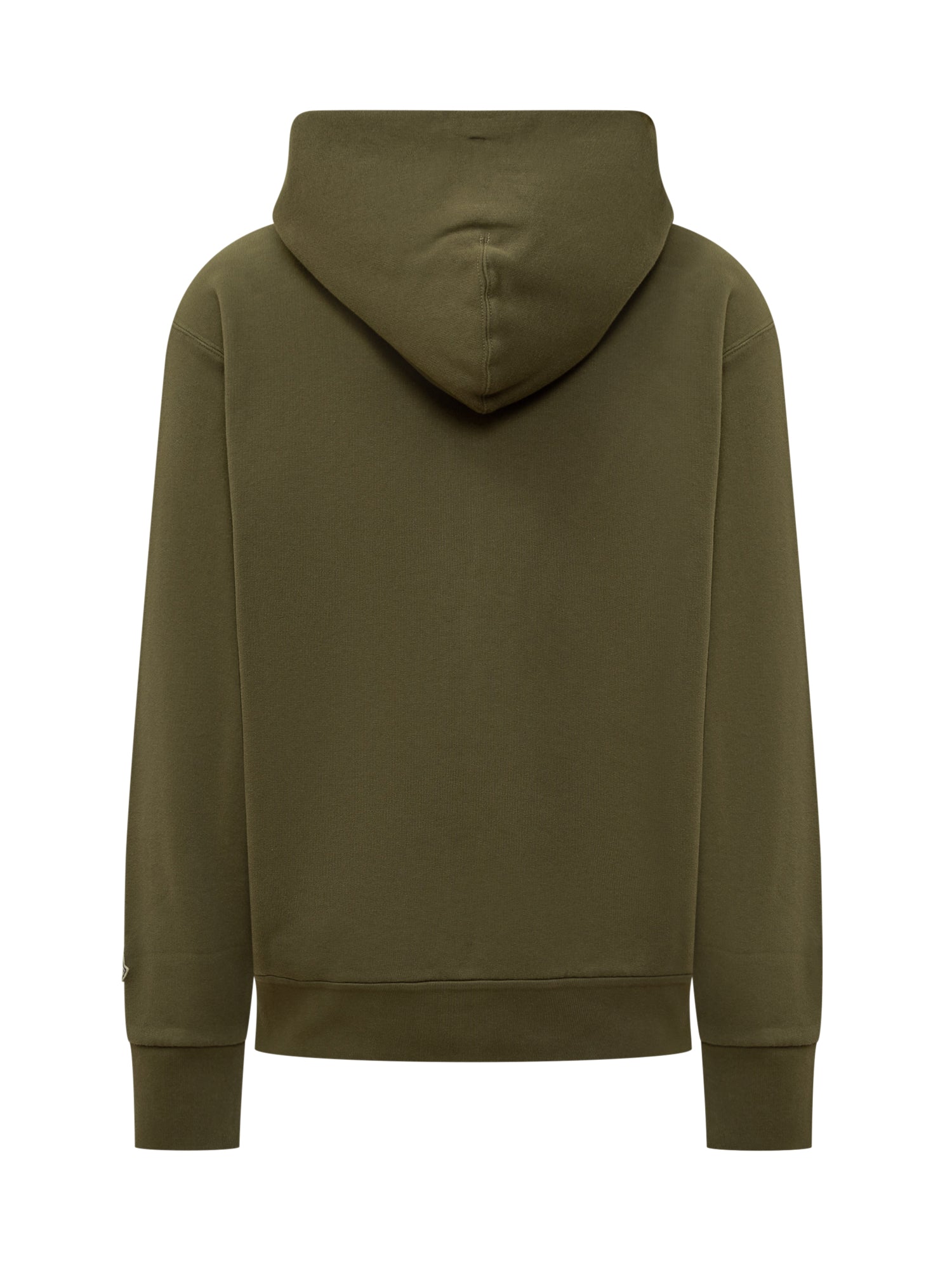 Felpa verde con cappuccio. Due tasche frontali. Stampa frontale. Logo applicato. Chiusura con zip.