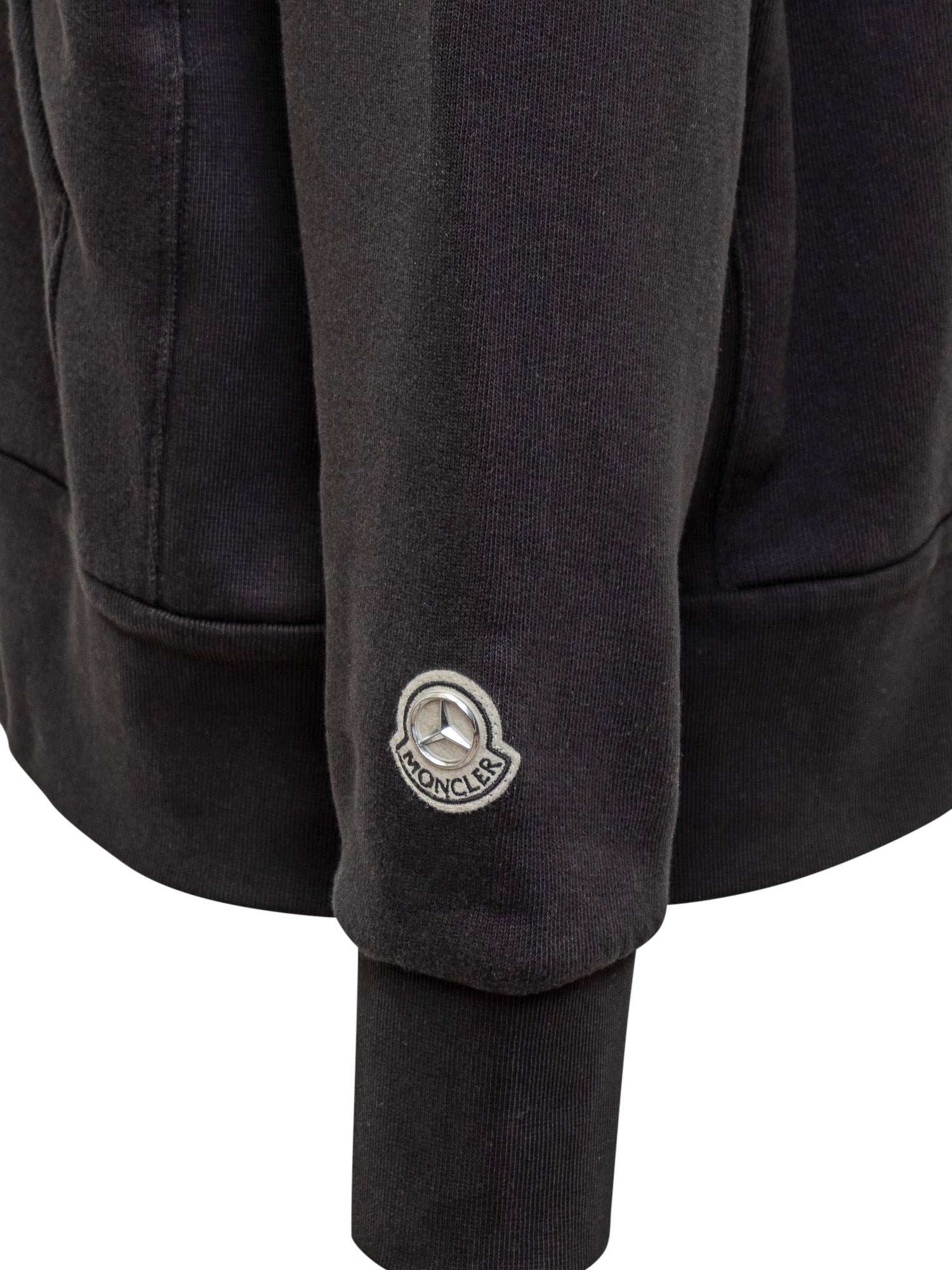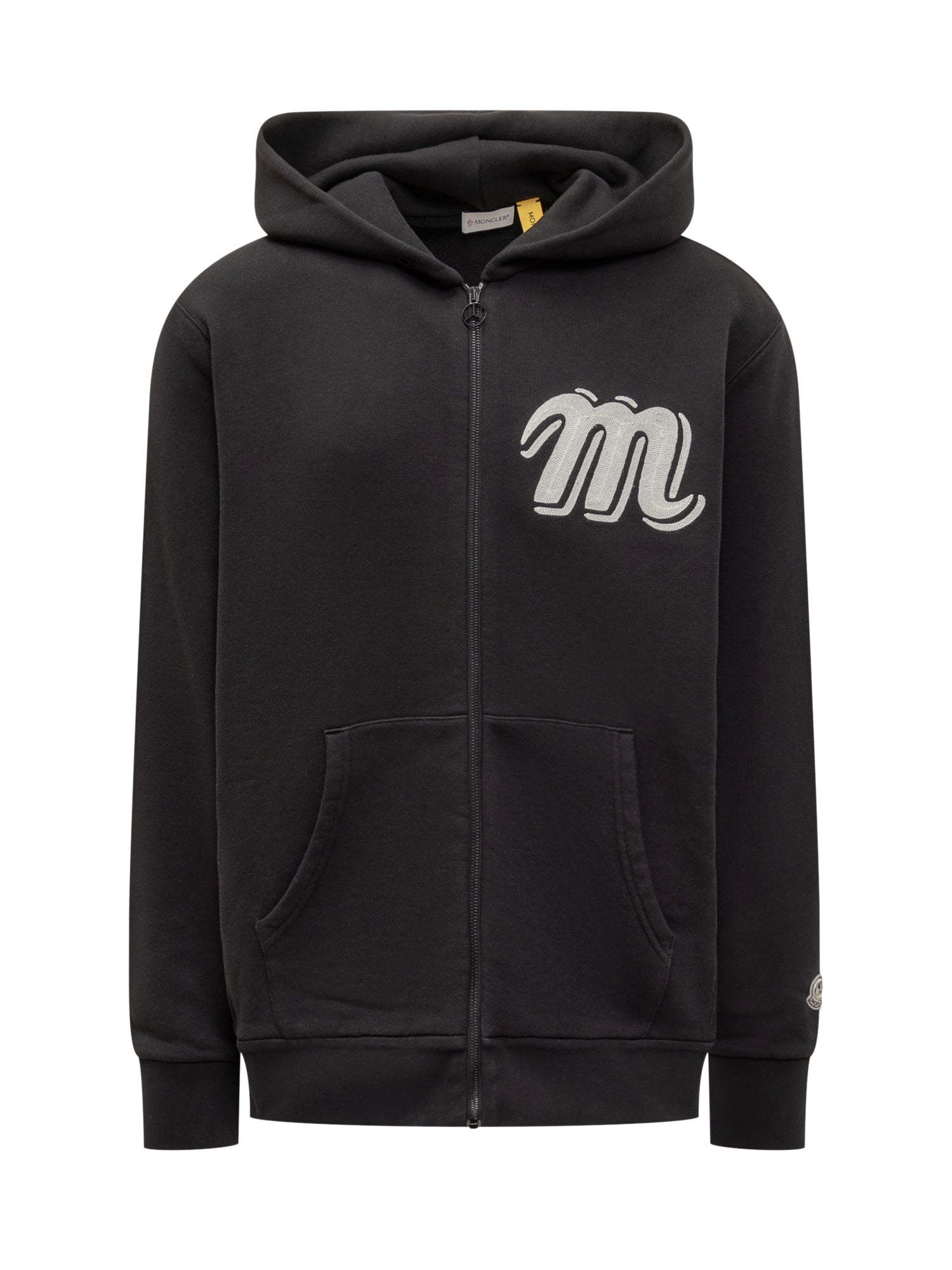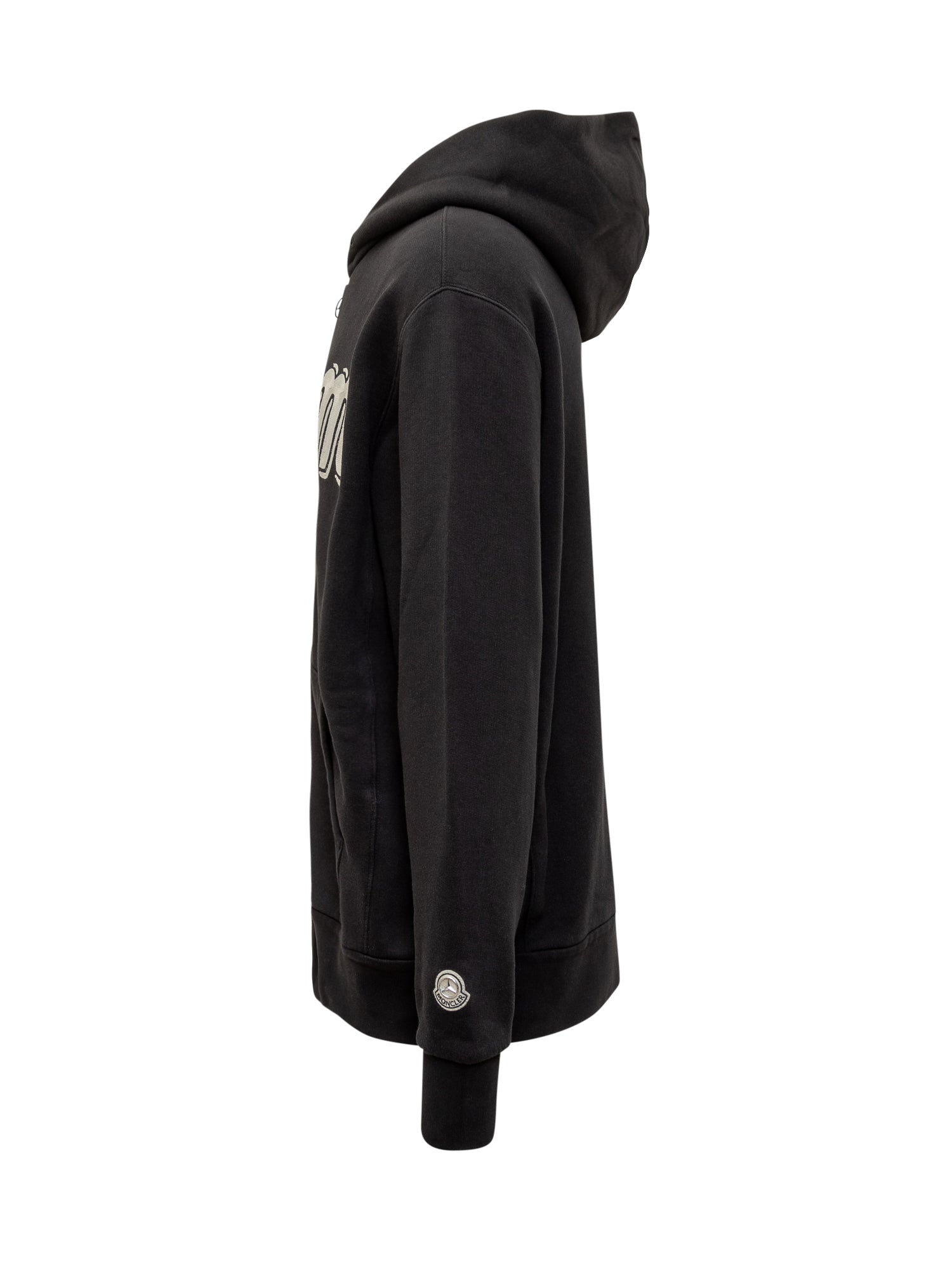 Felpa nera con cappuccio. Due tasche frontali. Stampa frontale. Logo applicato. Chiusura con zip.
