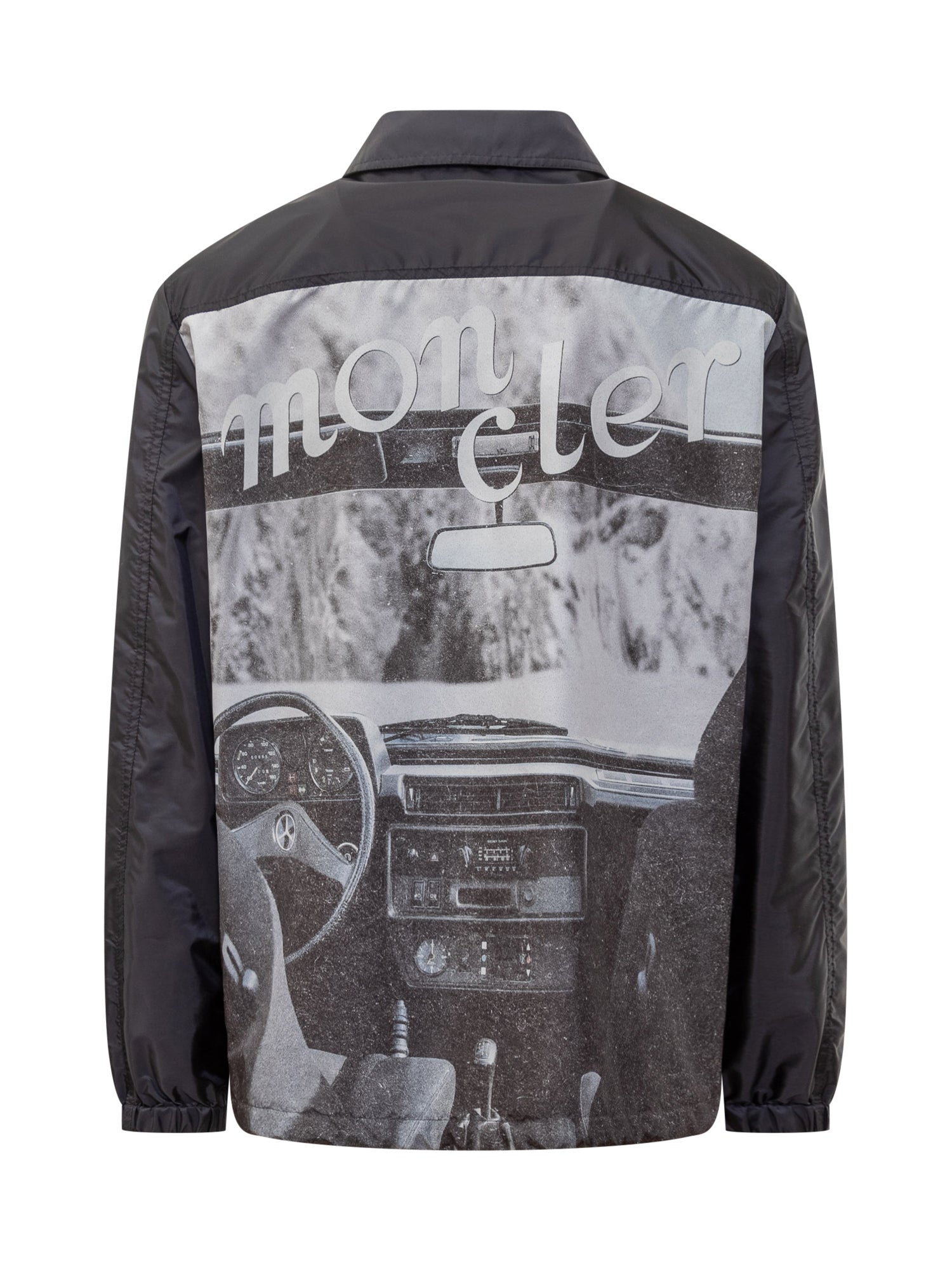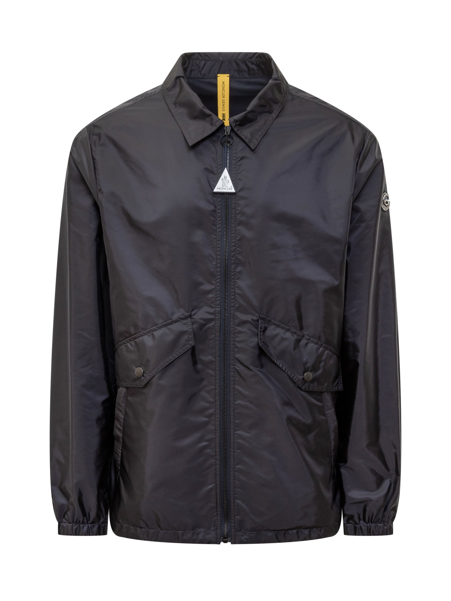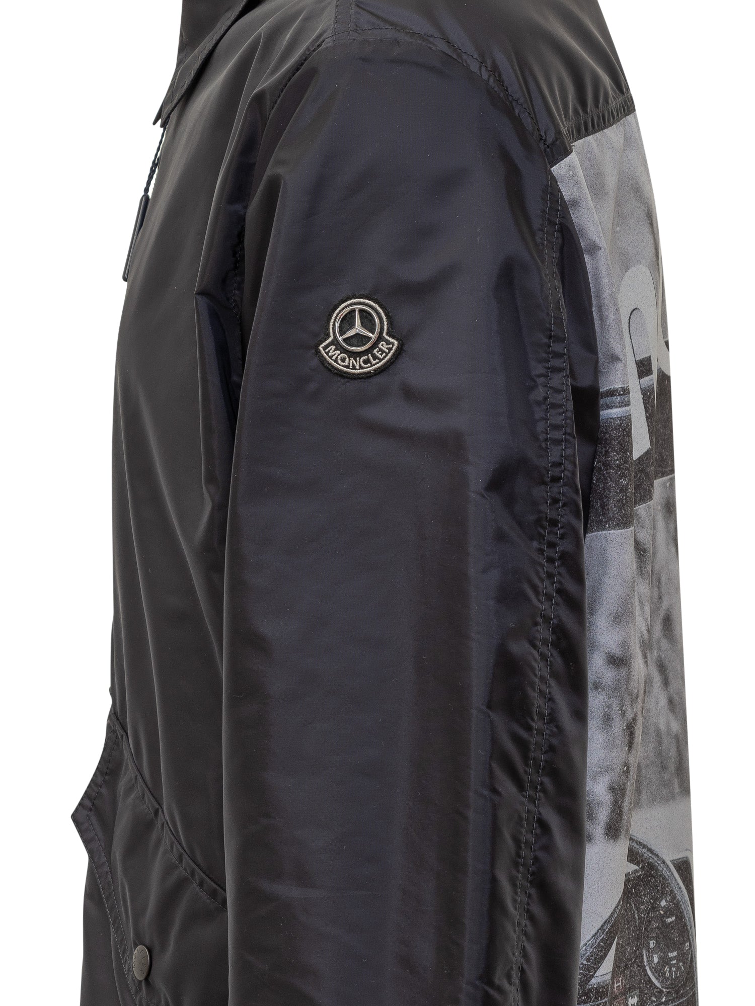 Giacca blu. Colletto classico. Due tasche con patta e bottone. Due tasche laterali. Stampa sul retro. Chiusura con zip logata Mercedes. Logo applicato su manica.
