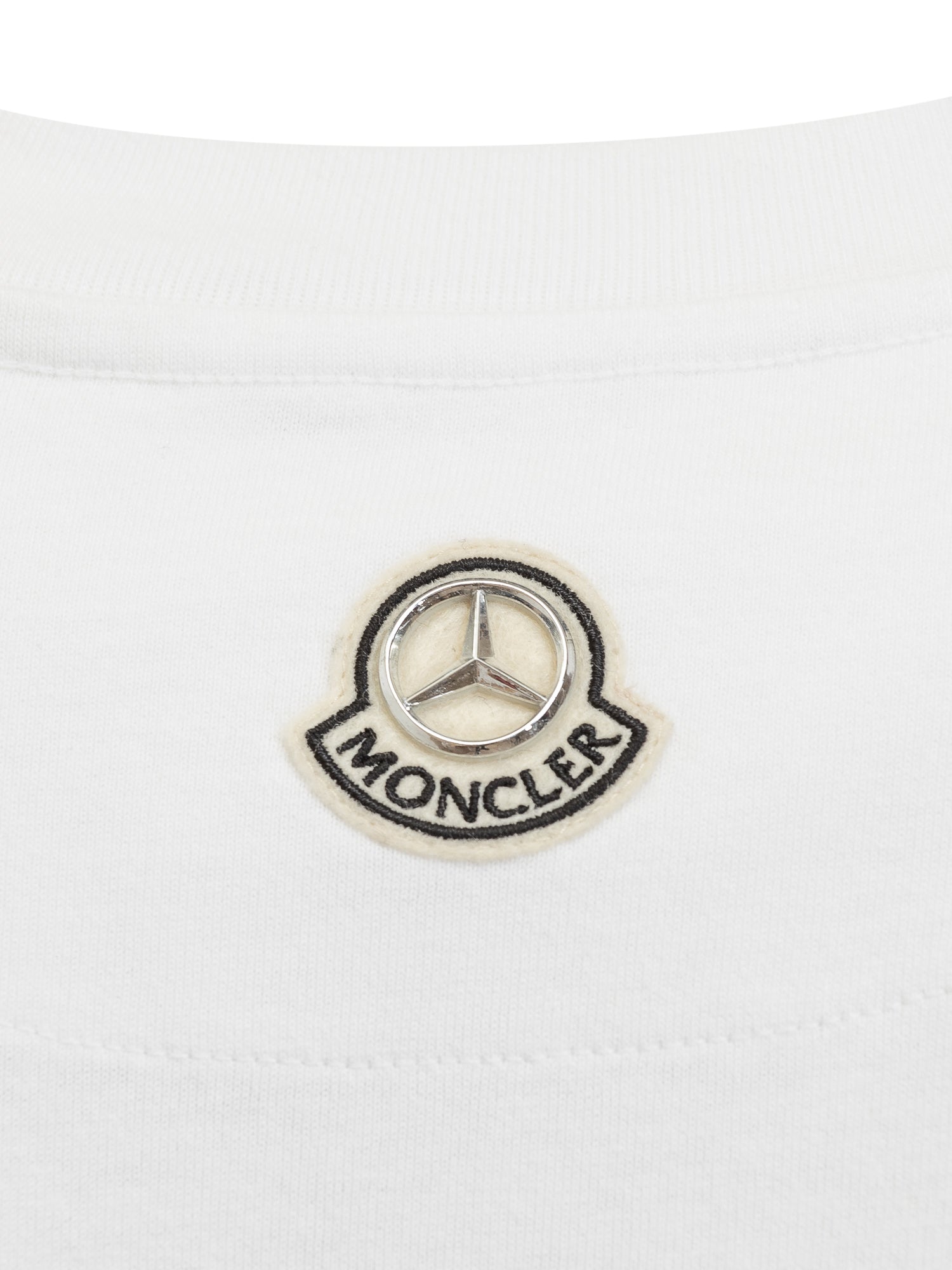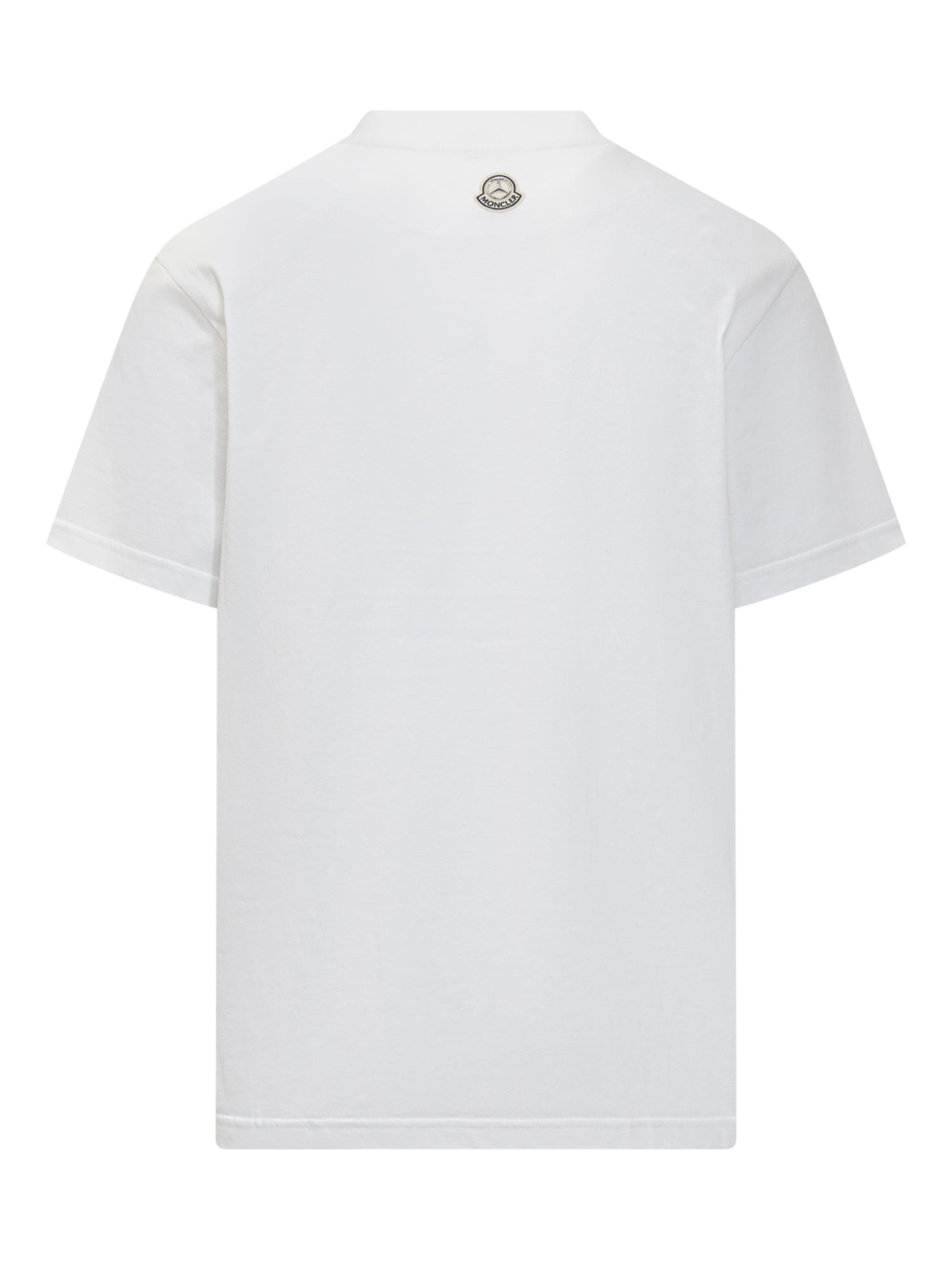 T-shirt bianca girocollo. Stampa frontale. Logo applicato sul retro.