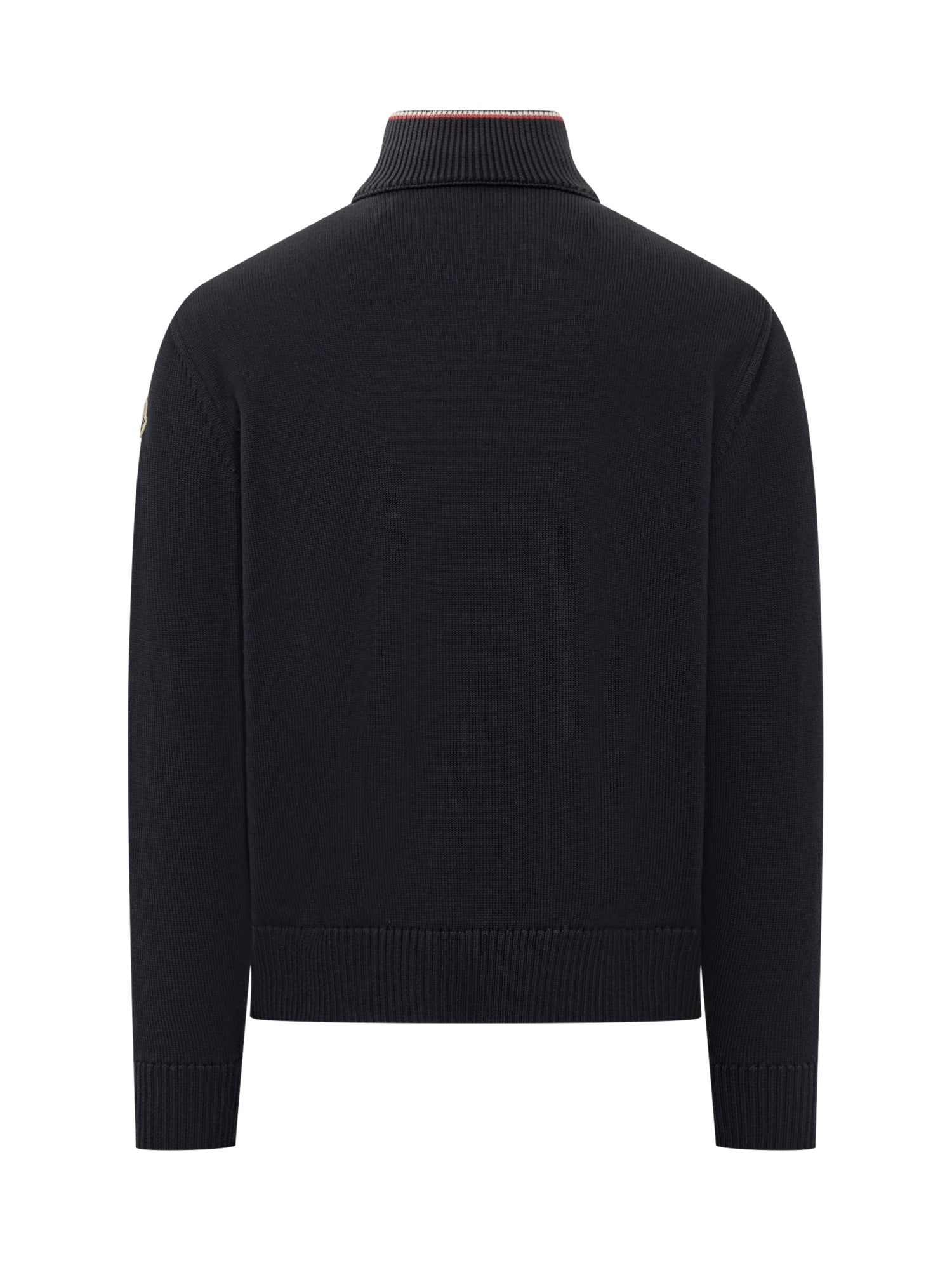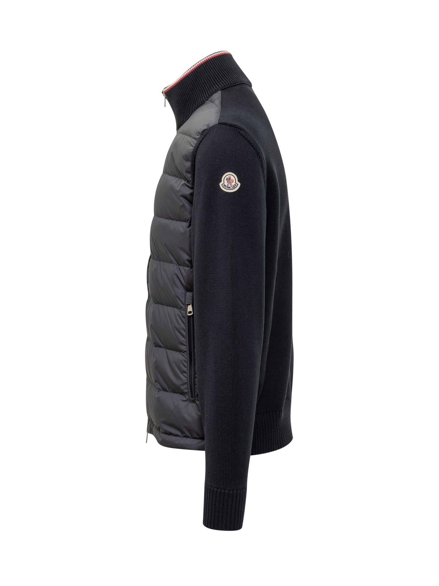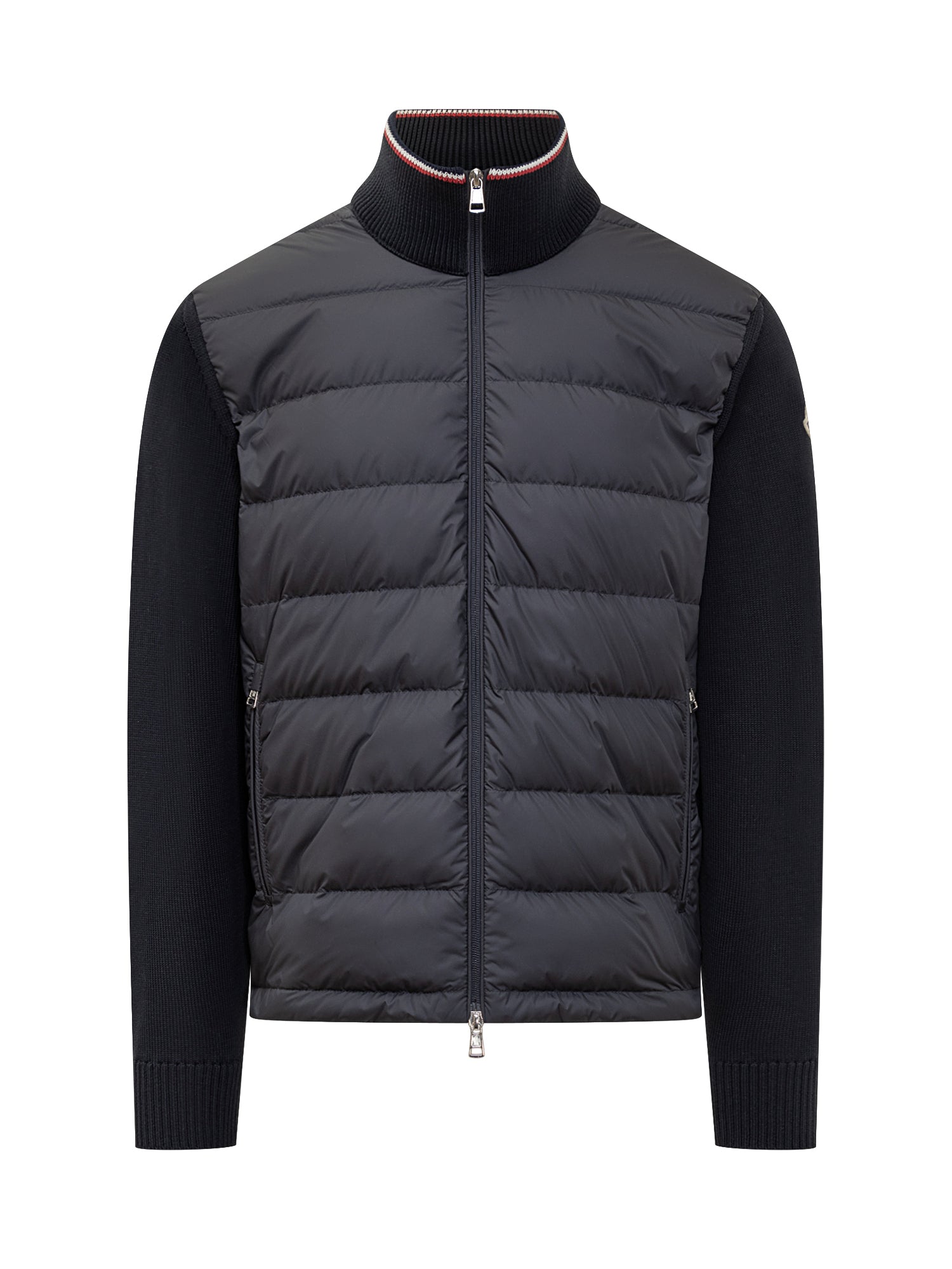 Cardigan Moncler da uomo con parte frontale imbottita in piuma e maniche in maglia. Design elegante e sportivo con collo a costine tricolore.