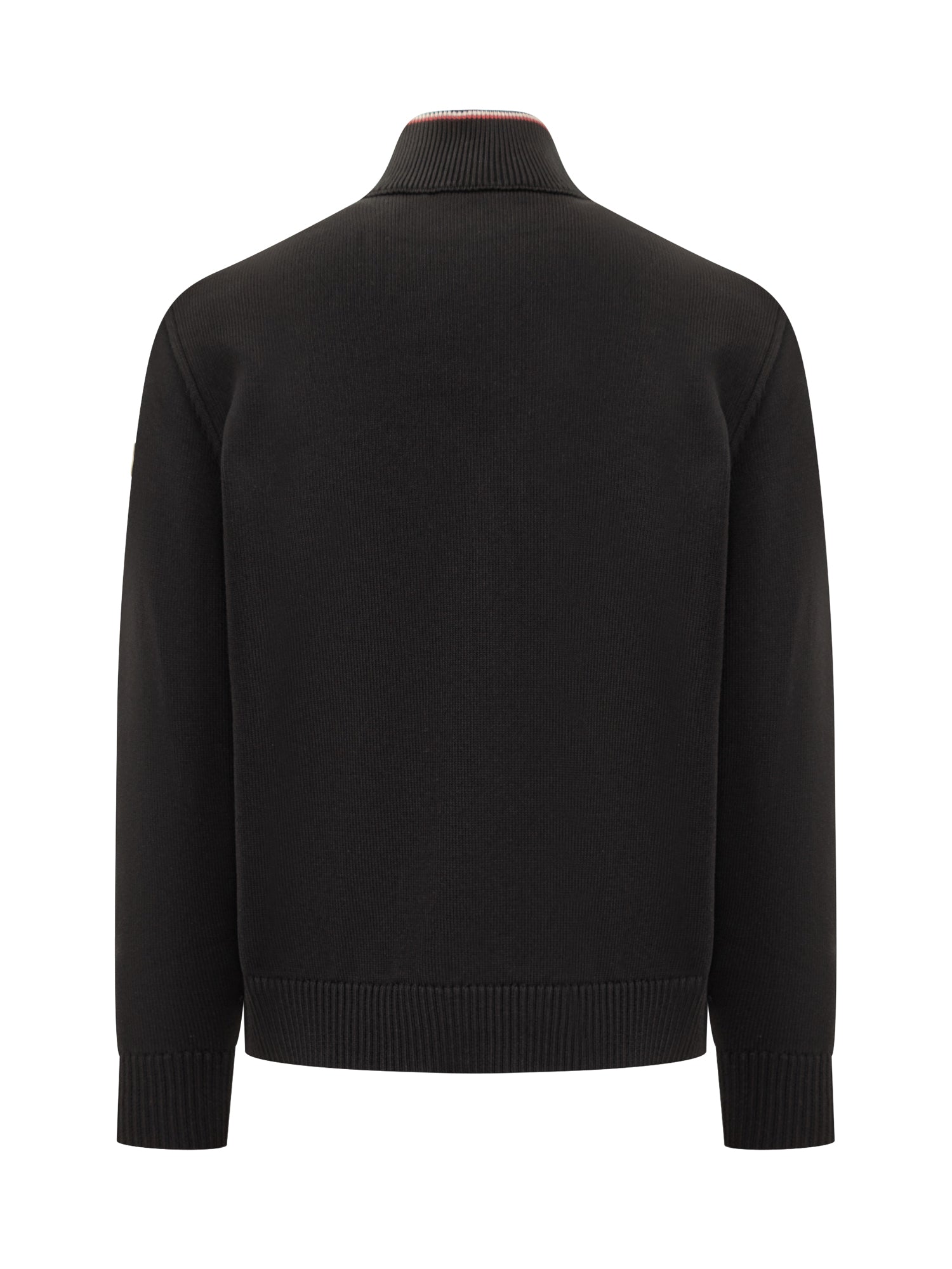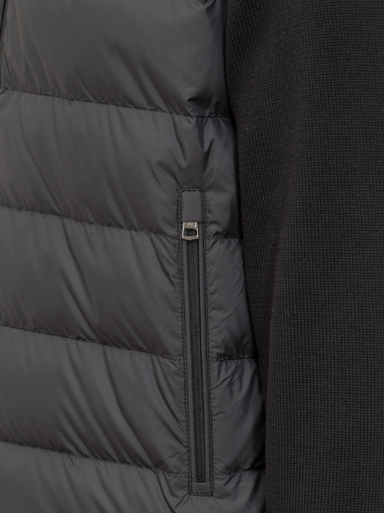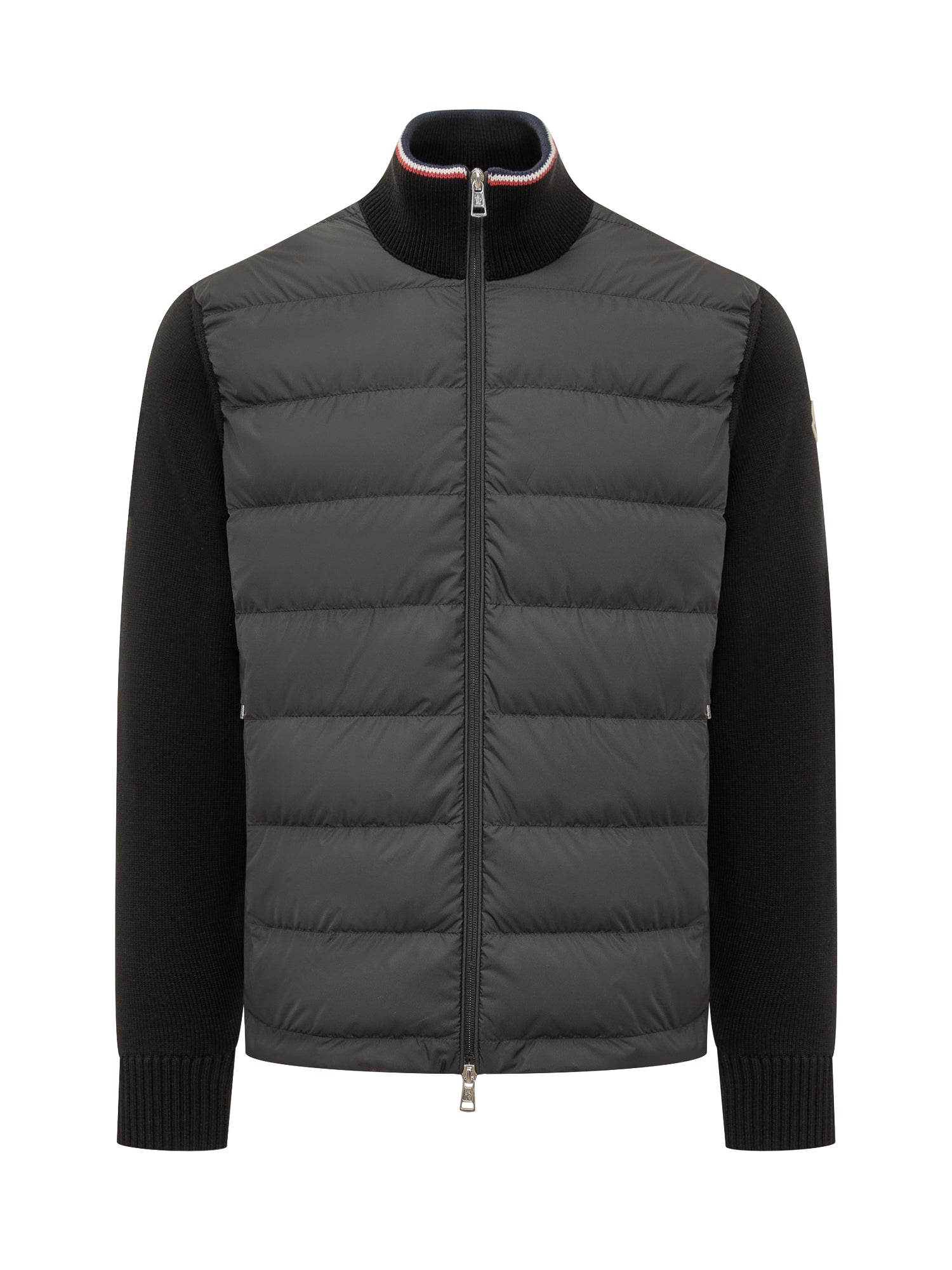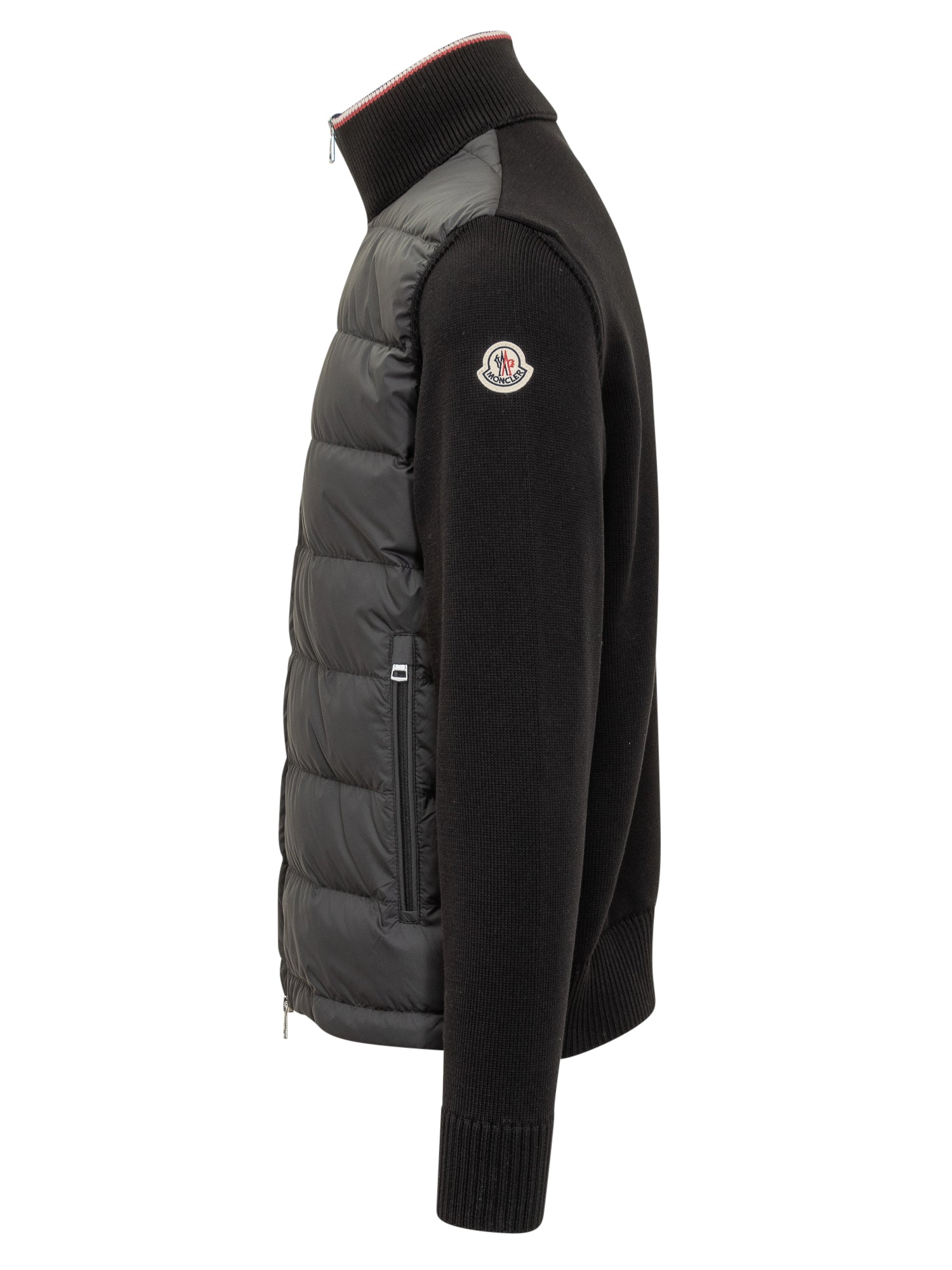 Cardigan Moncler in maglia con parte frontale imbottita in nylon. Maniche in lana, zip a doppio cursore e collo alto con dettaglio tricolore.