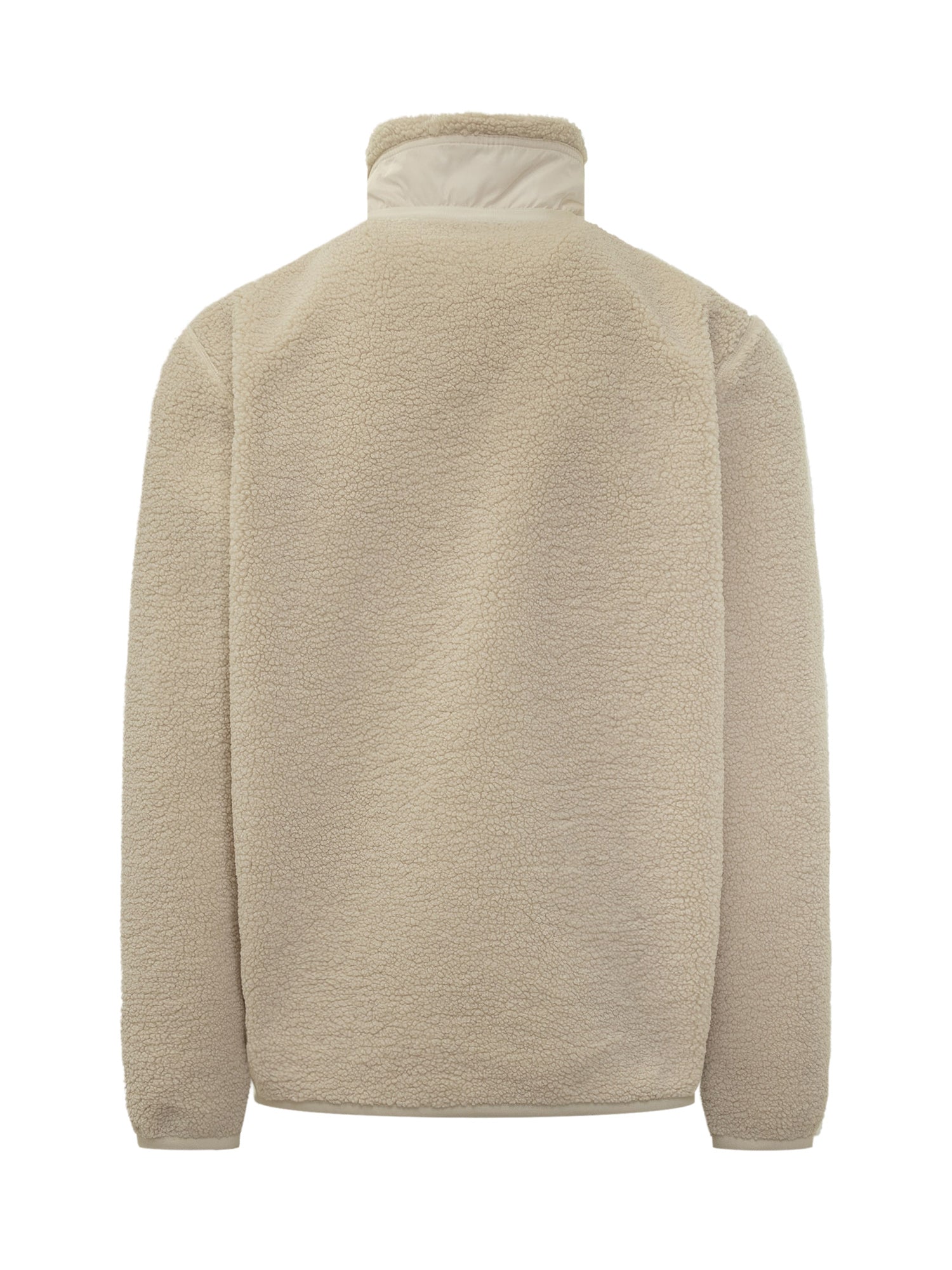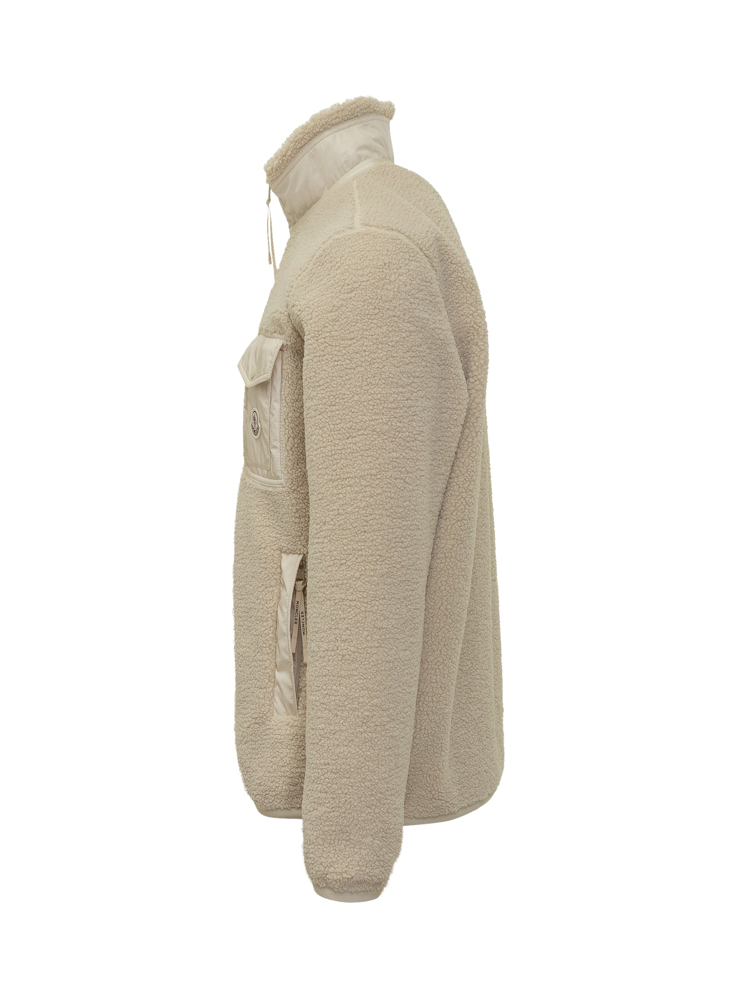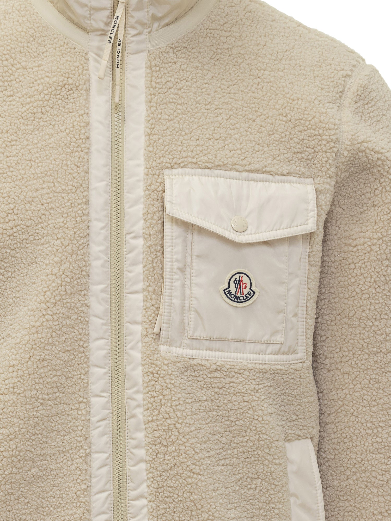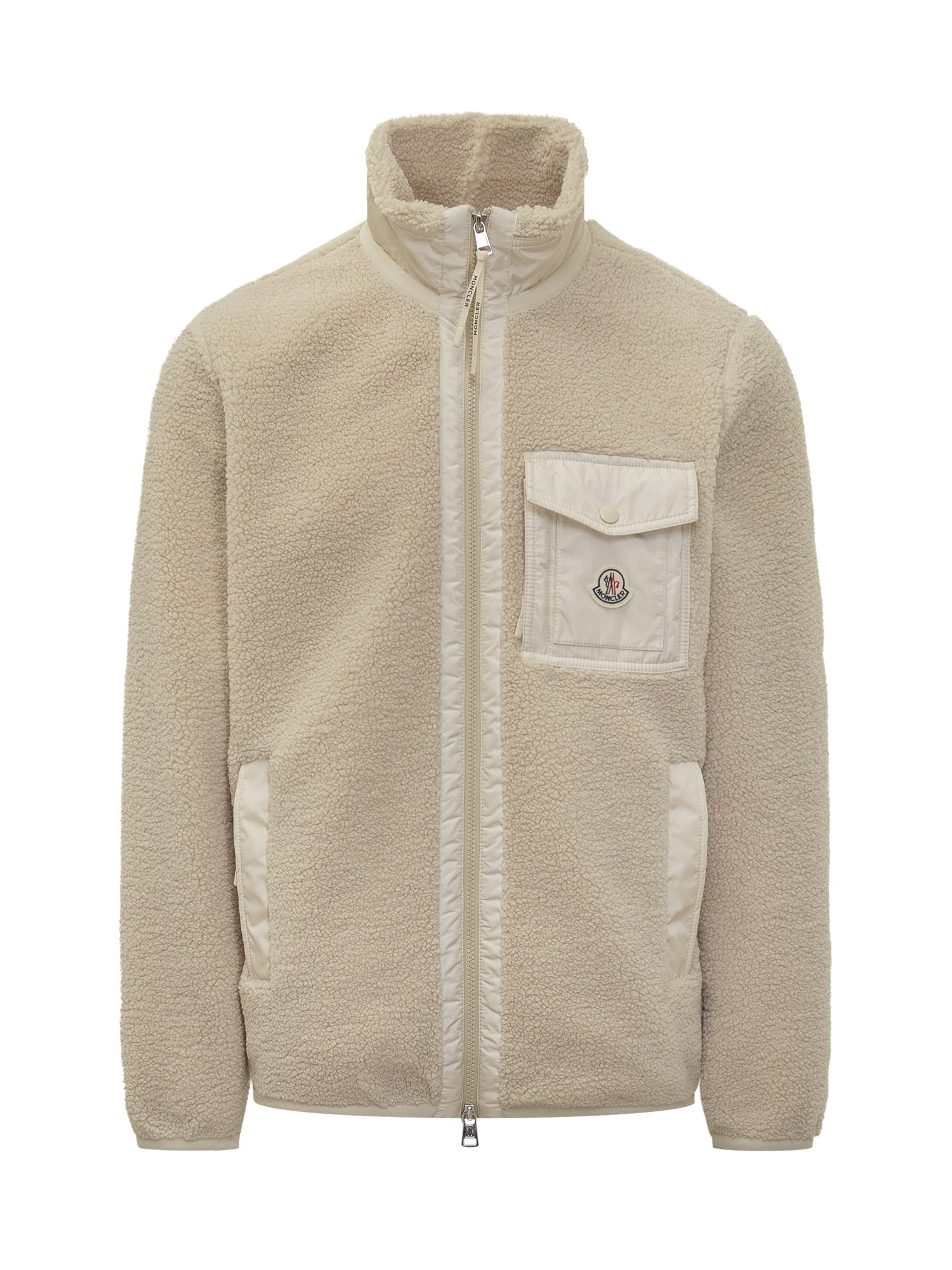Cardigan Moncler in pile beige con chiusura a zip, tasche laterali e taschino sul petto con logo.